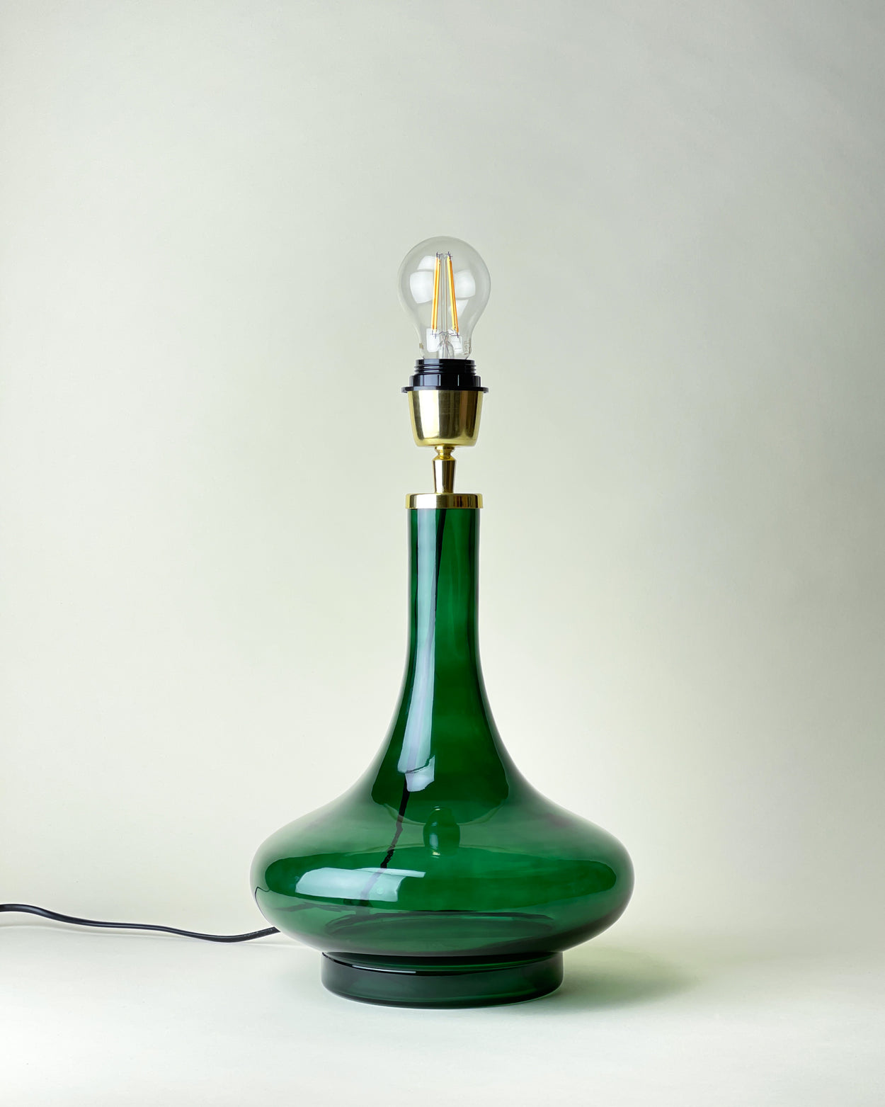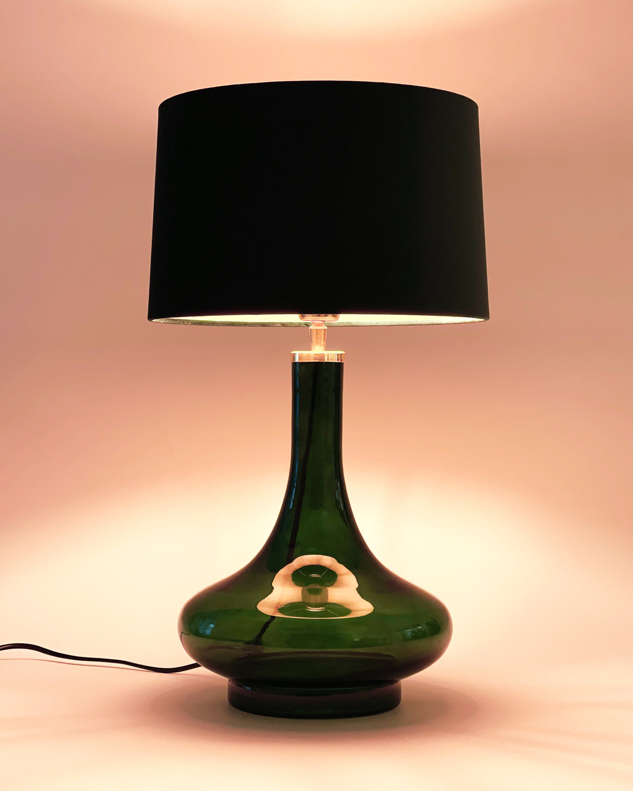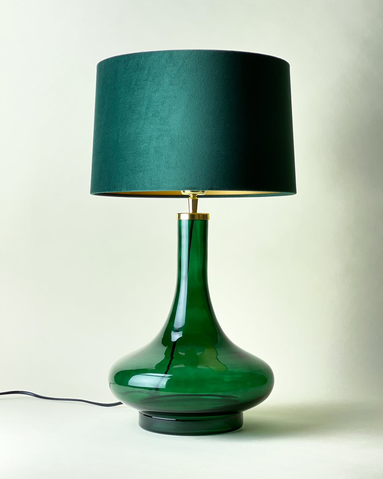 A Modern Classic Table Lamp with flowing Curved glass base. Adorned at the top with a green velvet lampshade. The Curved fuses a blend of evocative contemporary style with refined and timeless design.