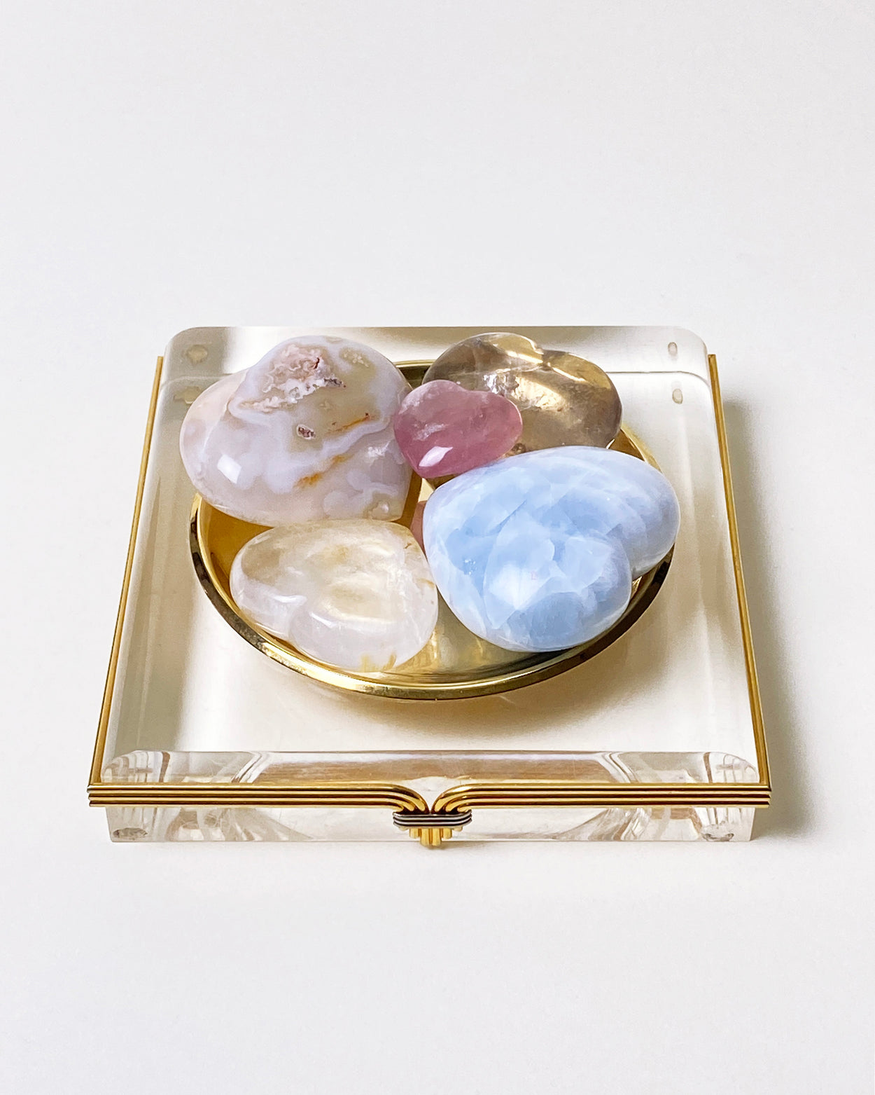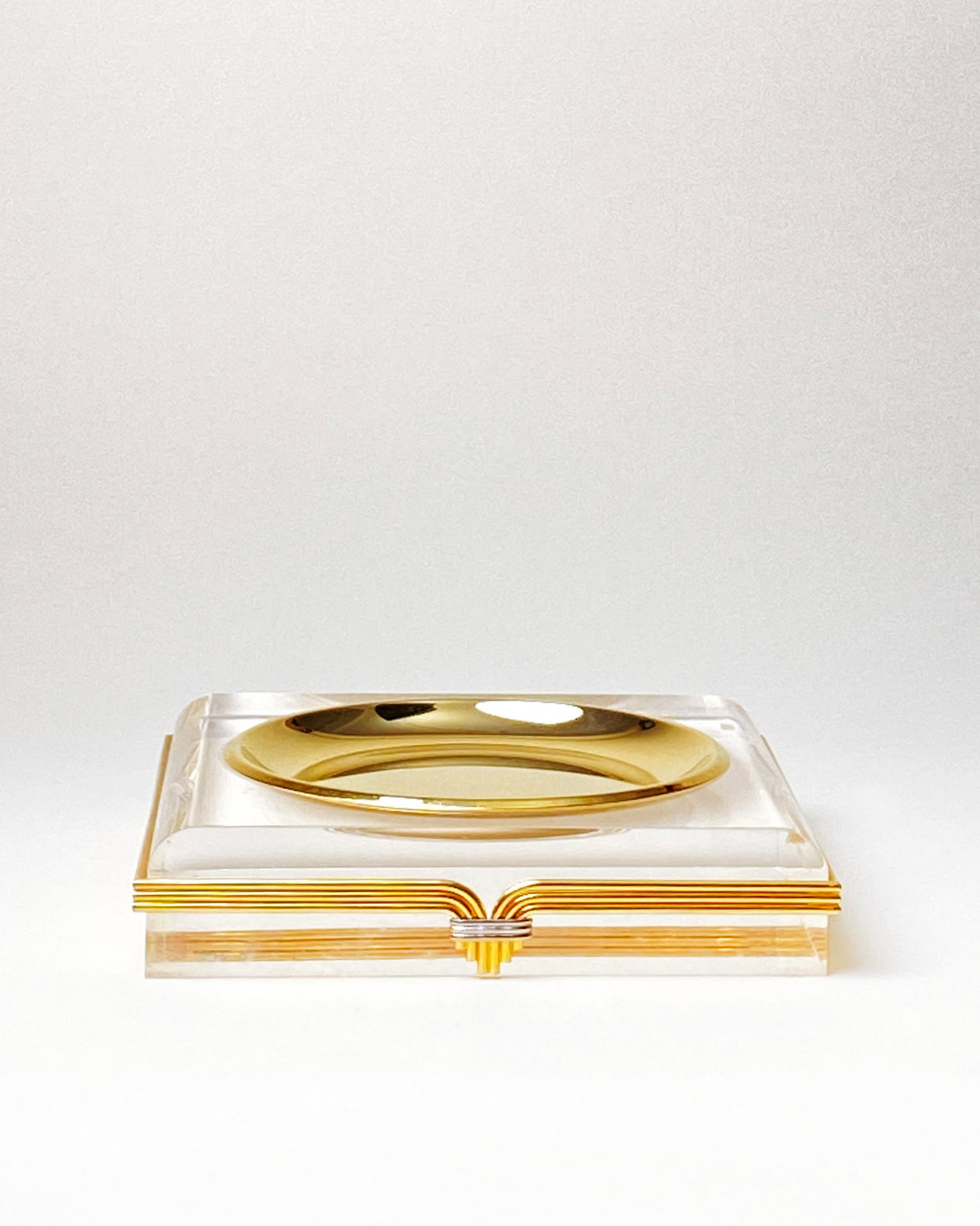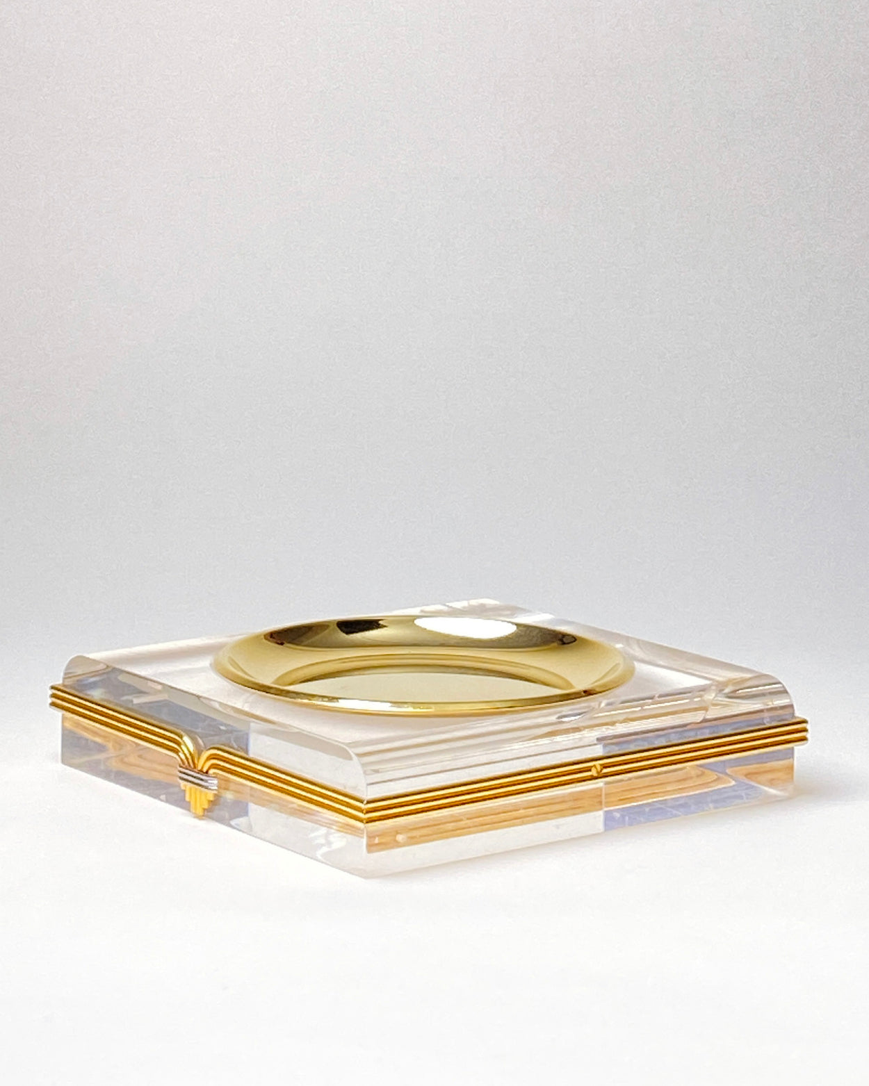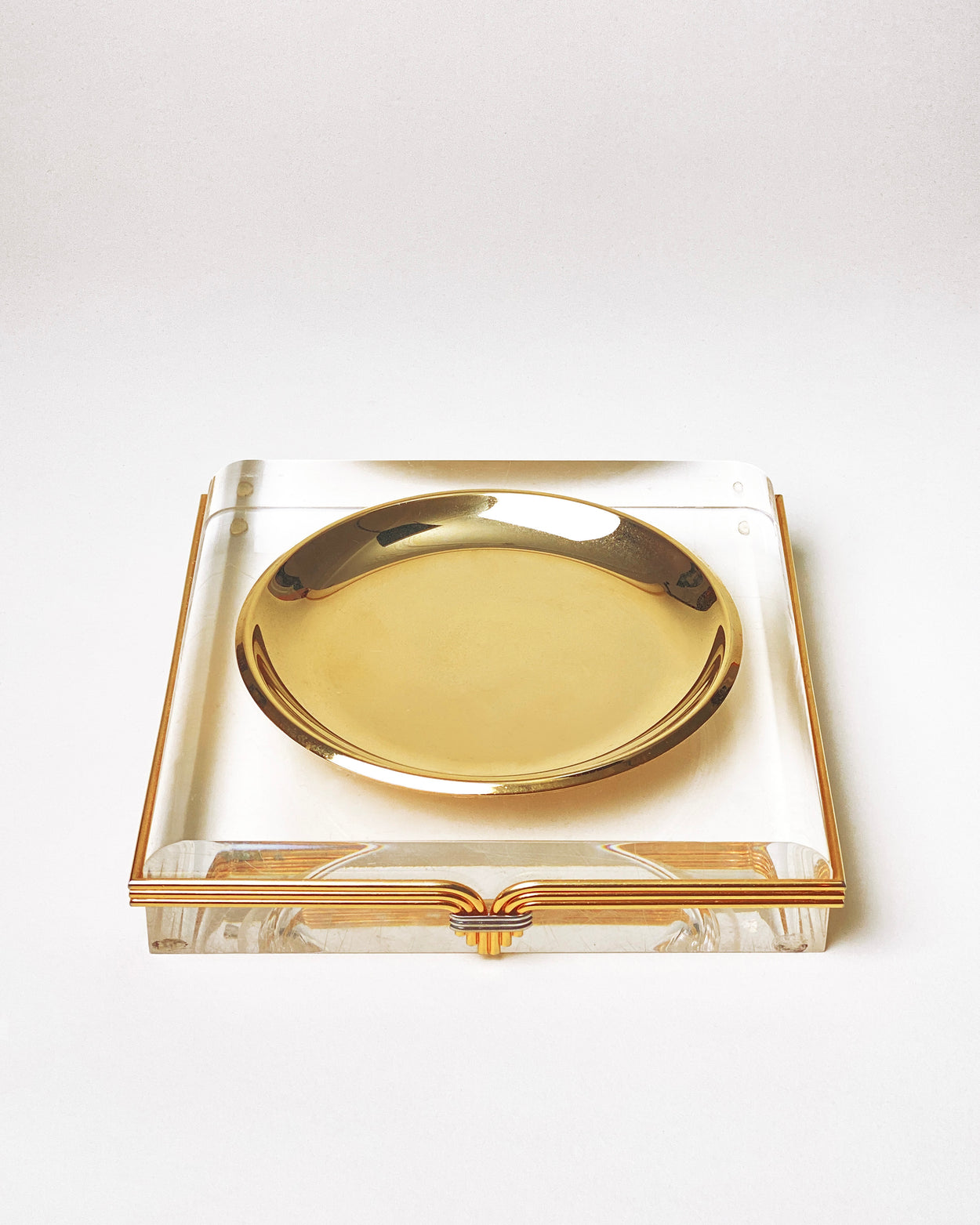 Hollywood Regency Style design table piece in transparent perspex (lucite) and gold coloured metal.