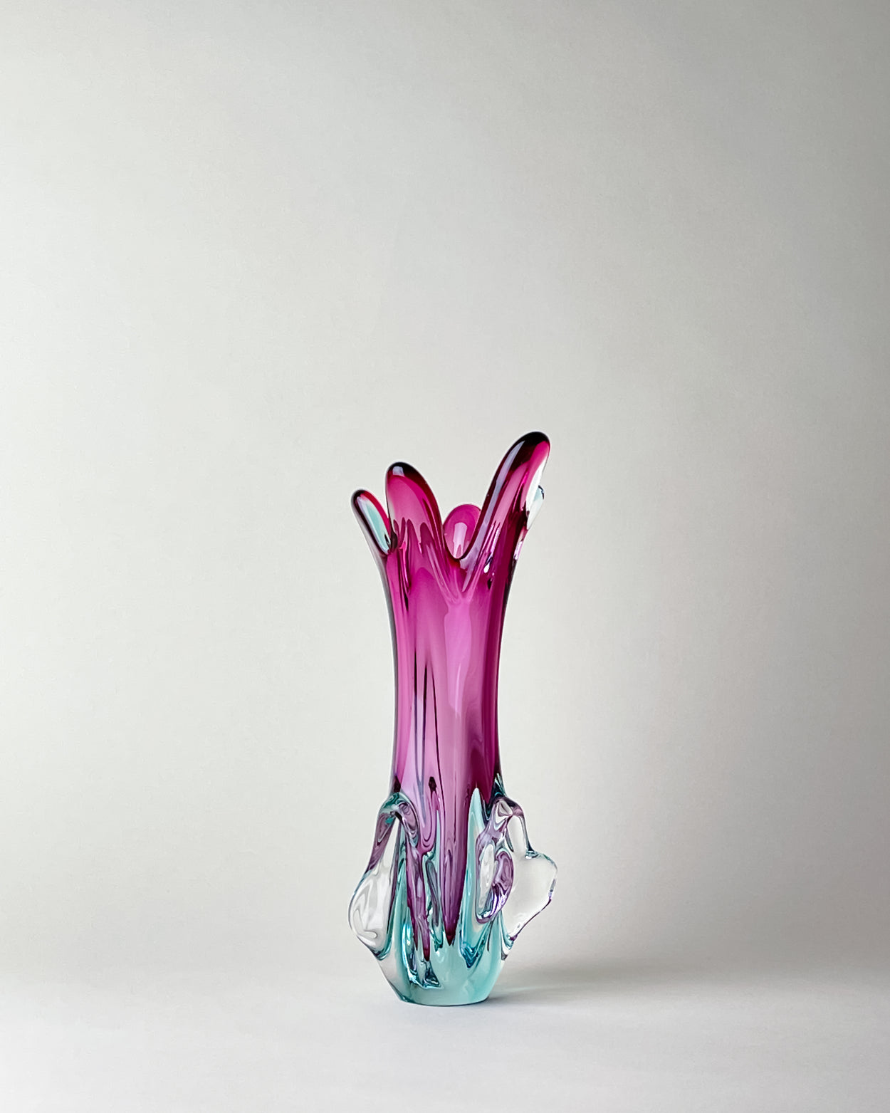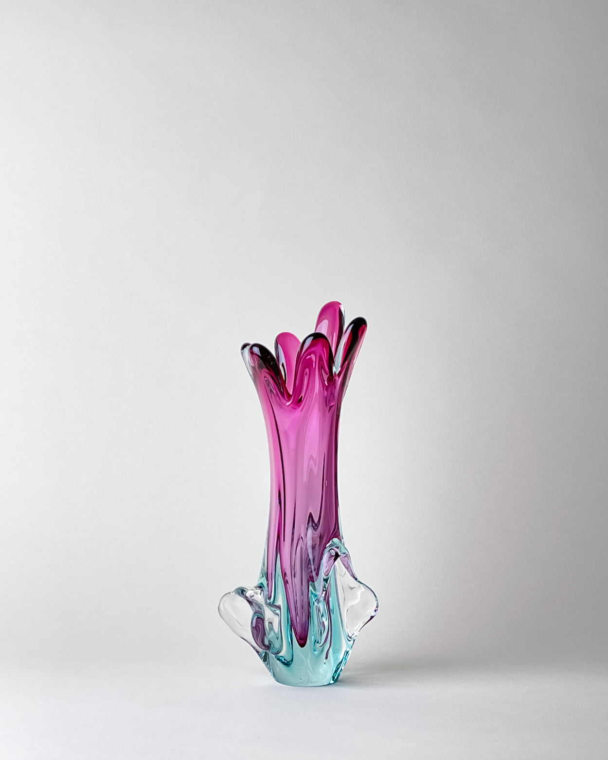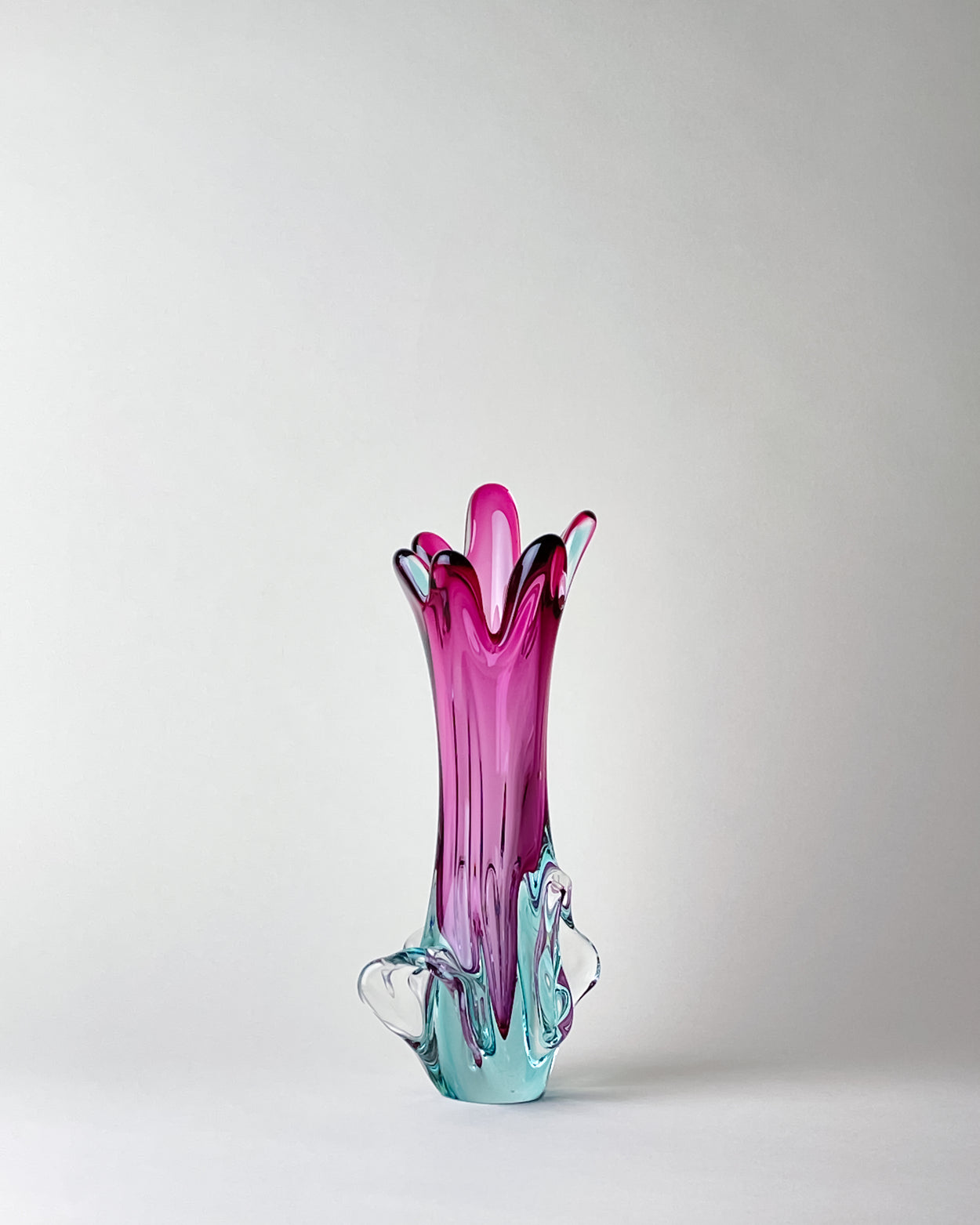 This original Murano glass vase is produced in the 70s in Italy. The diversified base made of clear and aqua coloured glass merges smoothly to the centre into a bright purple/magenta colour. Wonderful piece to brighten up your interior.