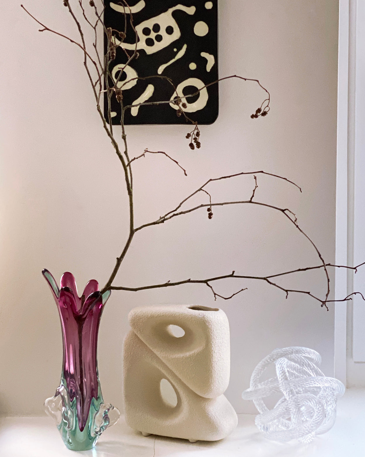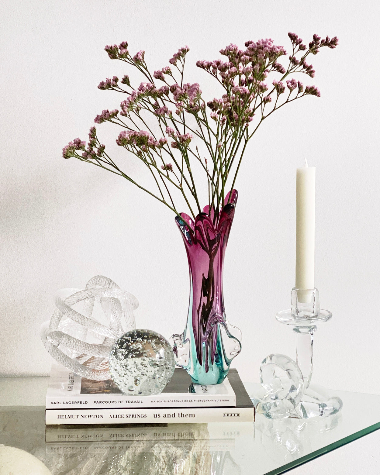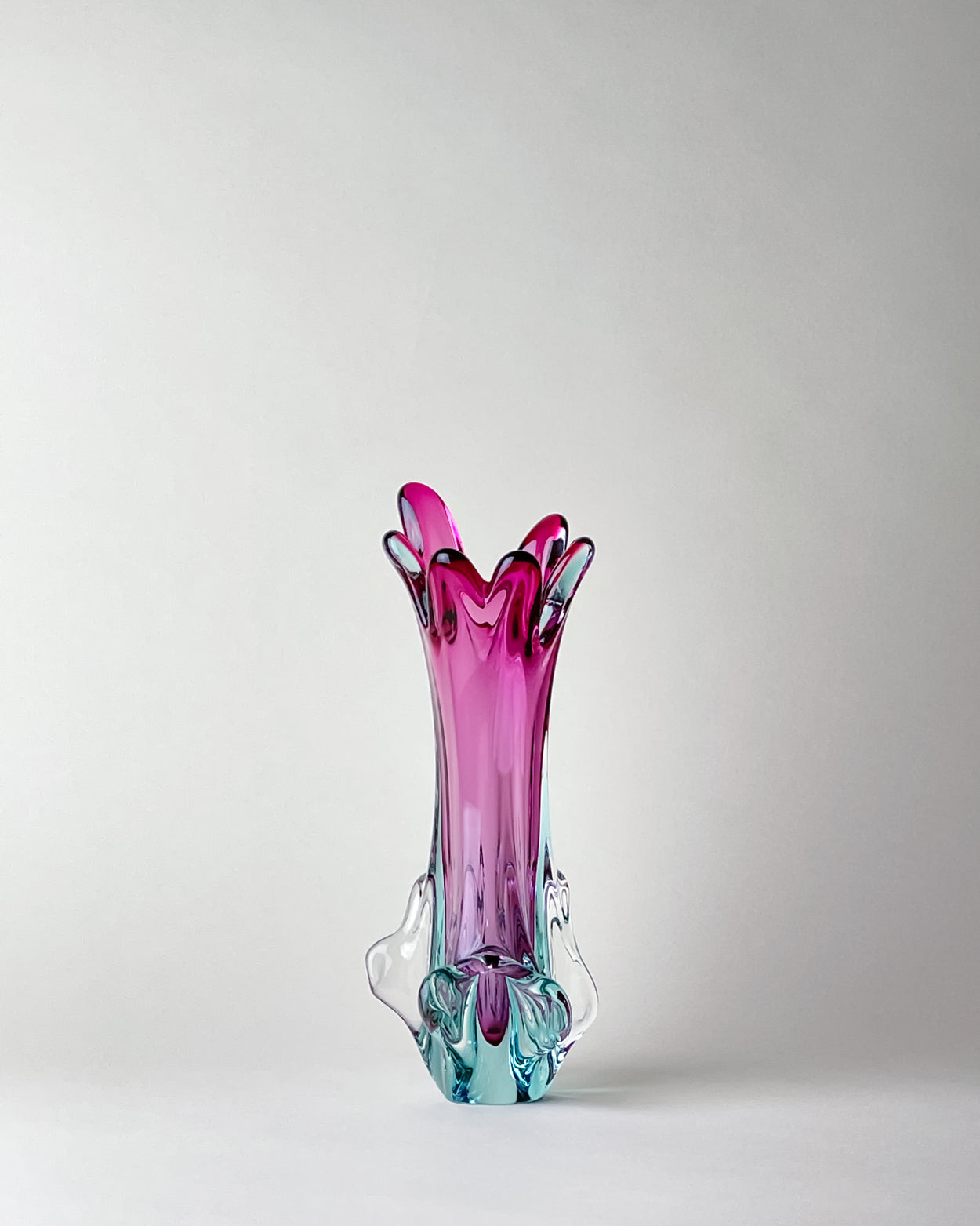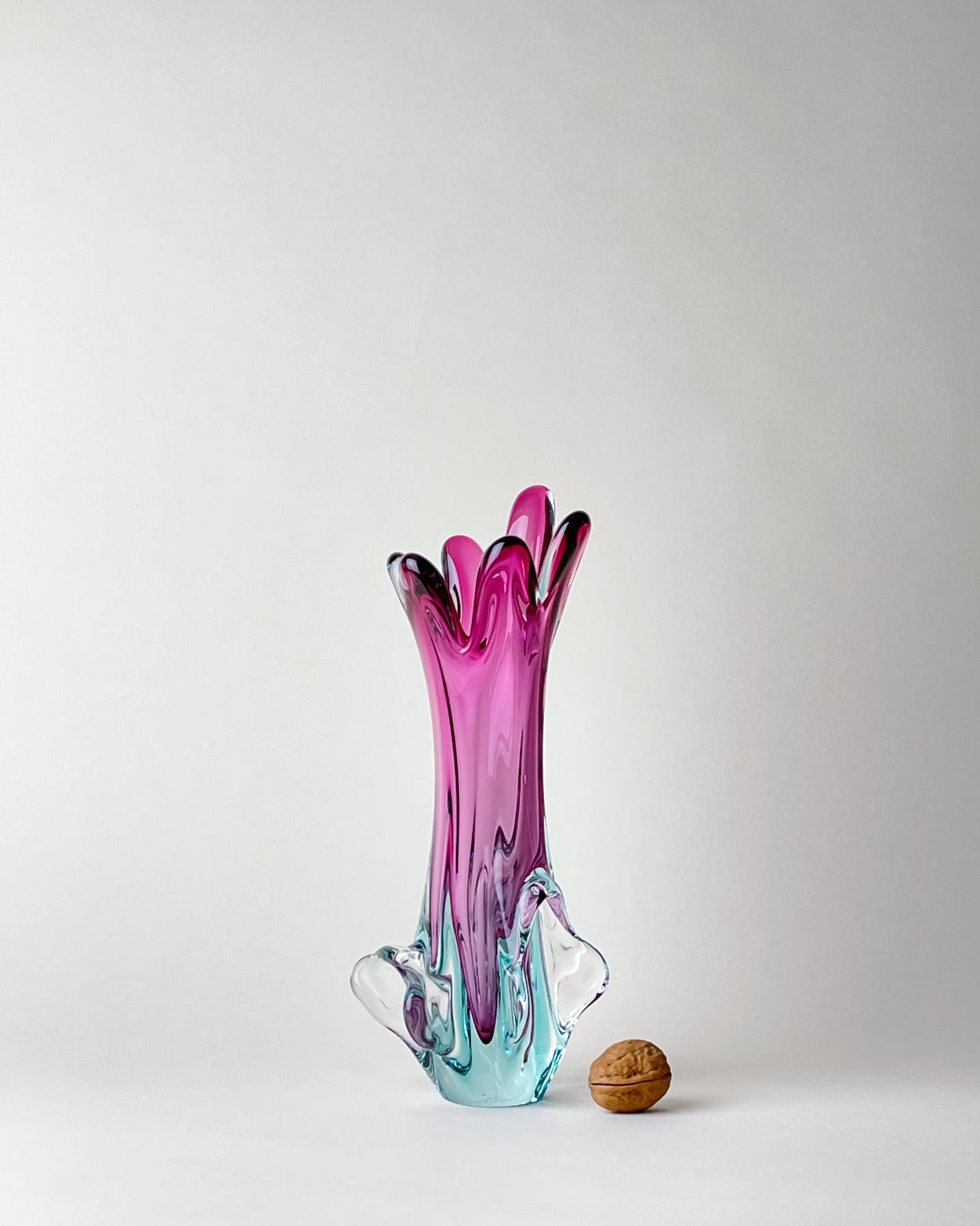 This original Murano glass vase is produced in the 70s in Italy. The diversified base made of clear and aqua coloured glass merges smoothly to the centre into a bright purple/magenta colour. Wonderful piece to brighten up your interior.