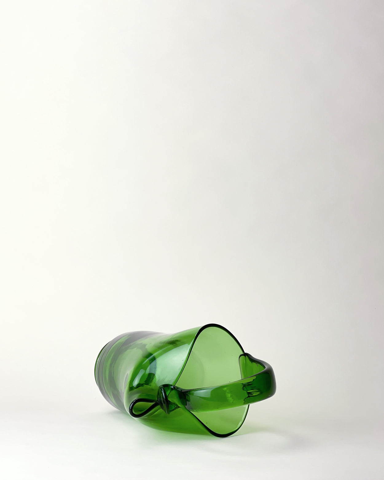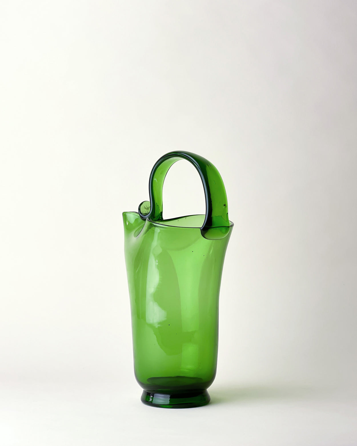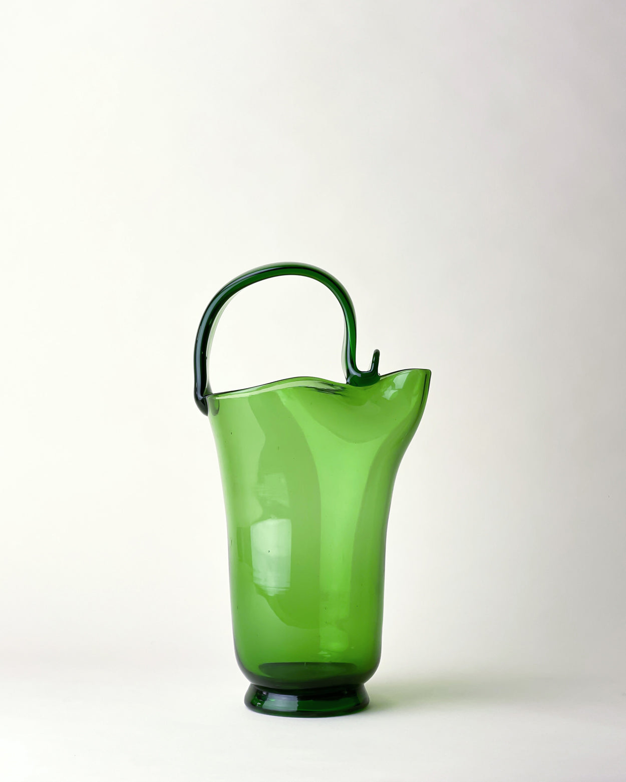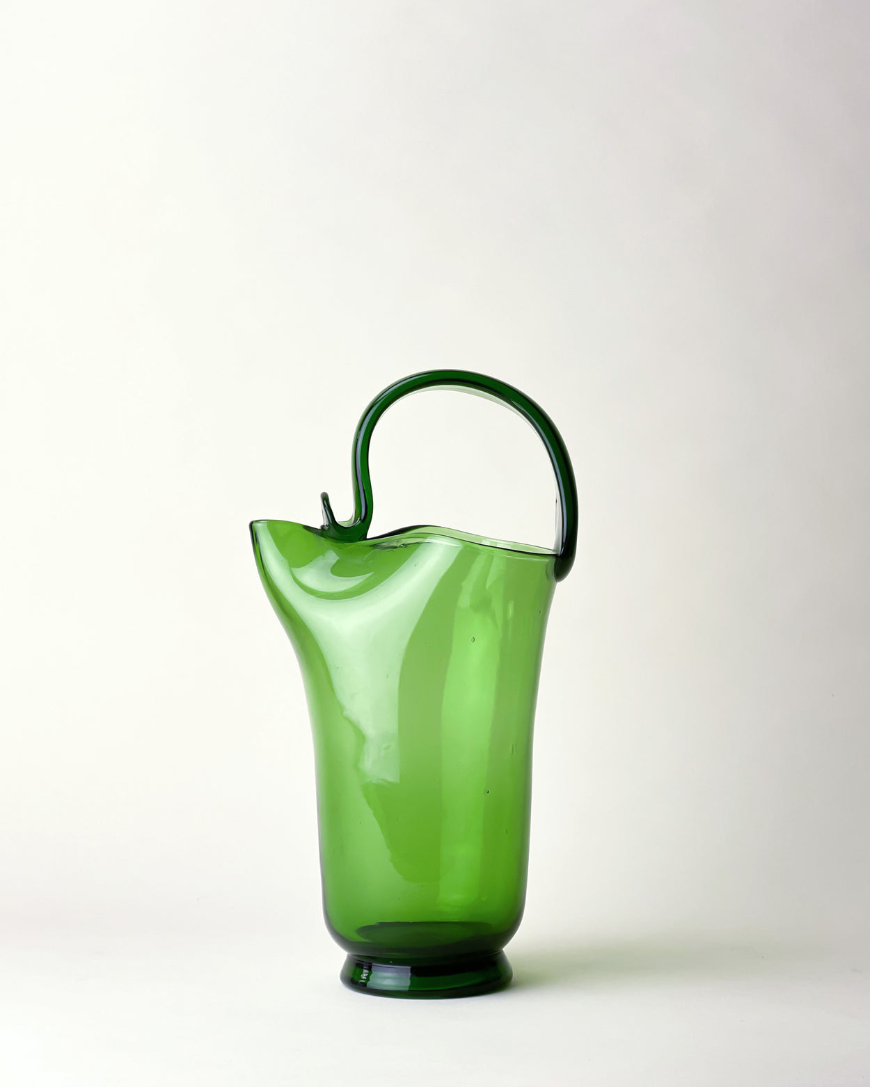 Stunning 1970's green glass jug/pitcher, made by one of the many glass manufacturers based in the region of Empoli, Italy. Known as Empoli Verde ("verde" is Italian for "green"), this bottle green glassware takes its name from the traditional green colour of Empoli glass, which was a result of the content of local sand used for glass production.
