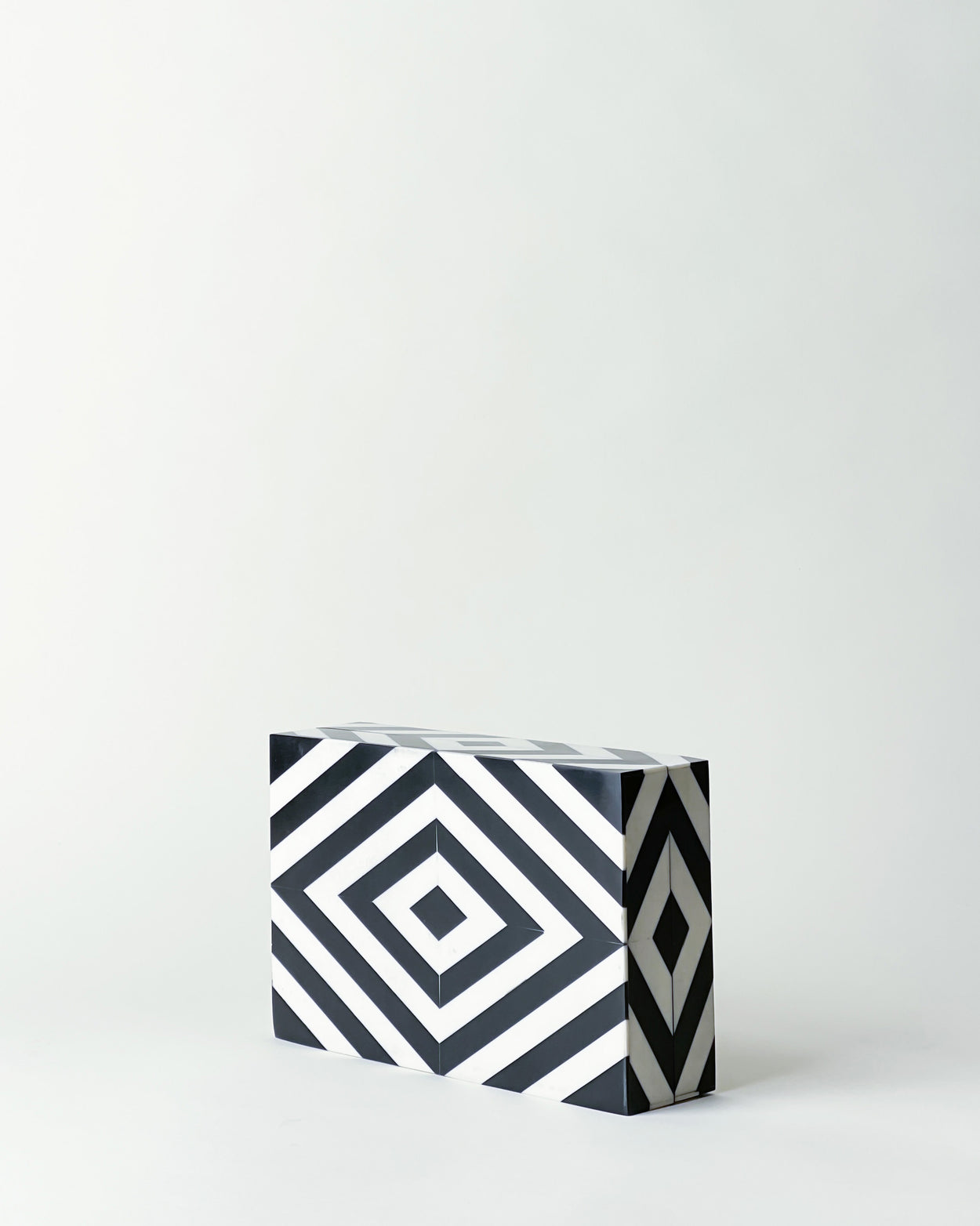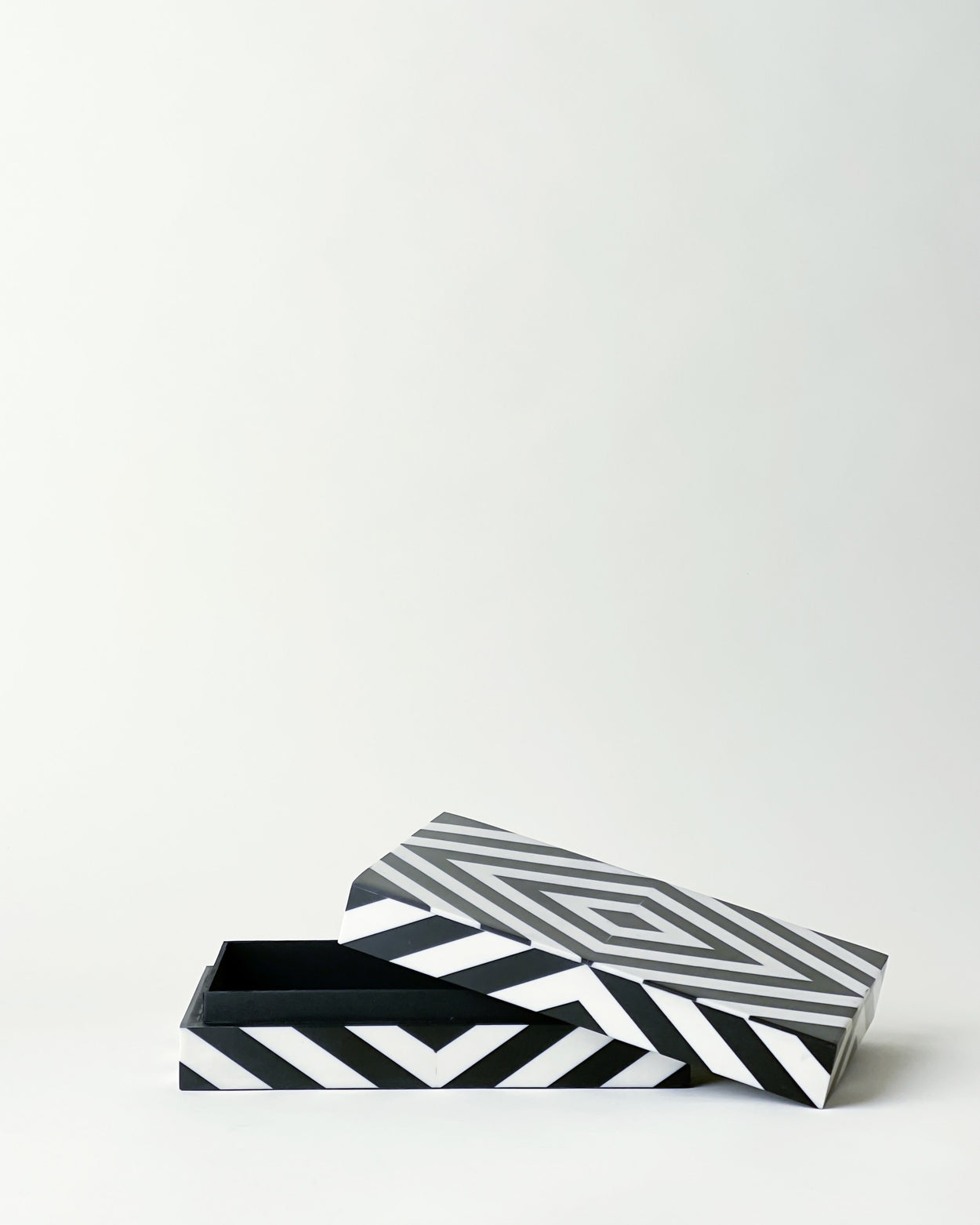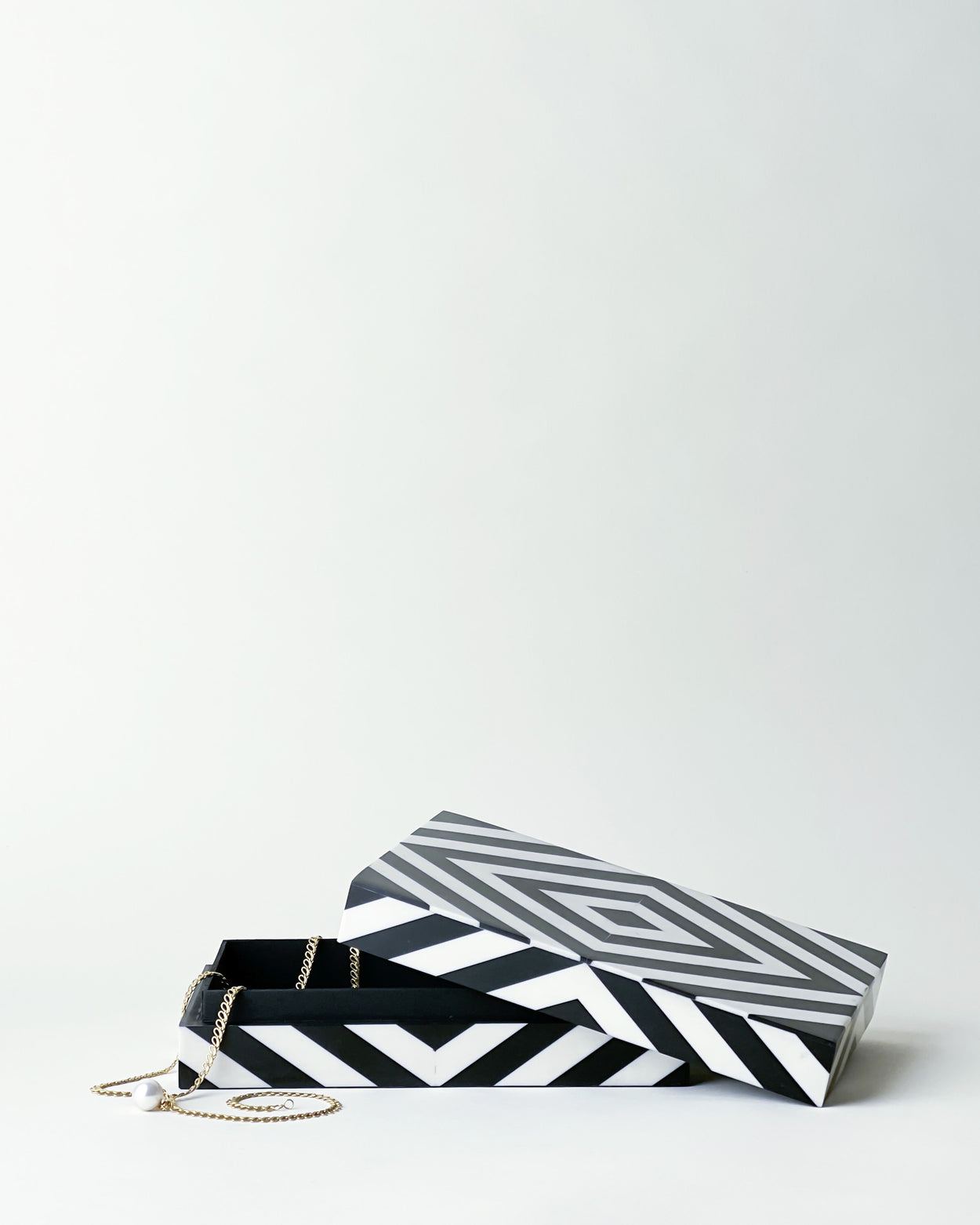 This fabulous black and white herringbone inlay Jewelry Box immediately attracts the eye with its symmetrical geometric pattern. Very decorative object to keep all your personal little treasures safe. An absolute stylish addition to your lounge, dining room or bedroom.