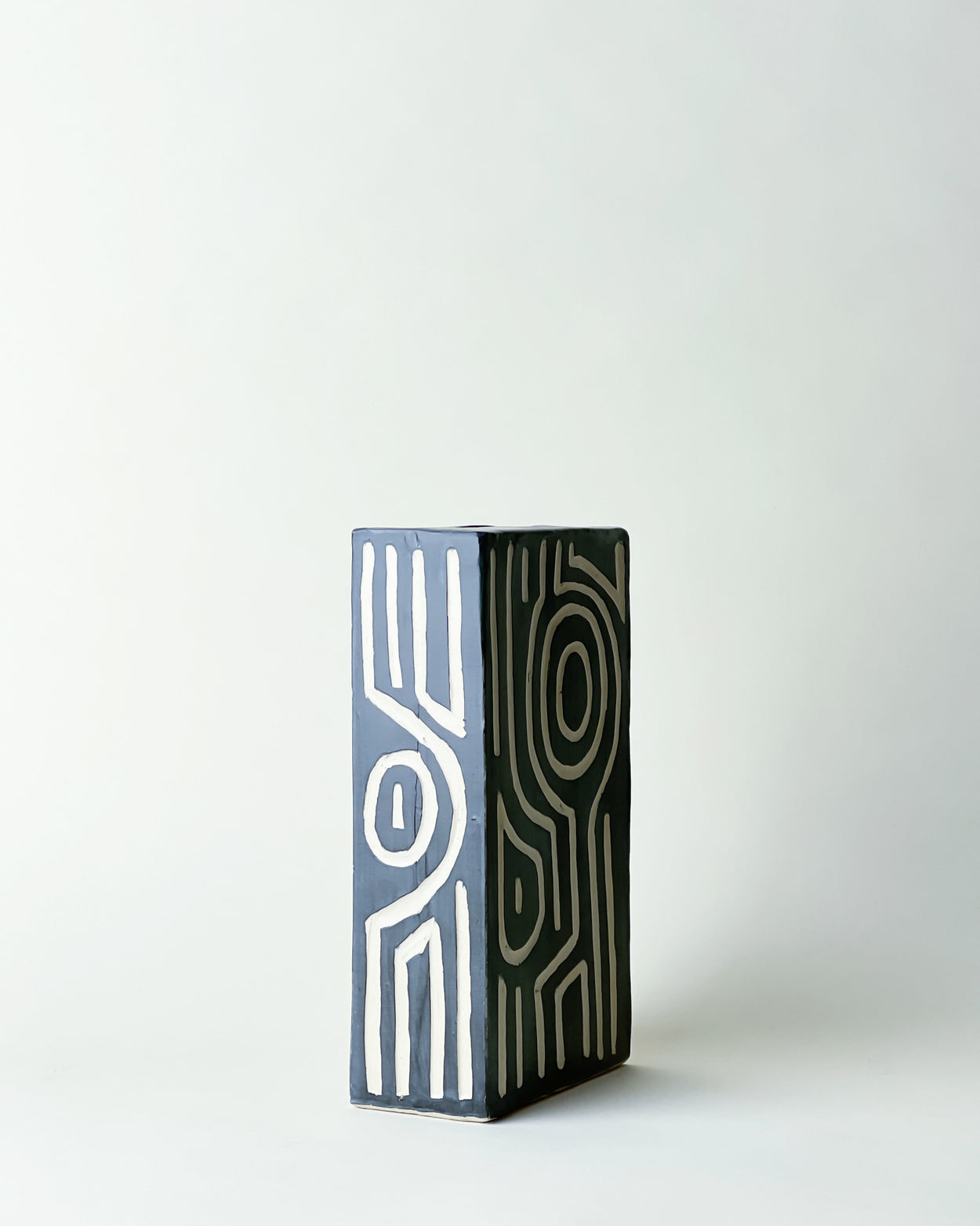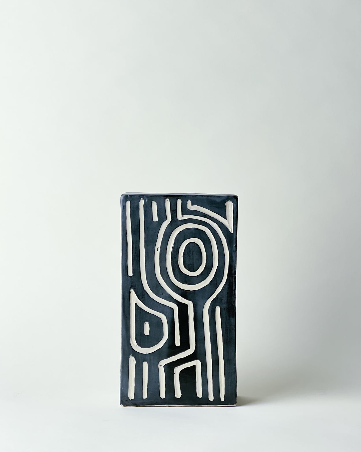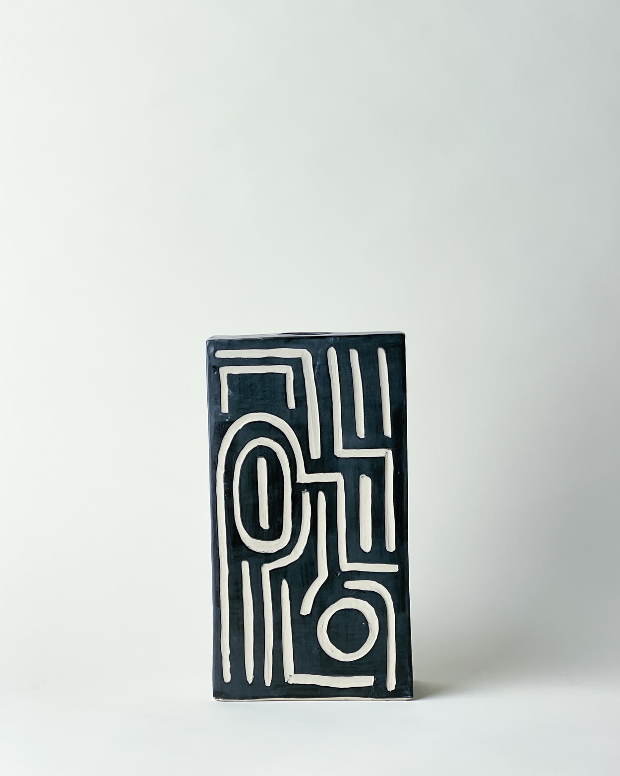 Wonderful, one-of-a-kind, handmade Vase/Object by Ceramic Artist Elisabeth Rollmann. Rollmann's background lies in Architecture, which explains her preference for rectangular shapes. This amazing object is slip casted, painted with black slip in a matte finish. The graphic illustration is cut with a special tool. This technique is called sgraffito. This Ceramic Art Object will stand out in you Interior, with or without flowers.