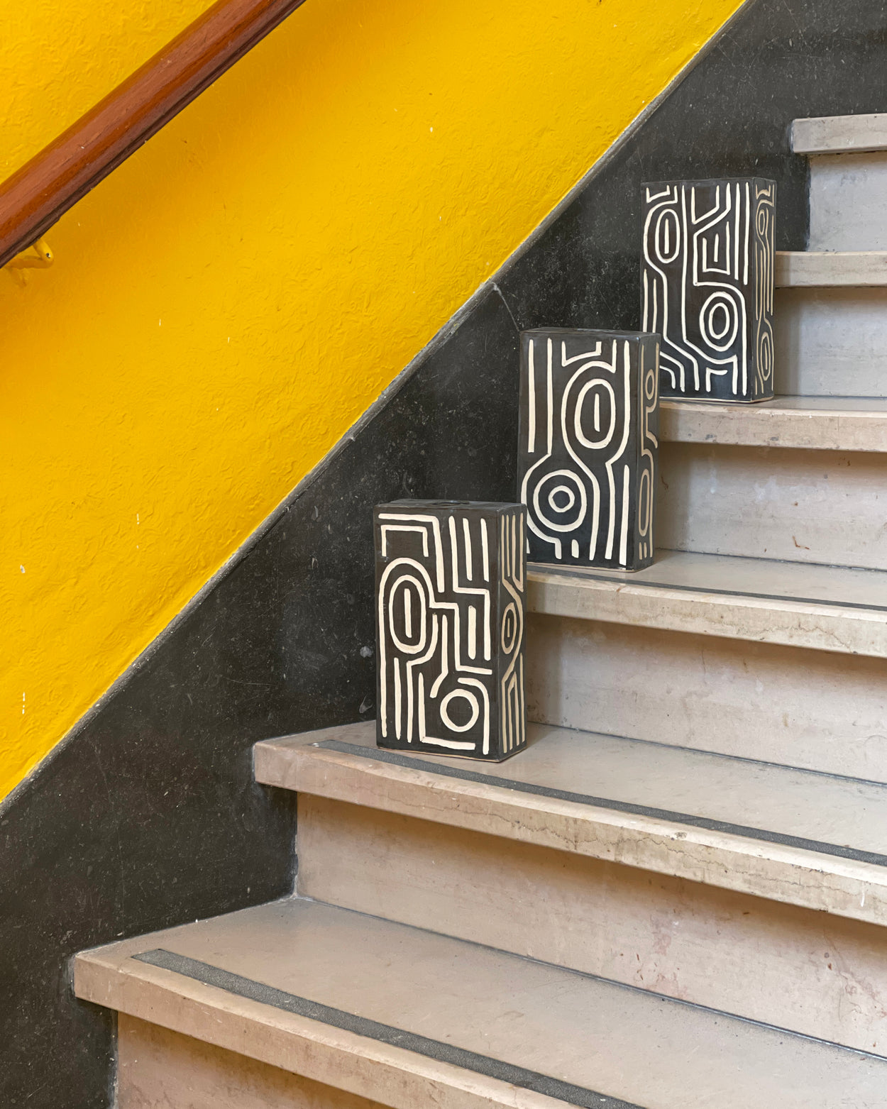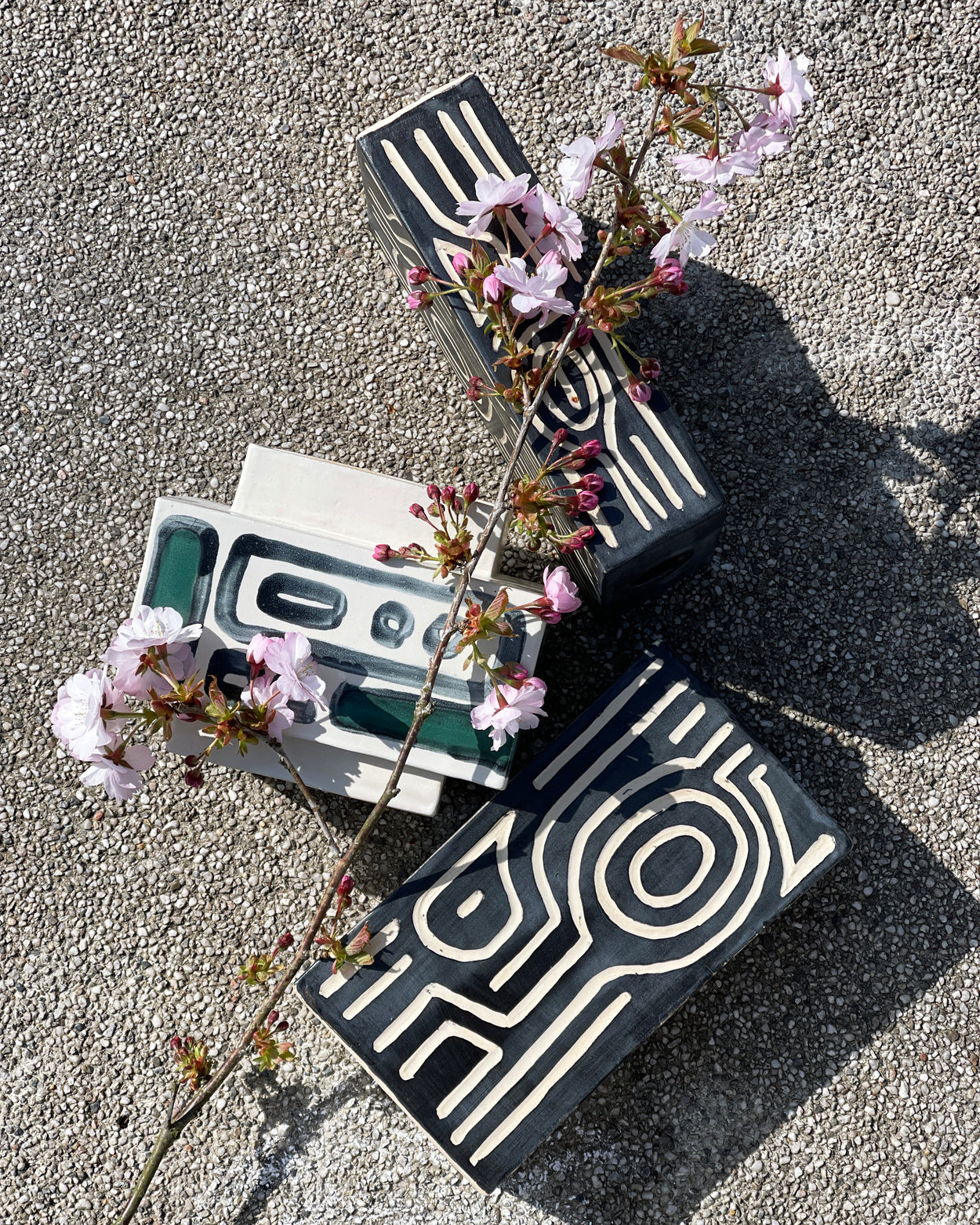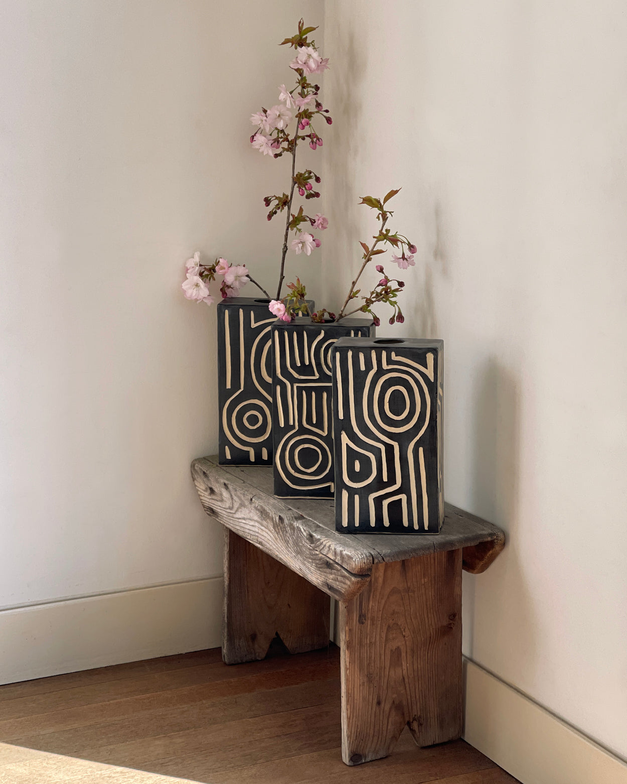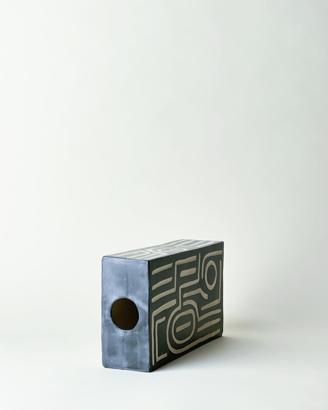 Wonderful, one-of-a-kind, handmade Vase/Object by Ceramic Artist Elisabeth Rollmann. Rollmann's background lies in Architecture, which explains her preference for rectangular shapes. This amazing object is slip casted, painted with black slip in a matte finish. The graphic illustration is cut with a special tool. This technique is called sgraffito. This Ceramic Art Object will stand out in you Interior, with or without flowers.