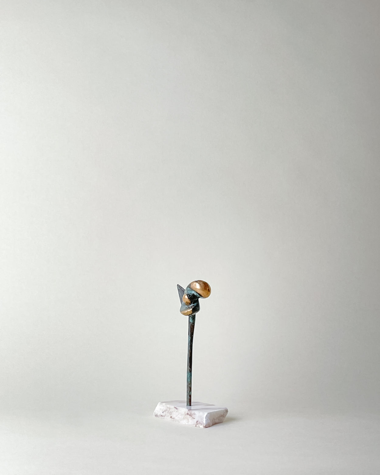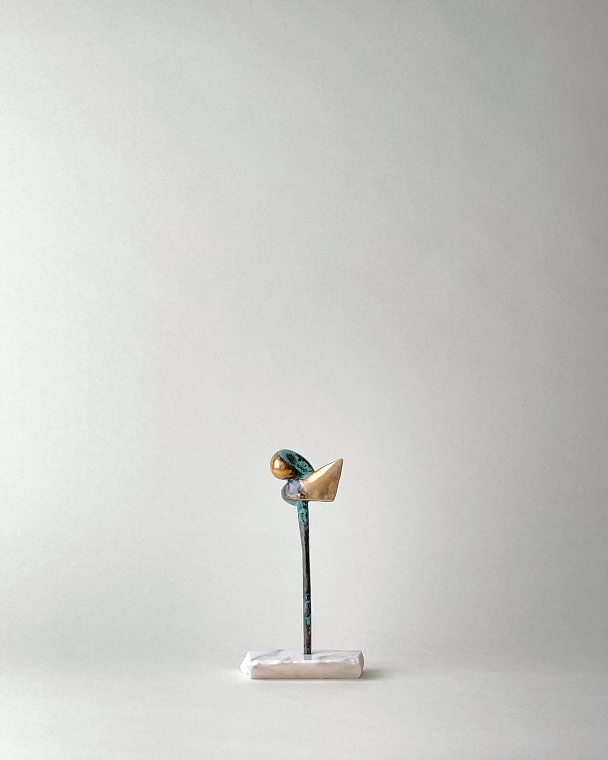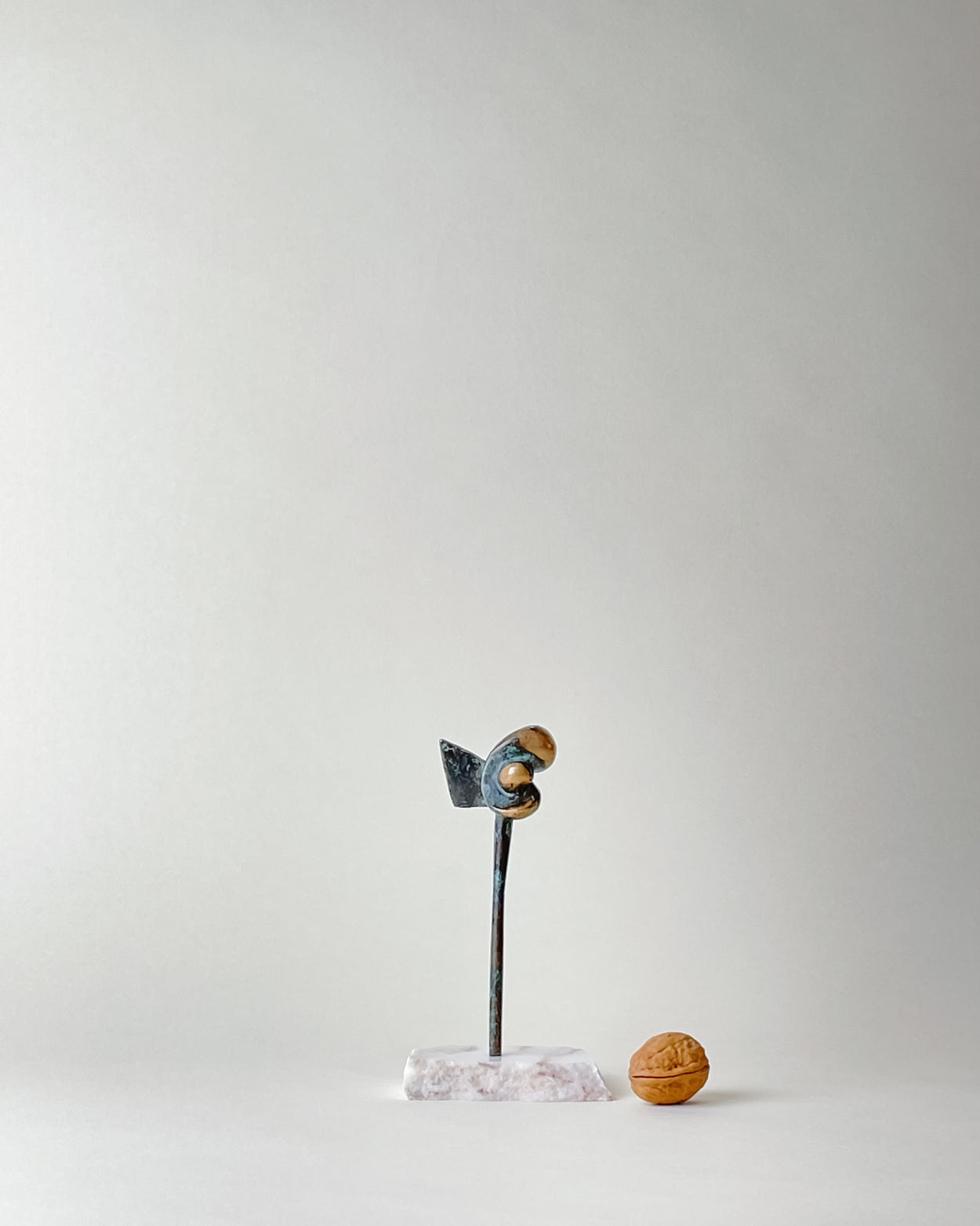 Elegant 'petite' abstract modernist sculpture. Handmade bronze object with nice green patina and marble foot. Will Art-Up your favorite styling corner.