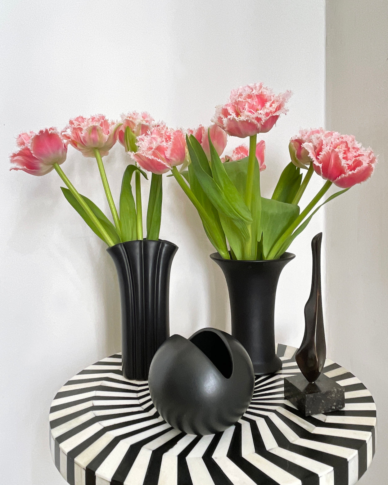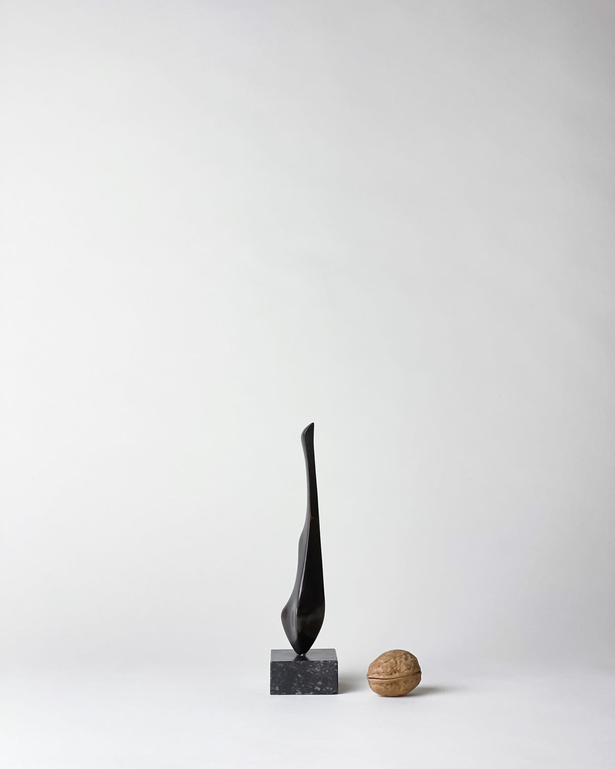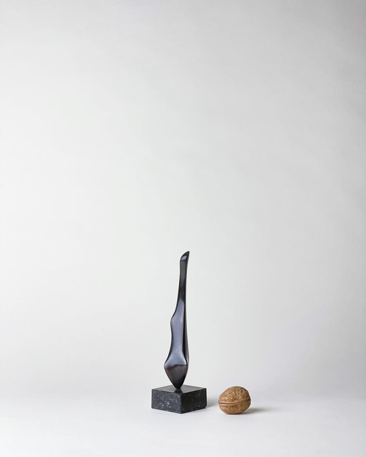 Lovely abstract, modernist sculpture, with black brown patina on marble foot. This peculiar little object will instantly lift your styling corner to that gallery feel.