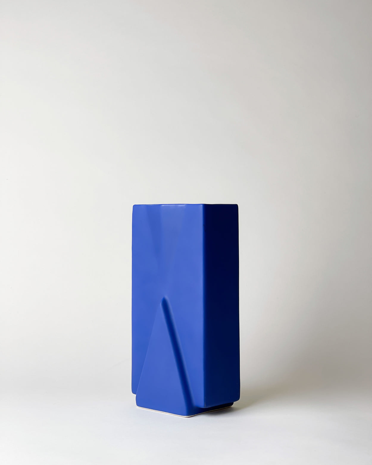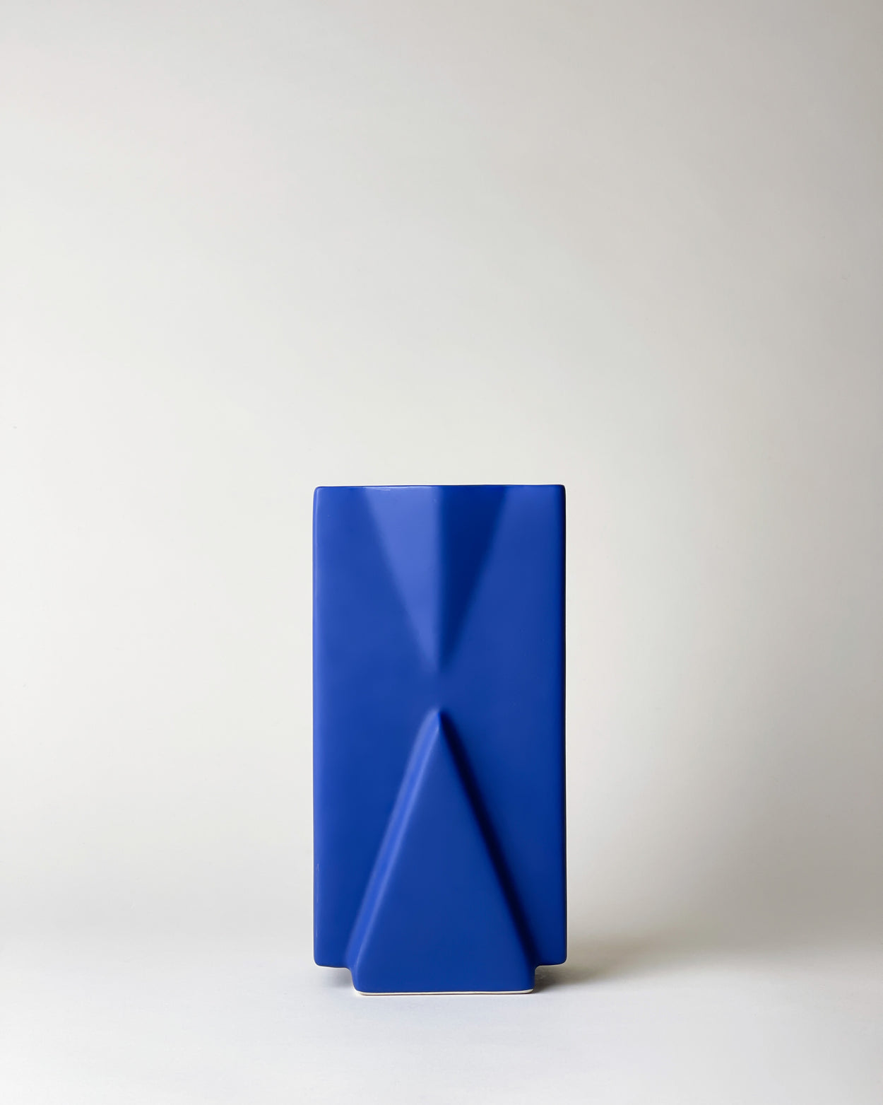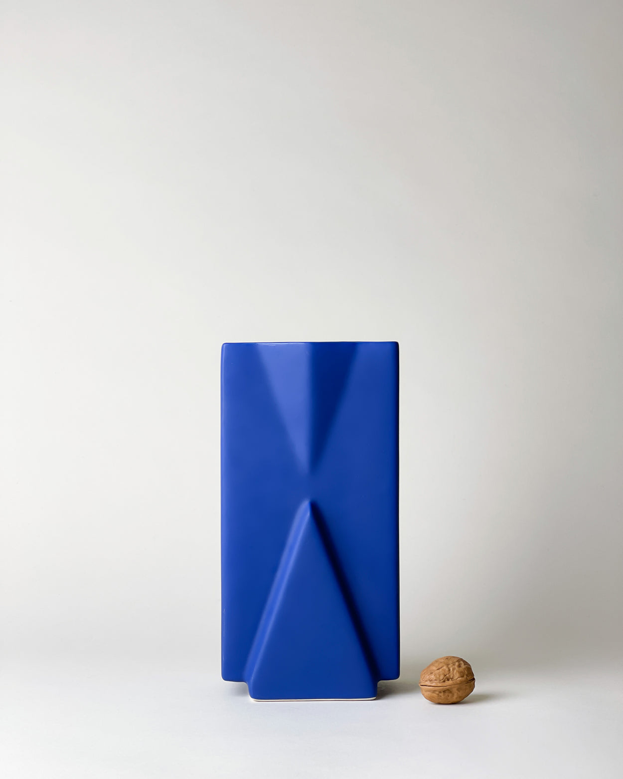 Spectacular 3D geometric shaped vase in matte cobalt blue glaze. An absolute colour booster for your Interior. Unique styling object, with or without flowers.