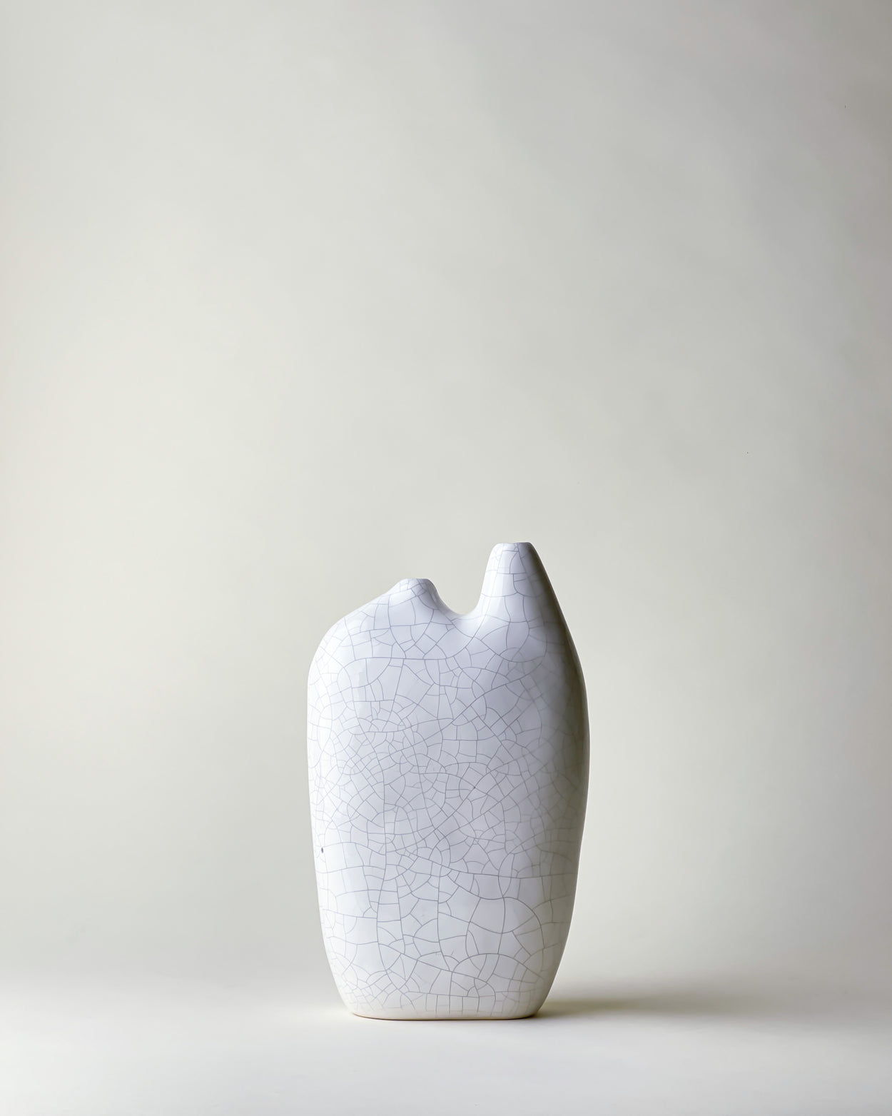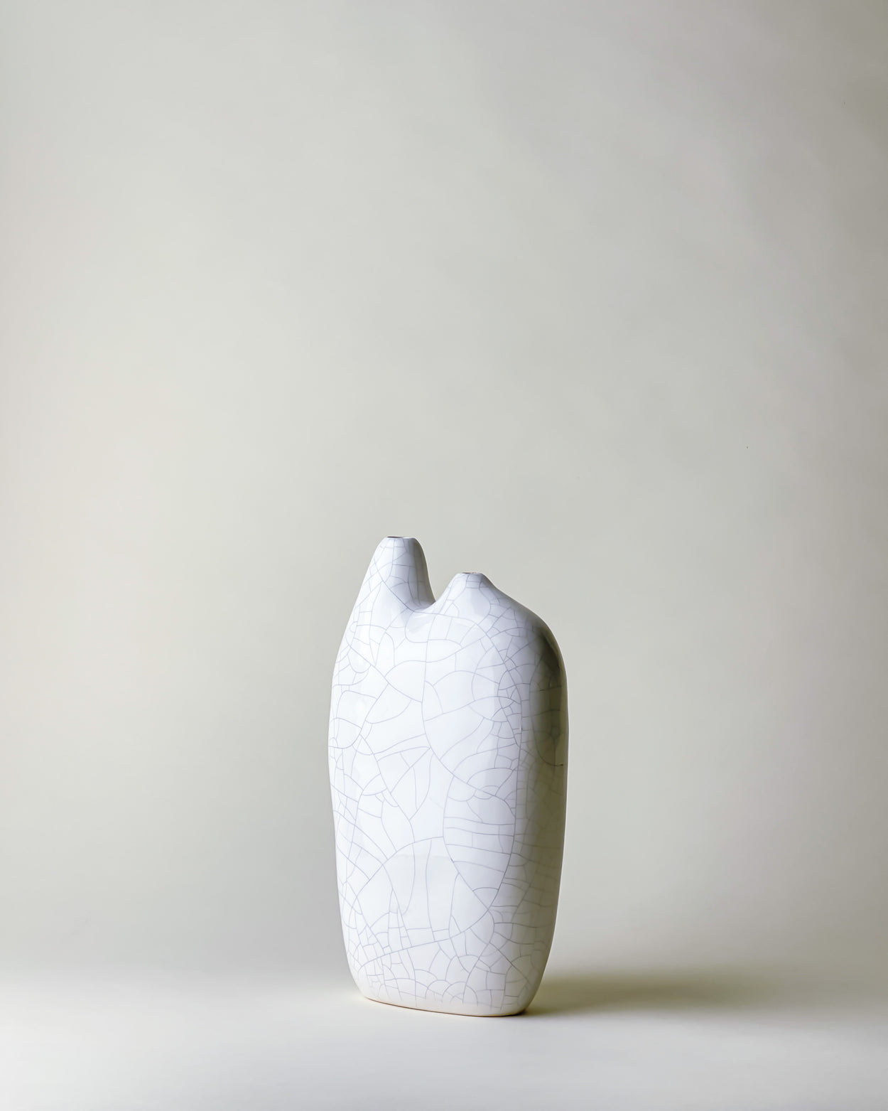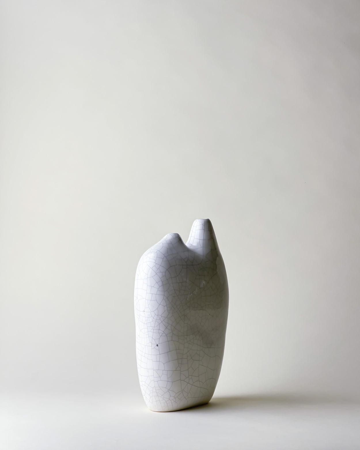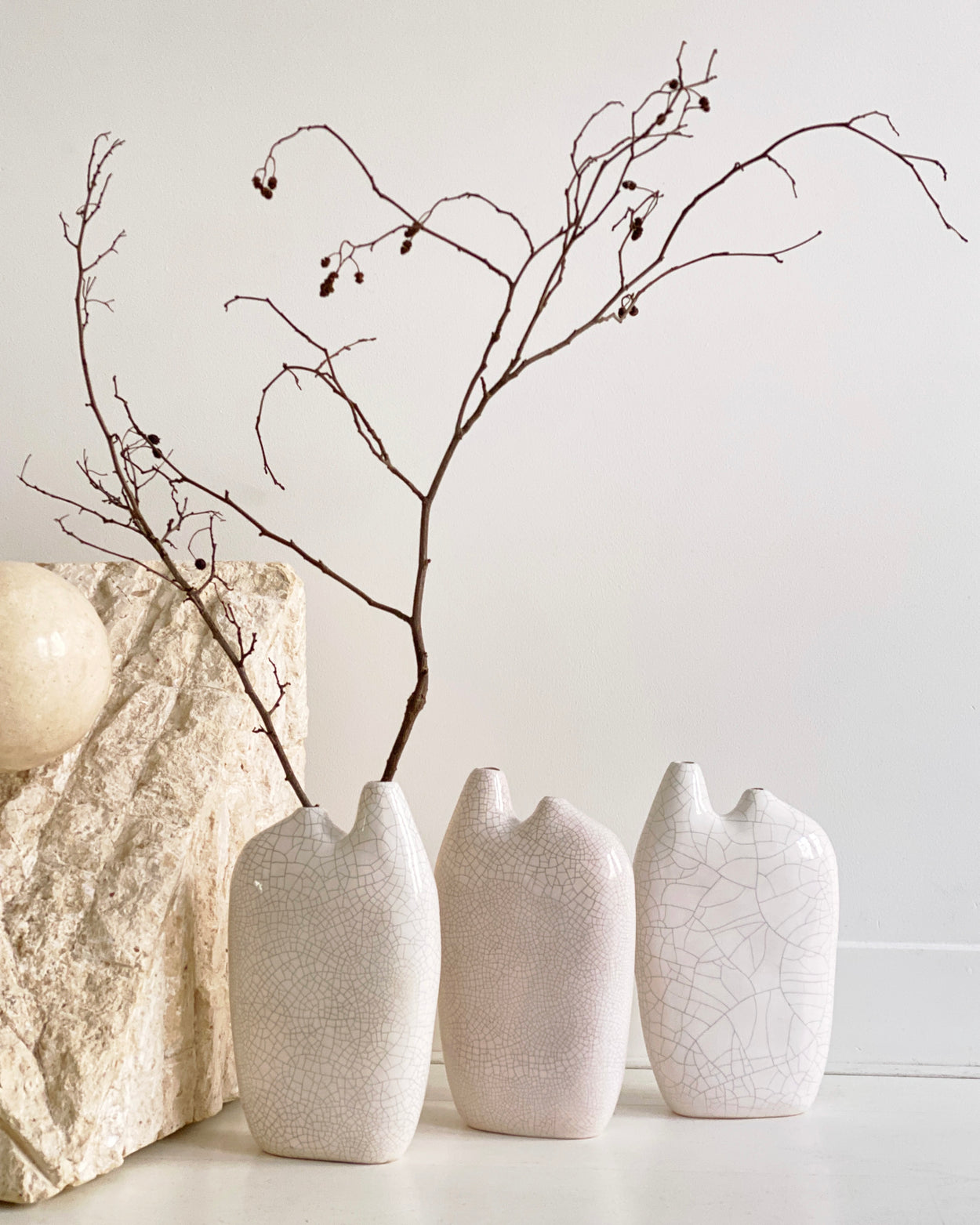 Organically shaped sculptural objects from the RAW series (The Desert) by Luiza Jaworska. The porcelain objects/vases are made of a plaster cast, finished with wonderful crackle glaze. The vase has two openings on top, which gives you the opportunity to style the vase with a single branch or dry flower. Either way you style the vase, it’s an absolute ‘object of desire’ for your interior decoration.