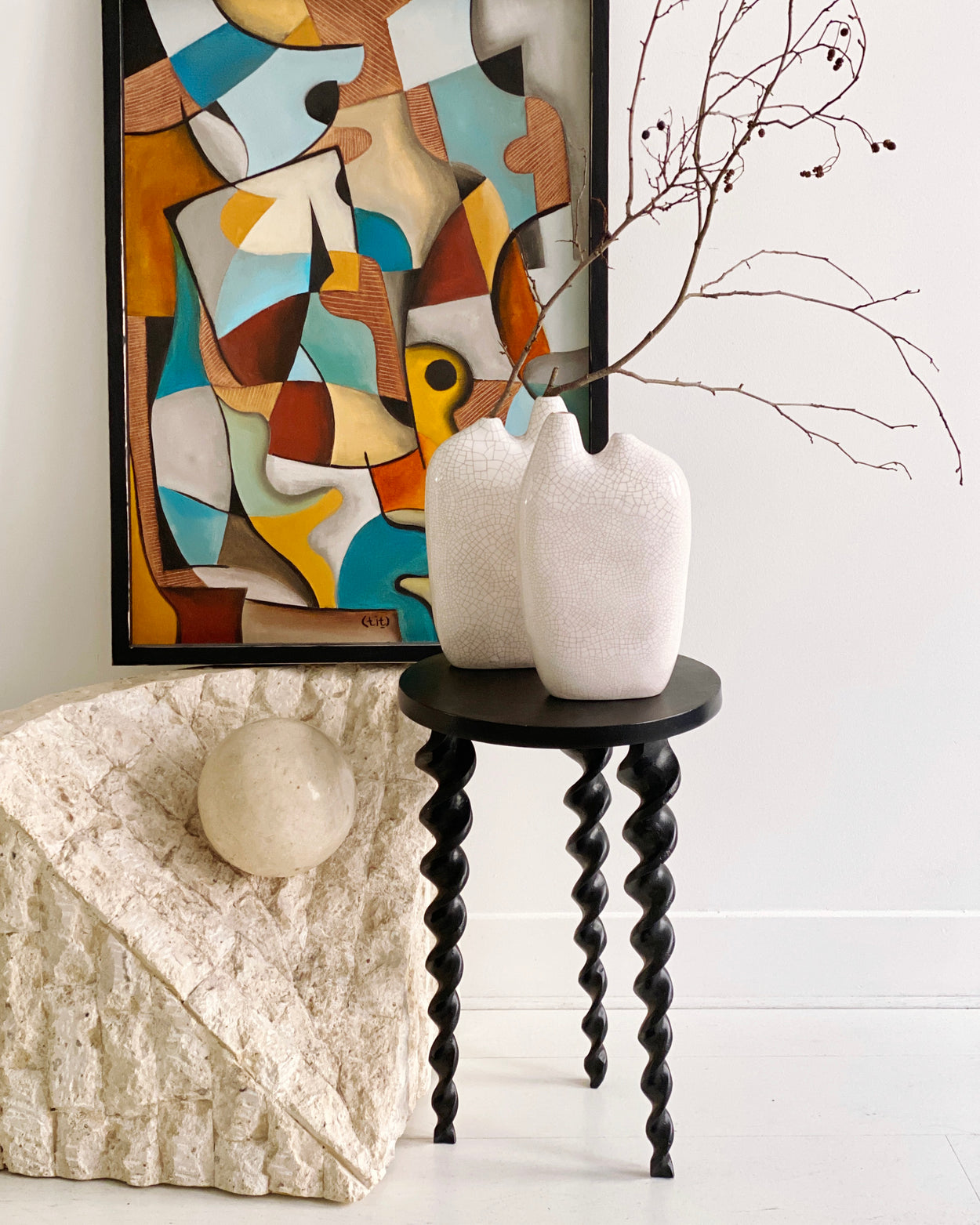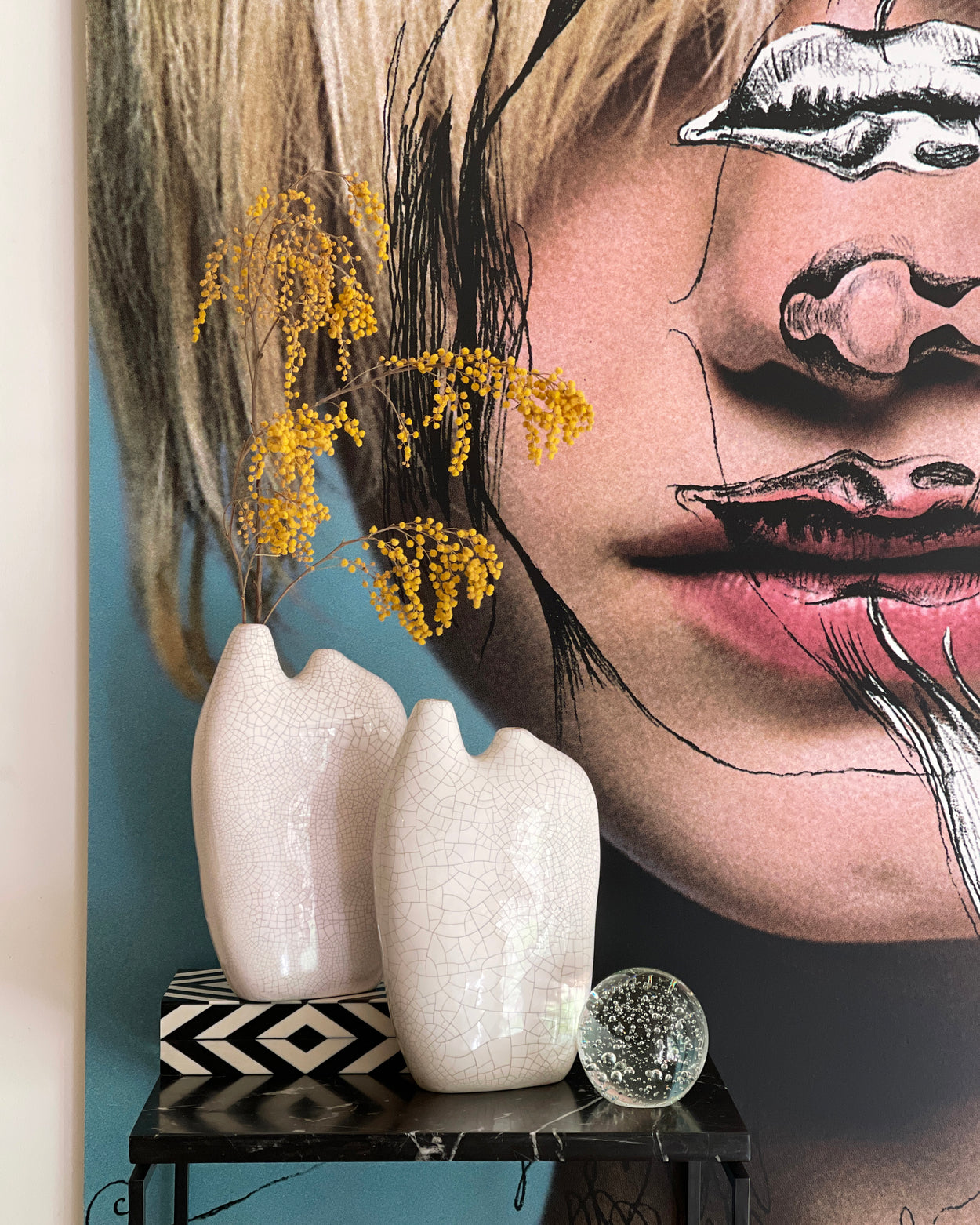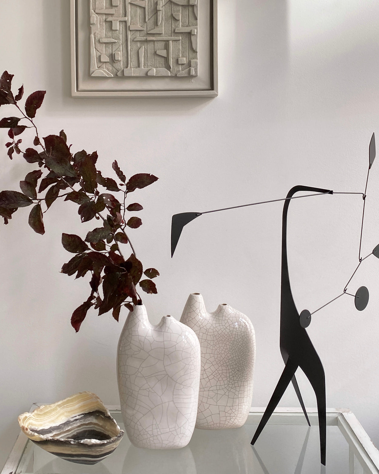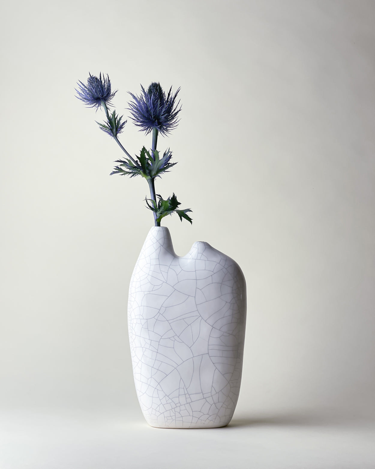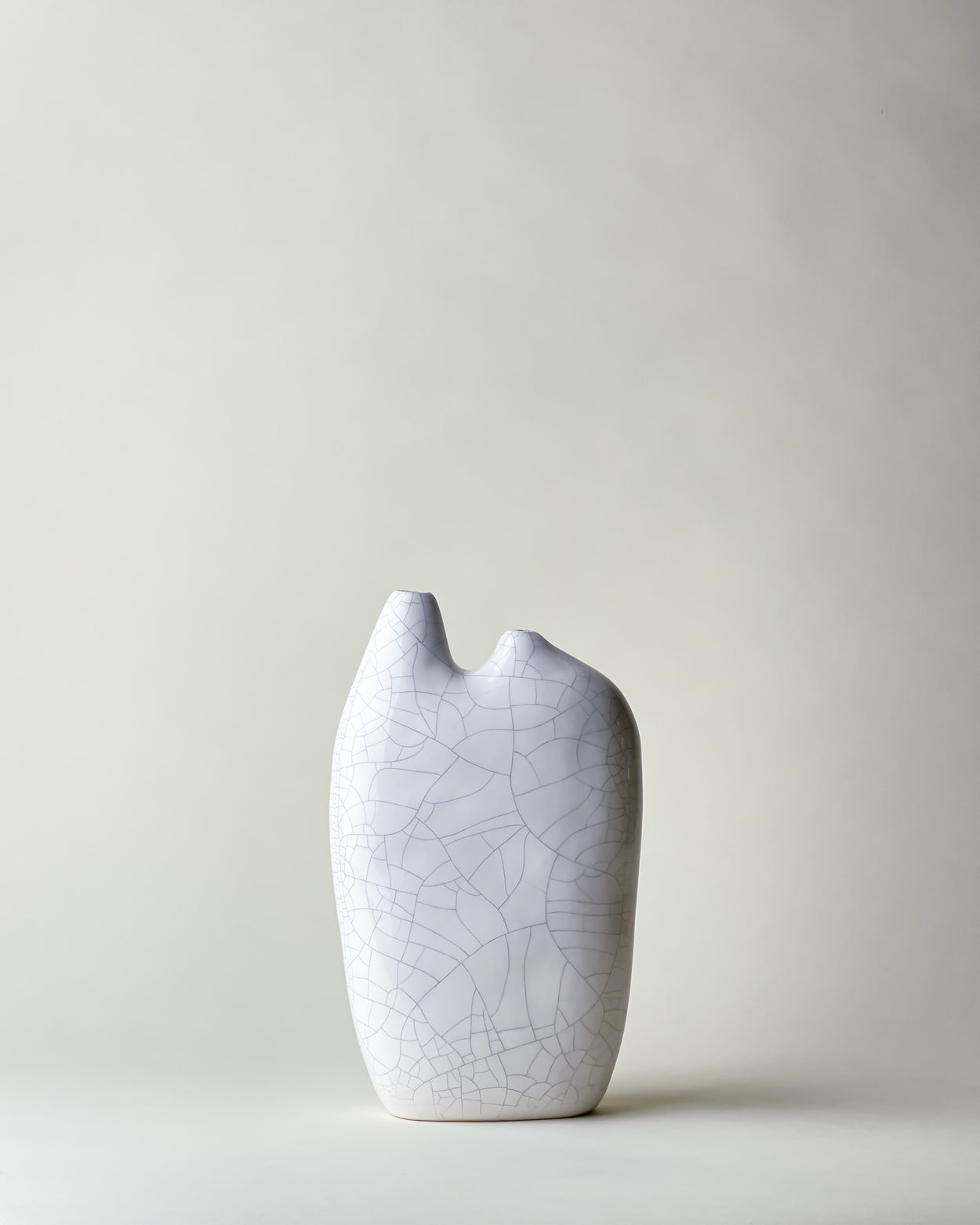 Organically shaped sculptural objects from the RAW series (The Desert) by Luiza Jaworska. The porcelain objects/vases are made of a plaster cast, finished with wonderful crackle glaze. The vase has two openings on top, which gives you the opportunity to style the vase with a single branch or dry flower. Either way you style the vase, it’s an absolute ‘object of desire’ for your interior decoration.