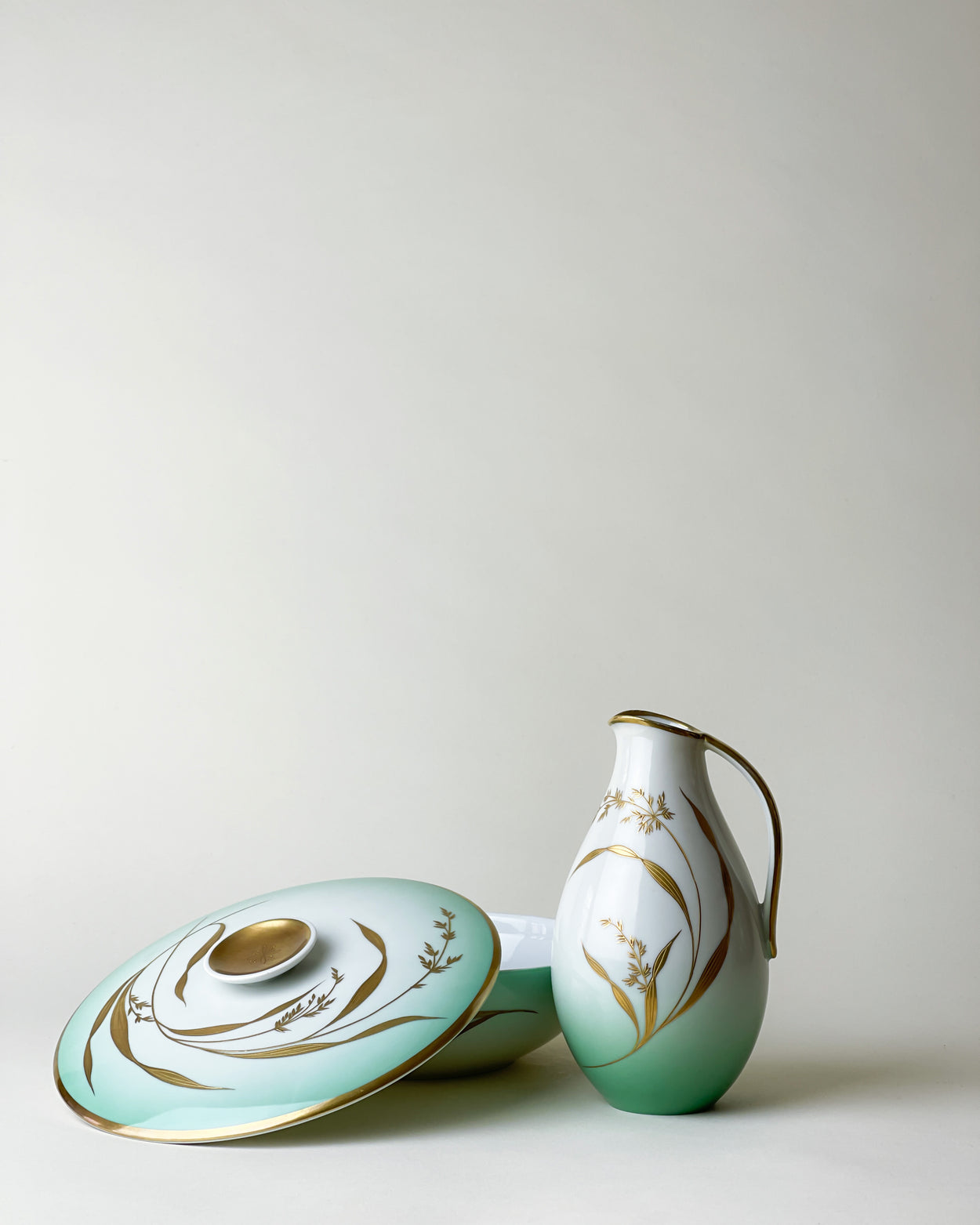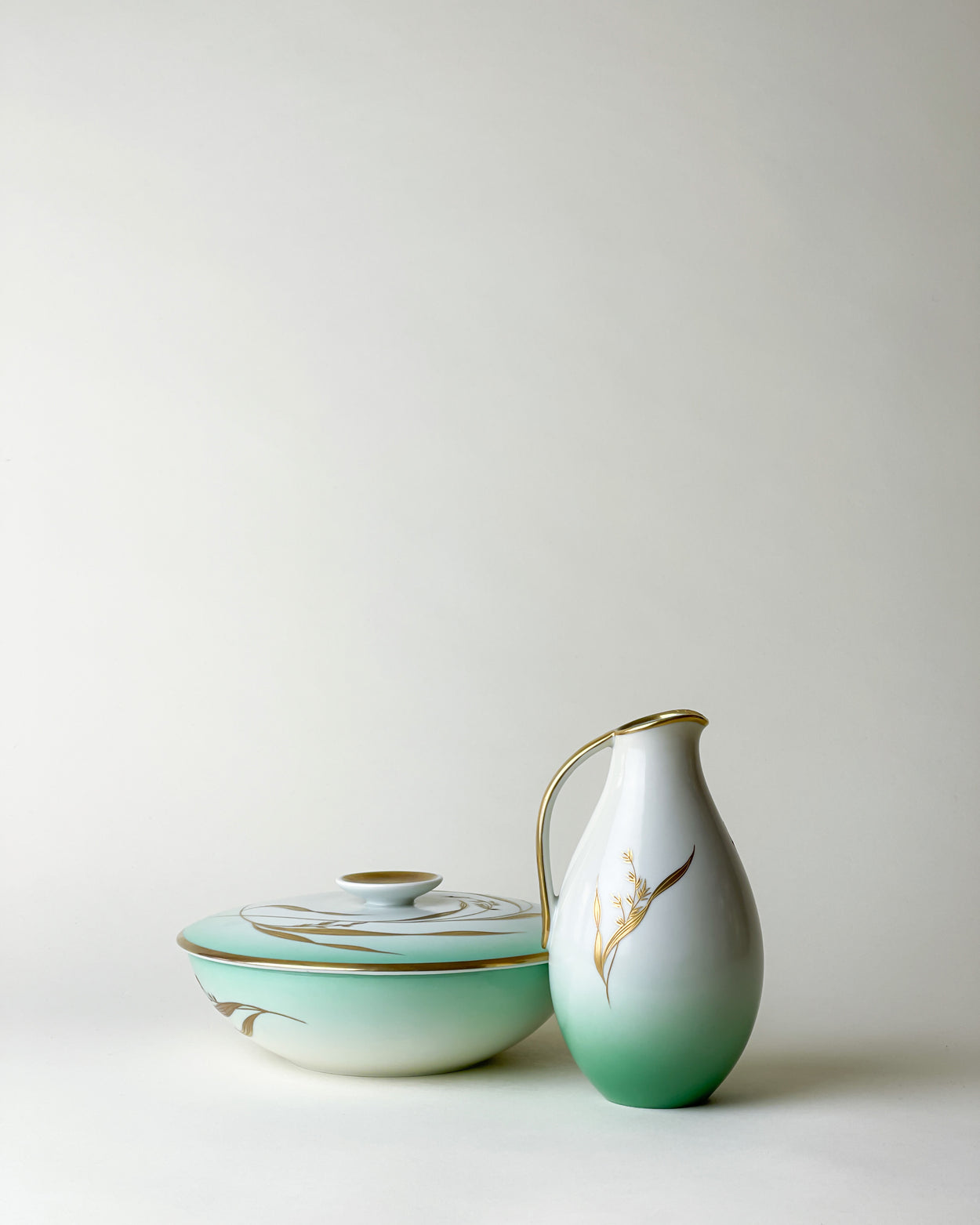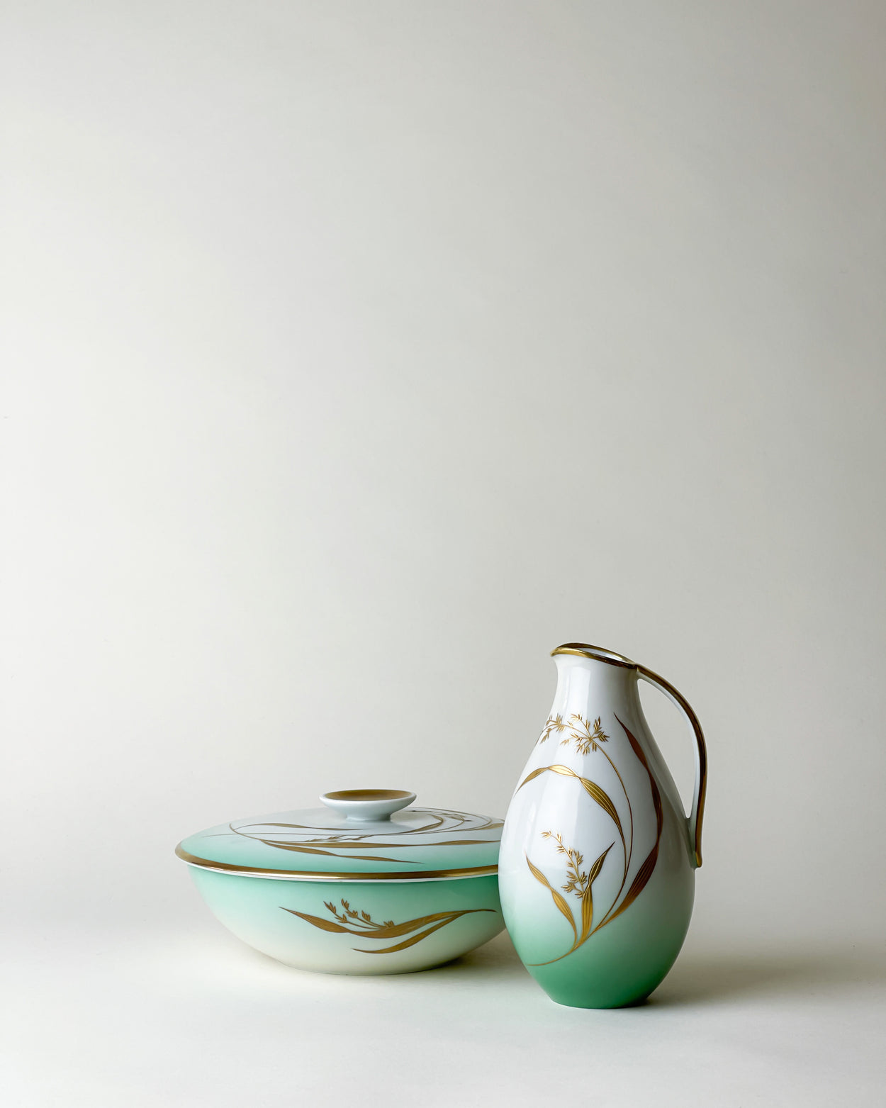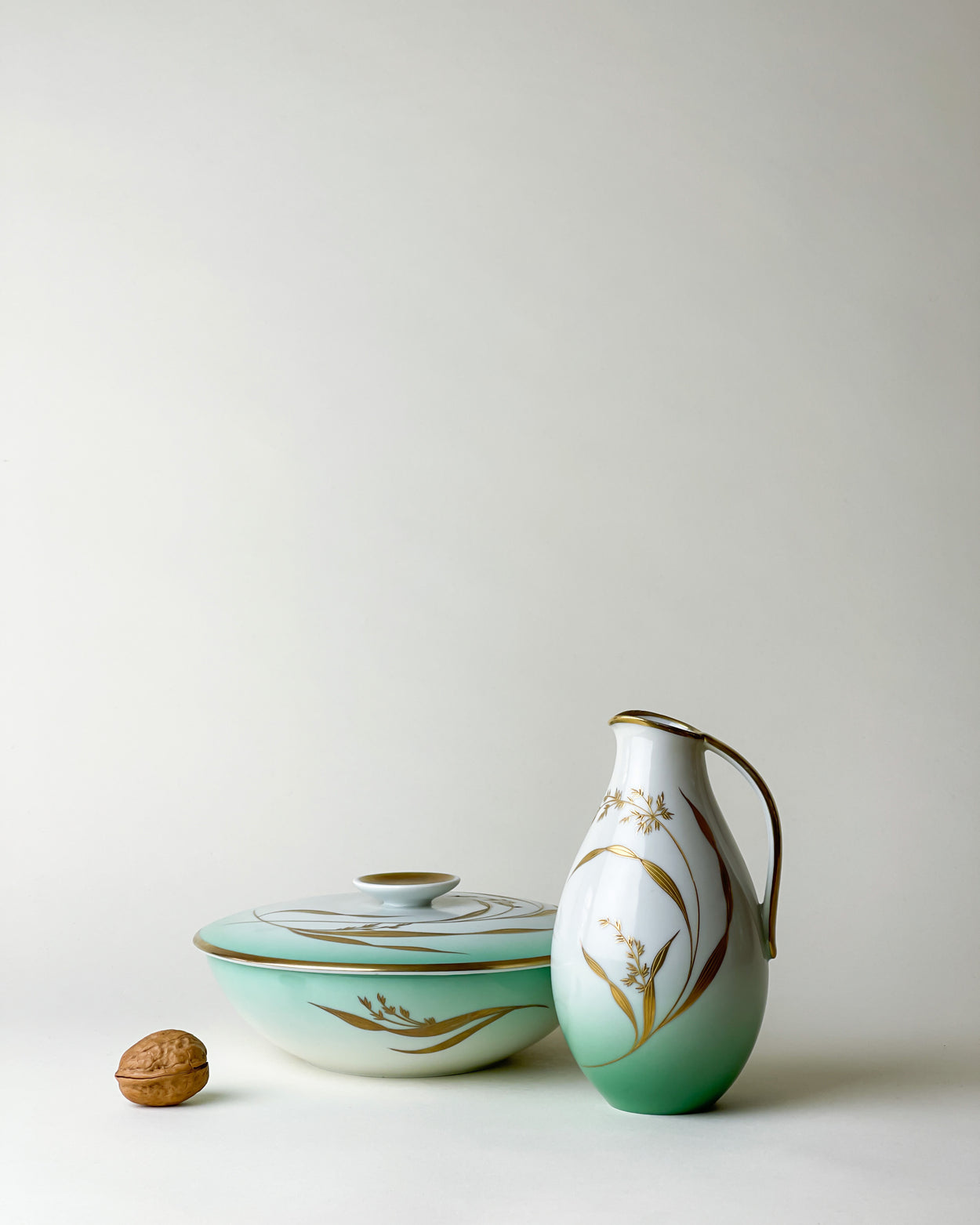 Wonderful hand painted porcelain Pitcher Vase with lidded bowl made in the 1950s. By Rhenania Duisdorf West Germany. Highly decorative interior styling set, with or without cookies.