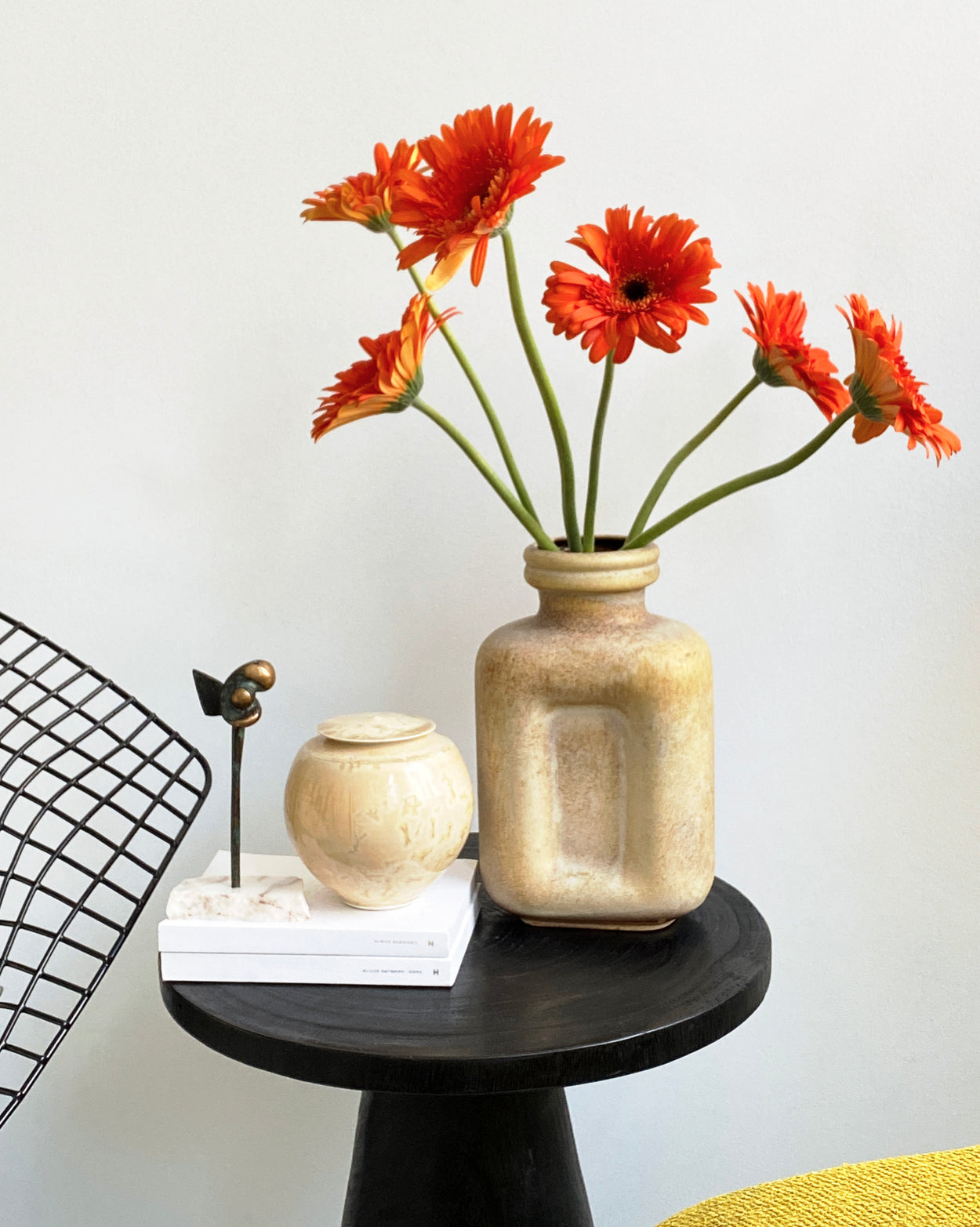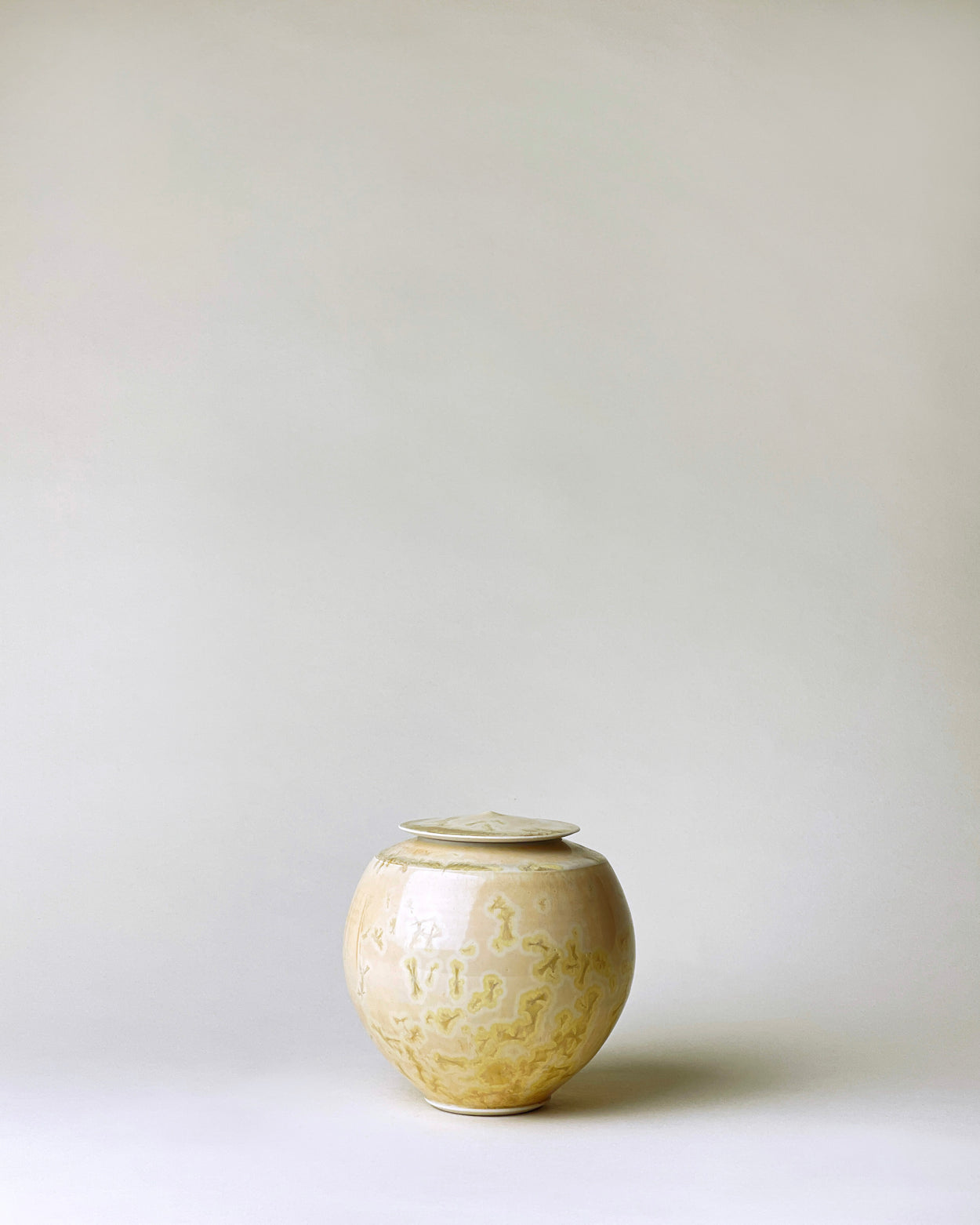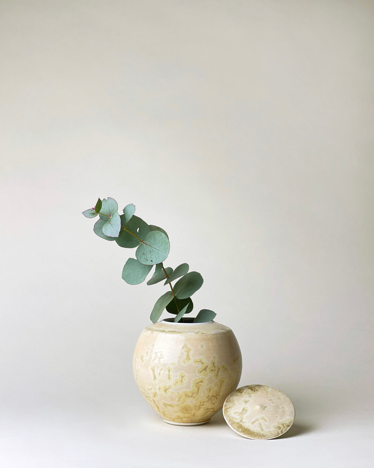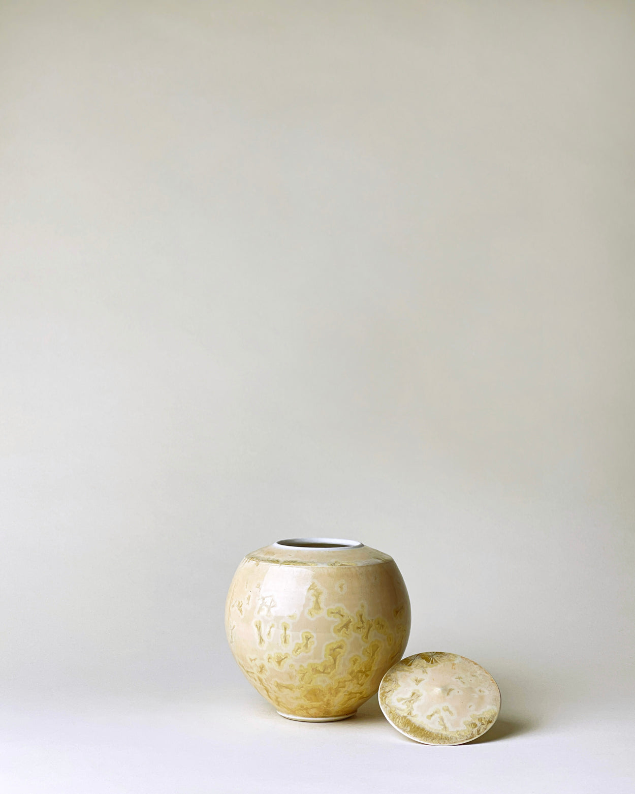 Elegant porcelain jar with lid, cream crystalline glazed. Made by Dutch ceramic artist Ed Meissenberg.