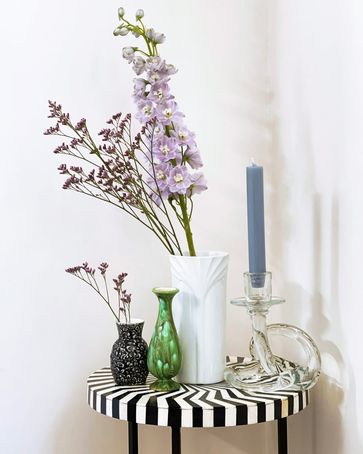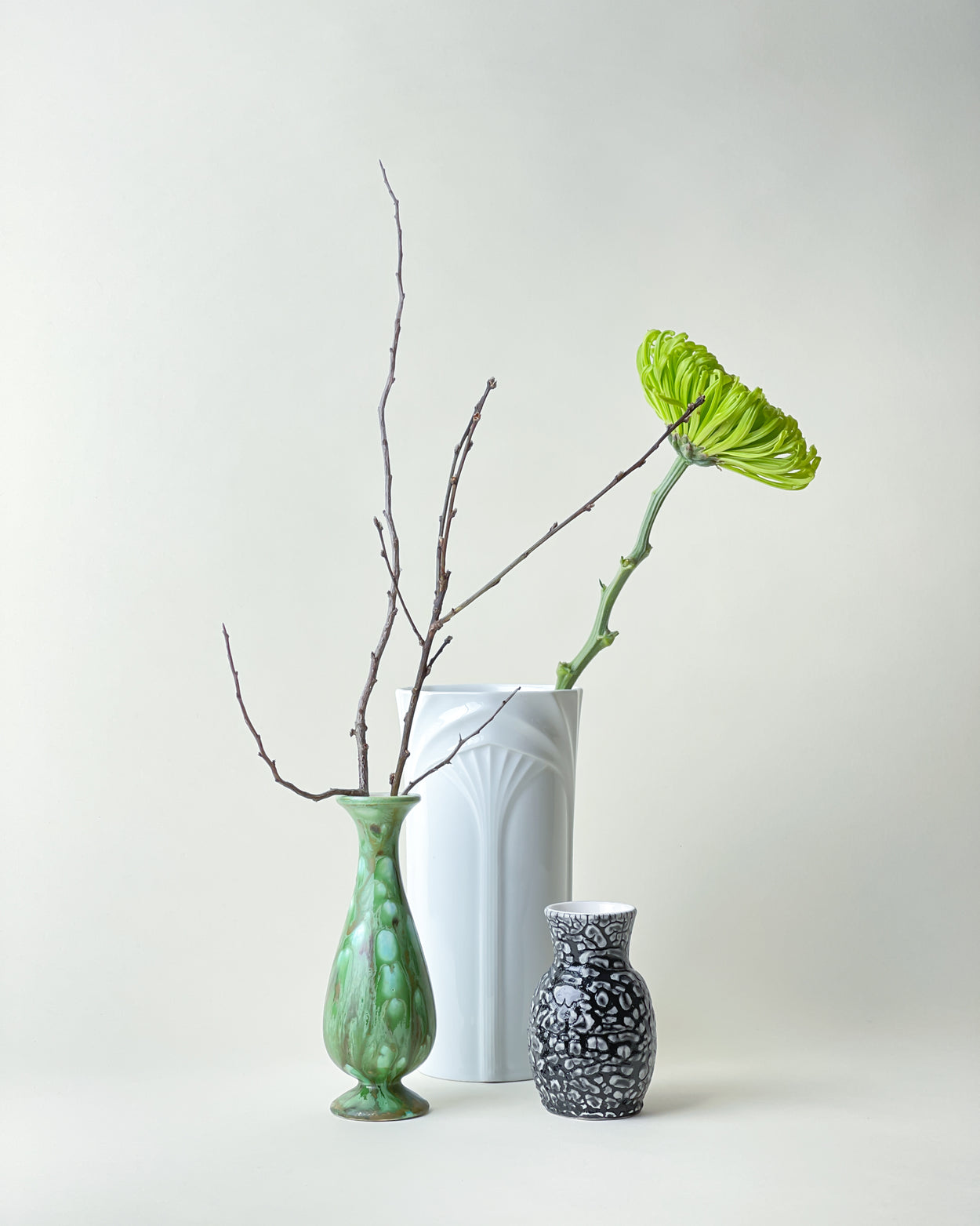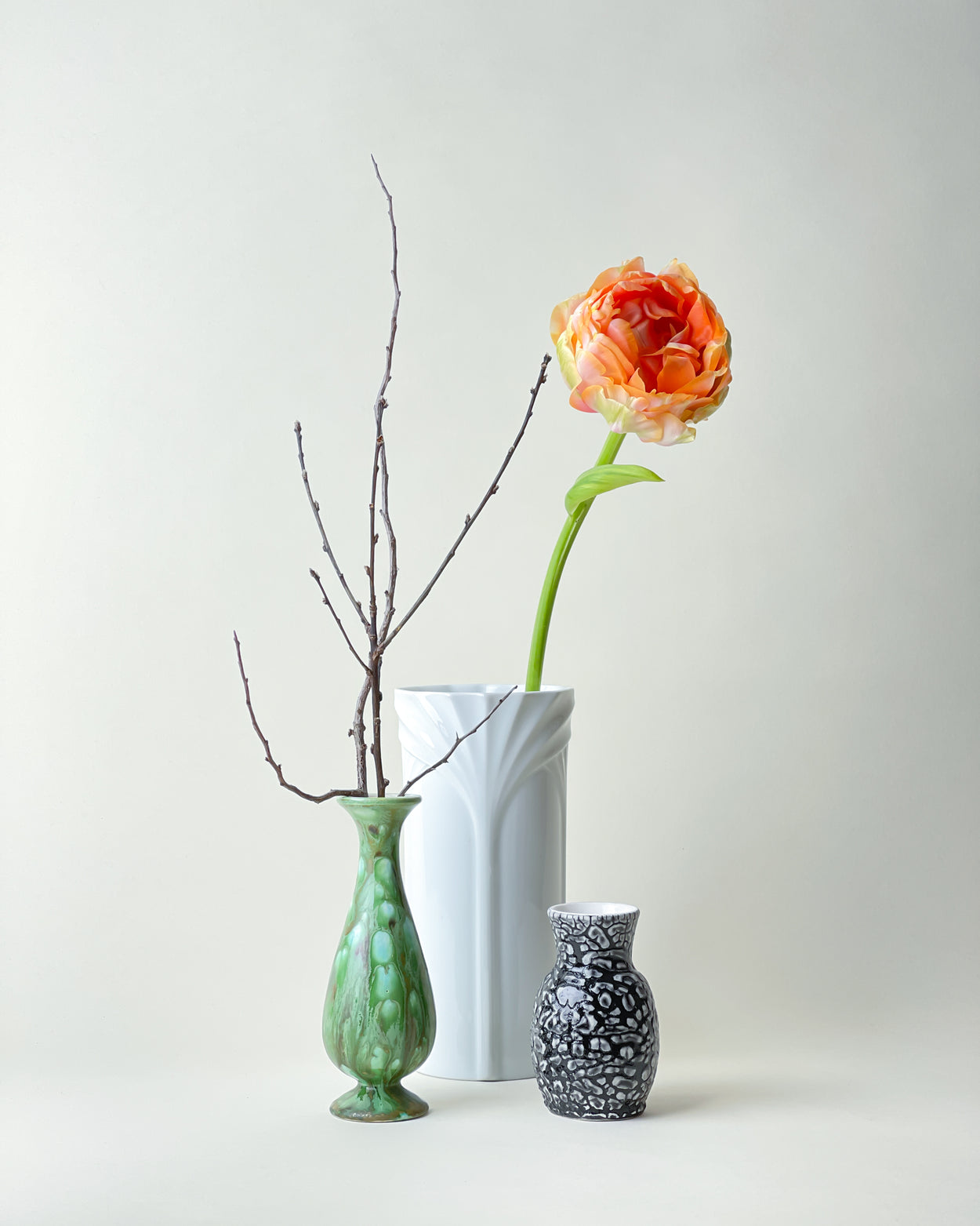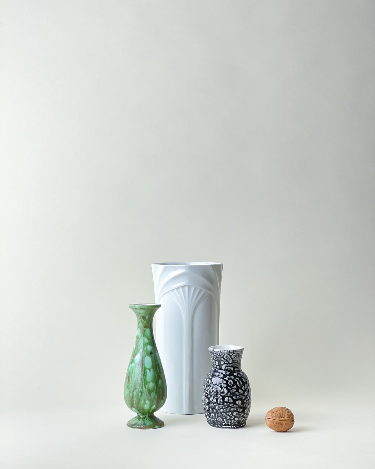 Wonderful Eclectic Mix of vases. The white porcelain vase with Jungenstil Pattern is made by Hutschenreuther Germany. Combined with elegant green vase in amazing drip glaze. And last-but-not-least: the small black one with characteristic crackle glaze. This peculiar trio will definitely bring some authentic style to your side table.