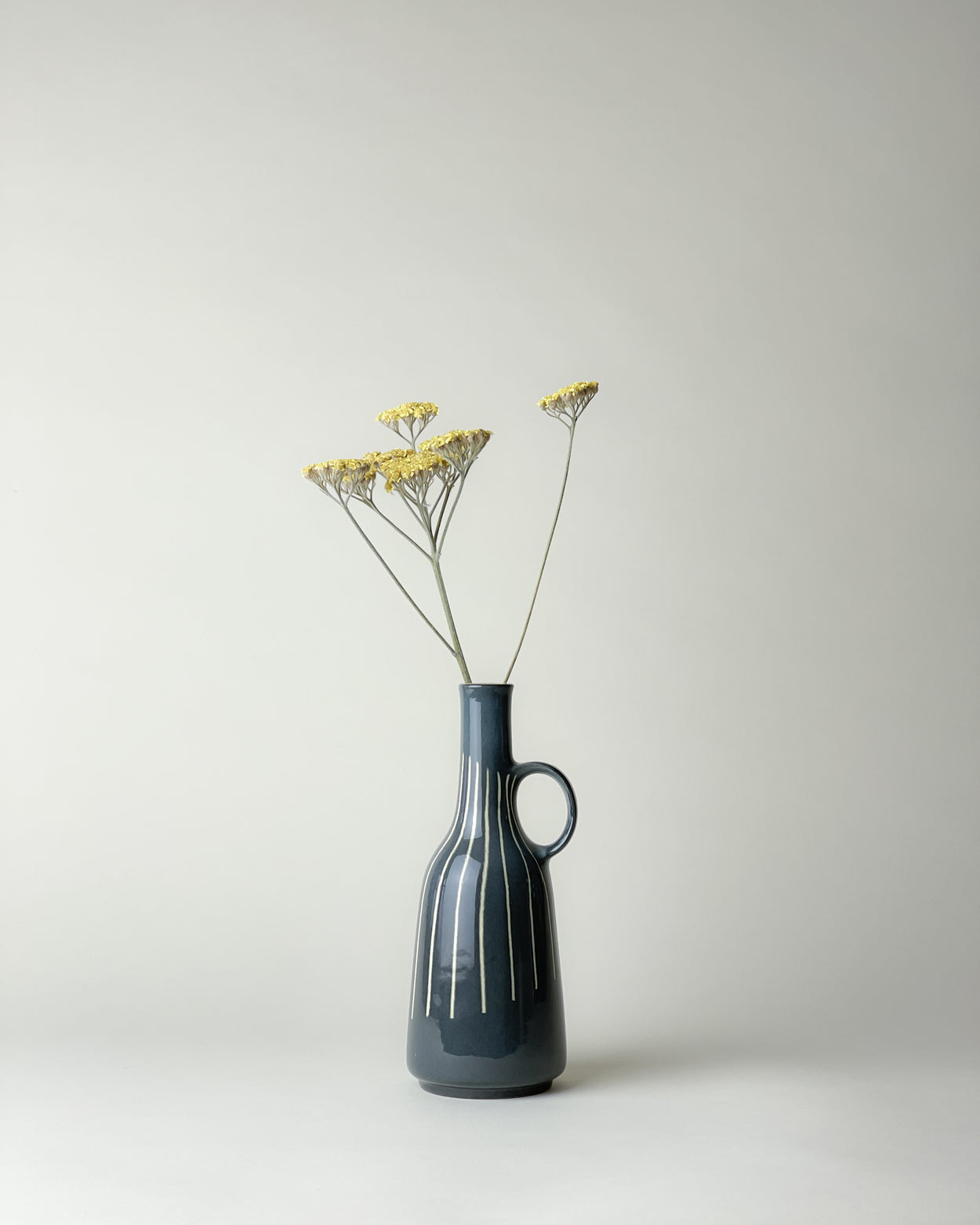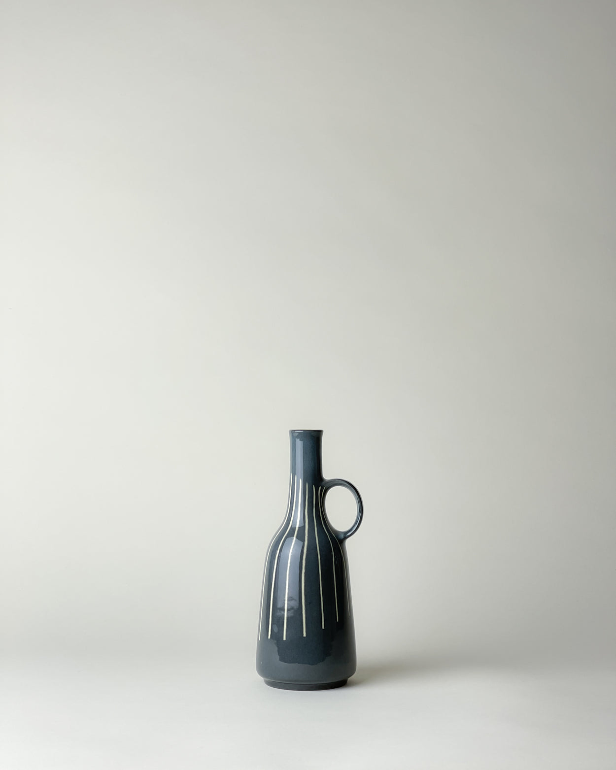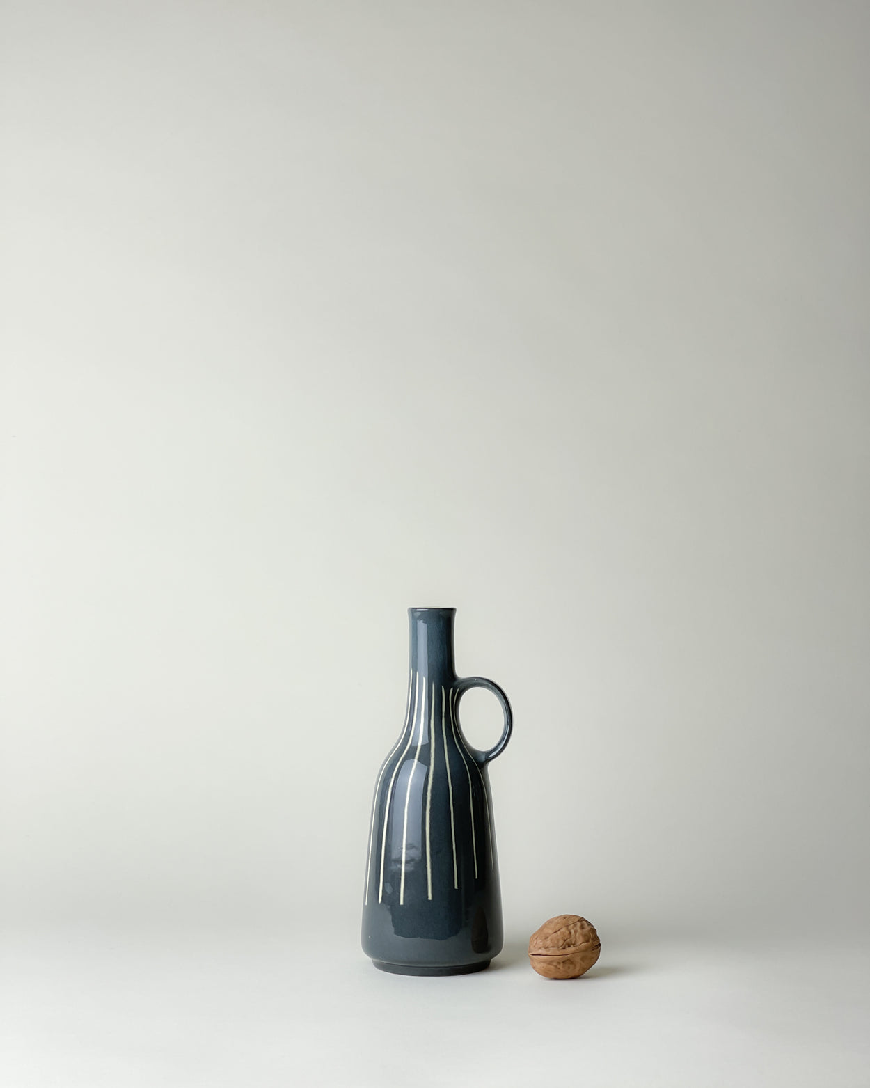 Elegant and slim eye catching Dumler&Breiden pitcher vase with beautiful blue/grey glossy glaze. West German pottery with 1342 18 mark on the bottom.
