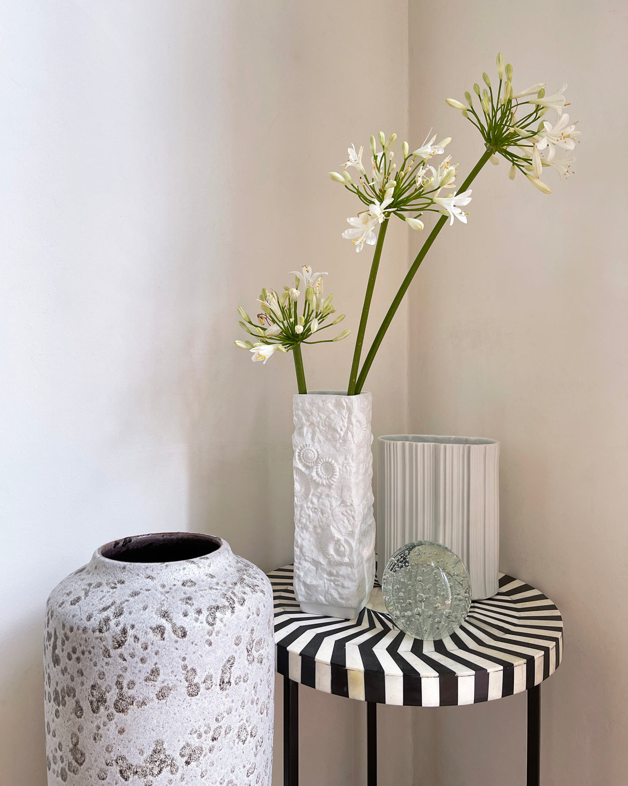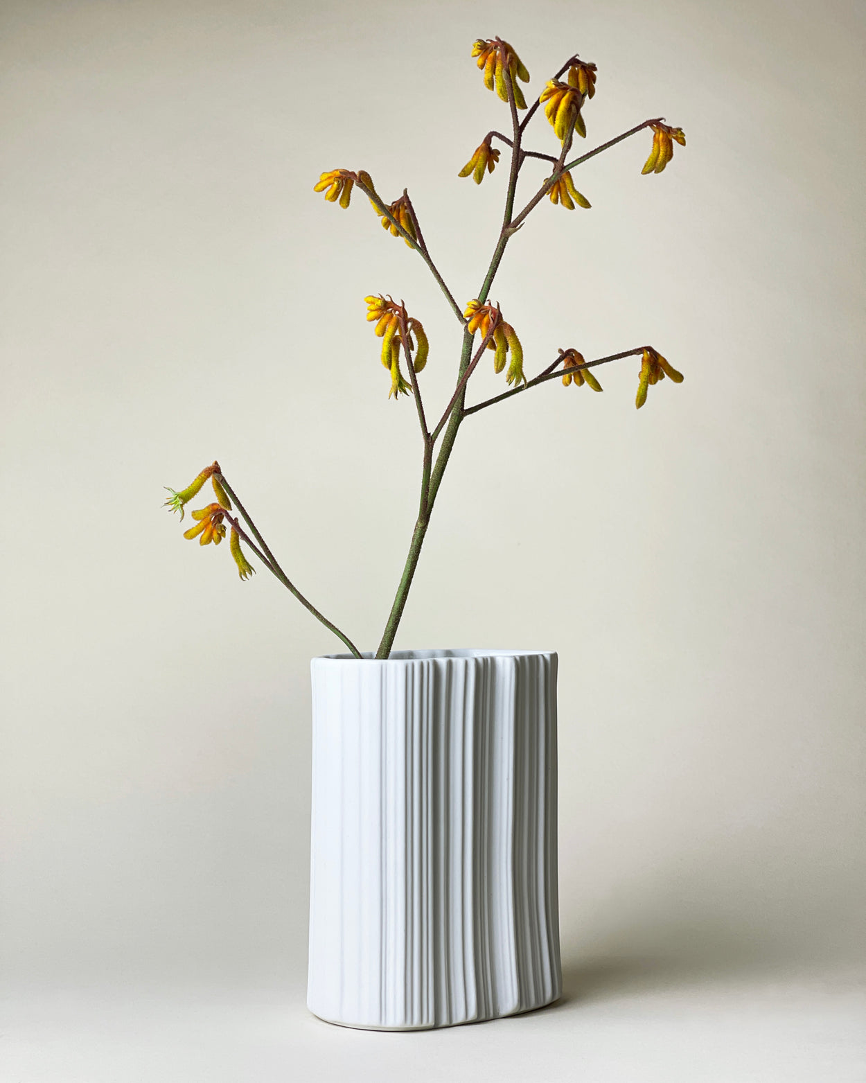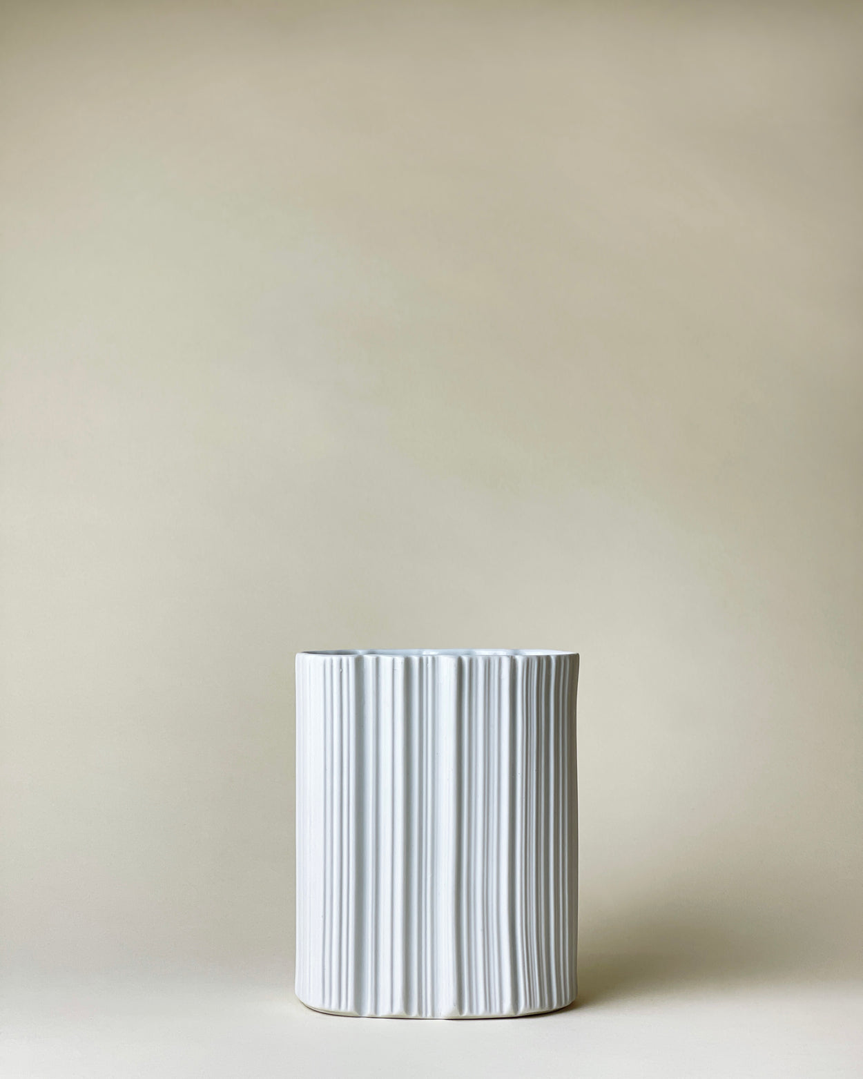 Fabulous oval cylinder vase from Naaman Artline Israel. Wonderful modernist bisque porcelain object with irregular line imprint made in the 1970s.