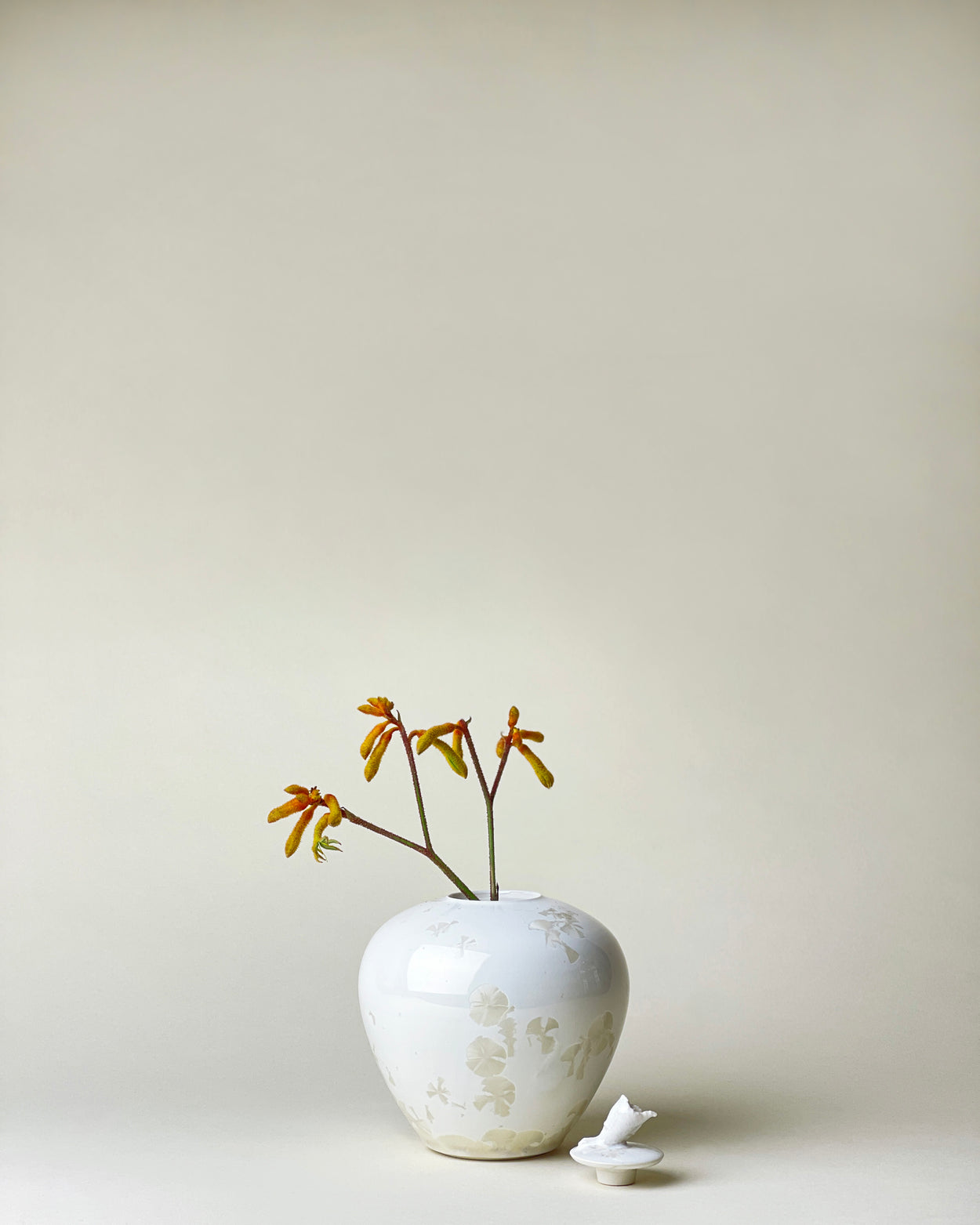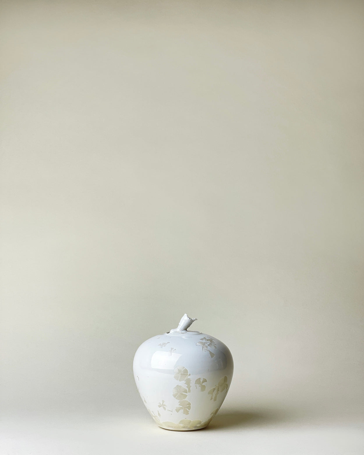 Elegant off-white crystalline glazed porcelain small jar with lid. Made by Dutch ceramic artist Ed Meissenberg.