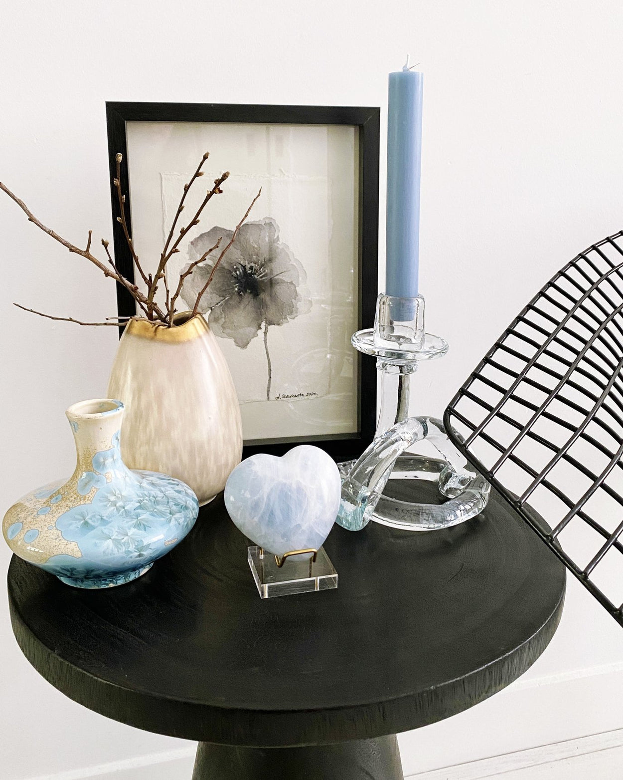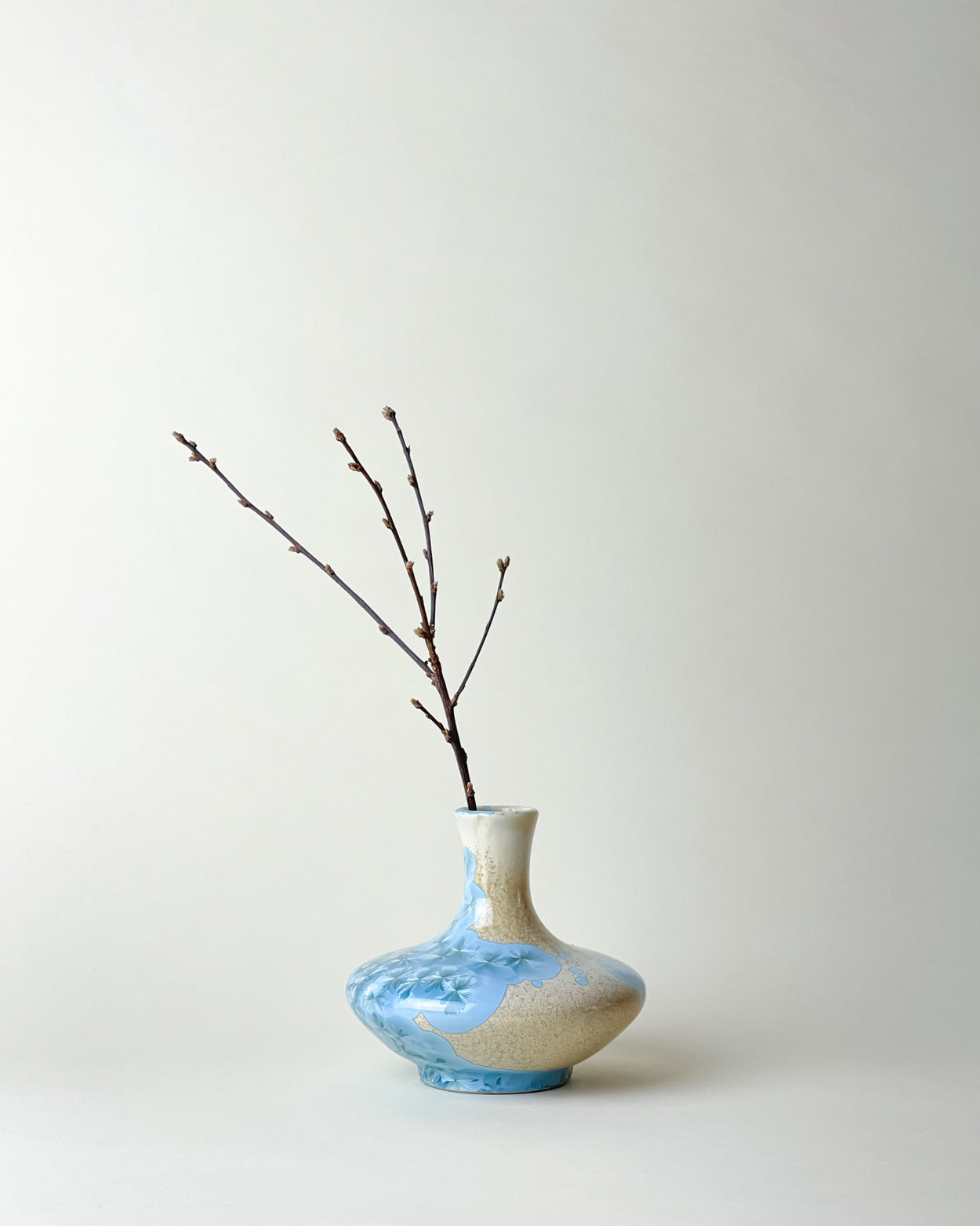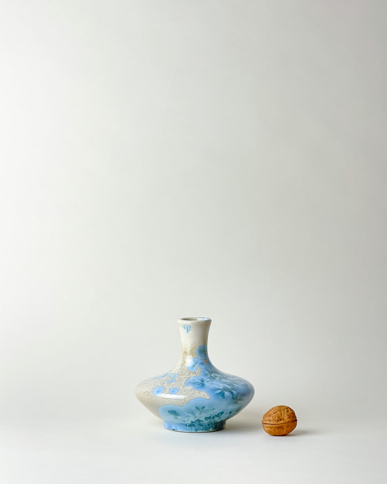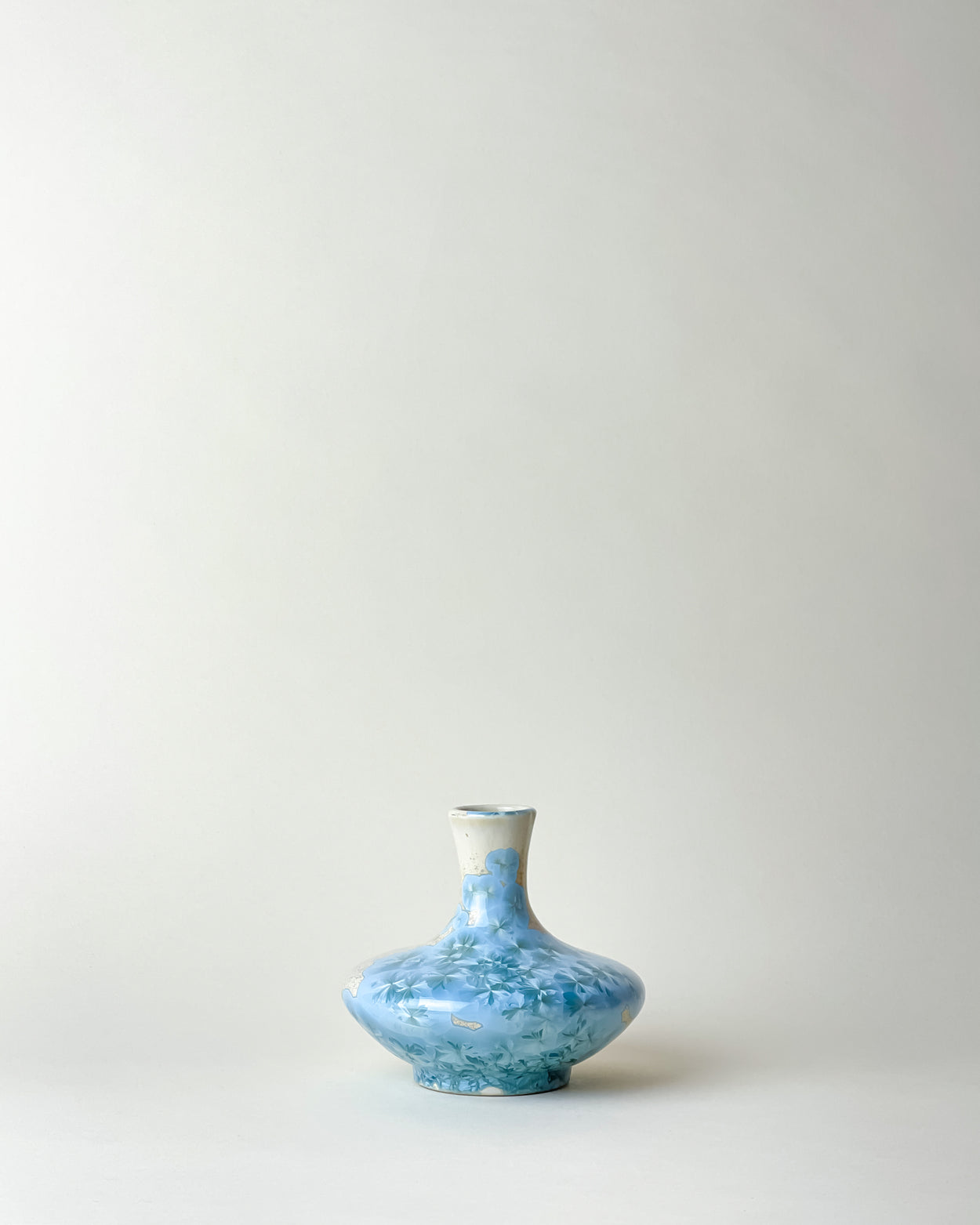 Stunning little bottle shaped vase in mesmerizing blue crystalline glaze. Any way you turn you see a different pattern. A true ceramic jewel.