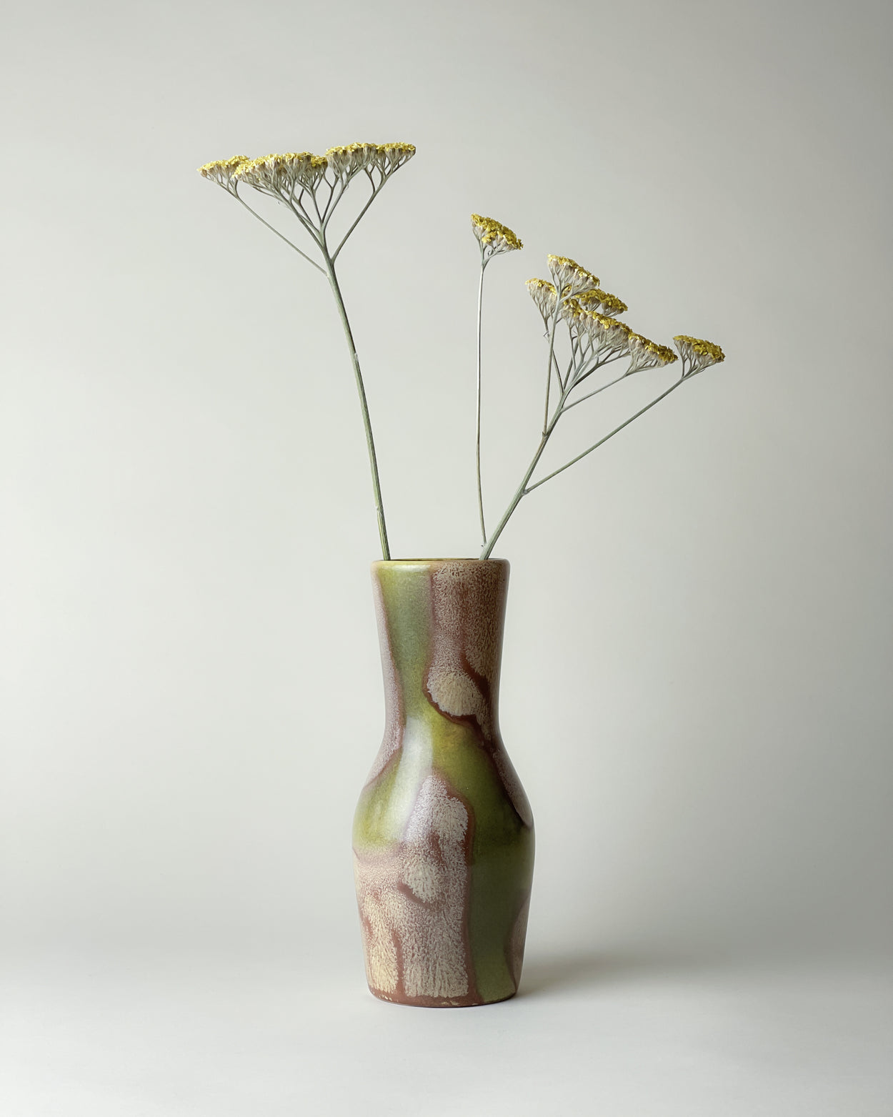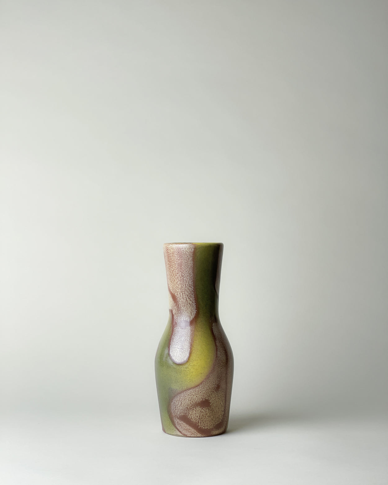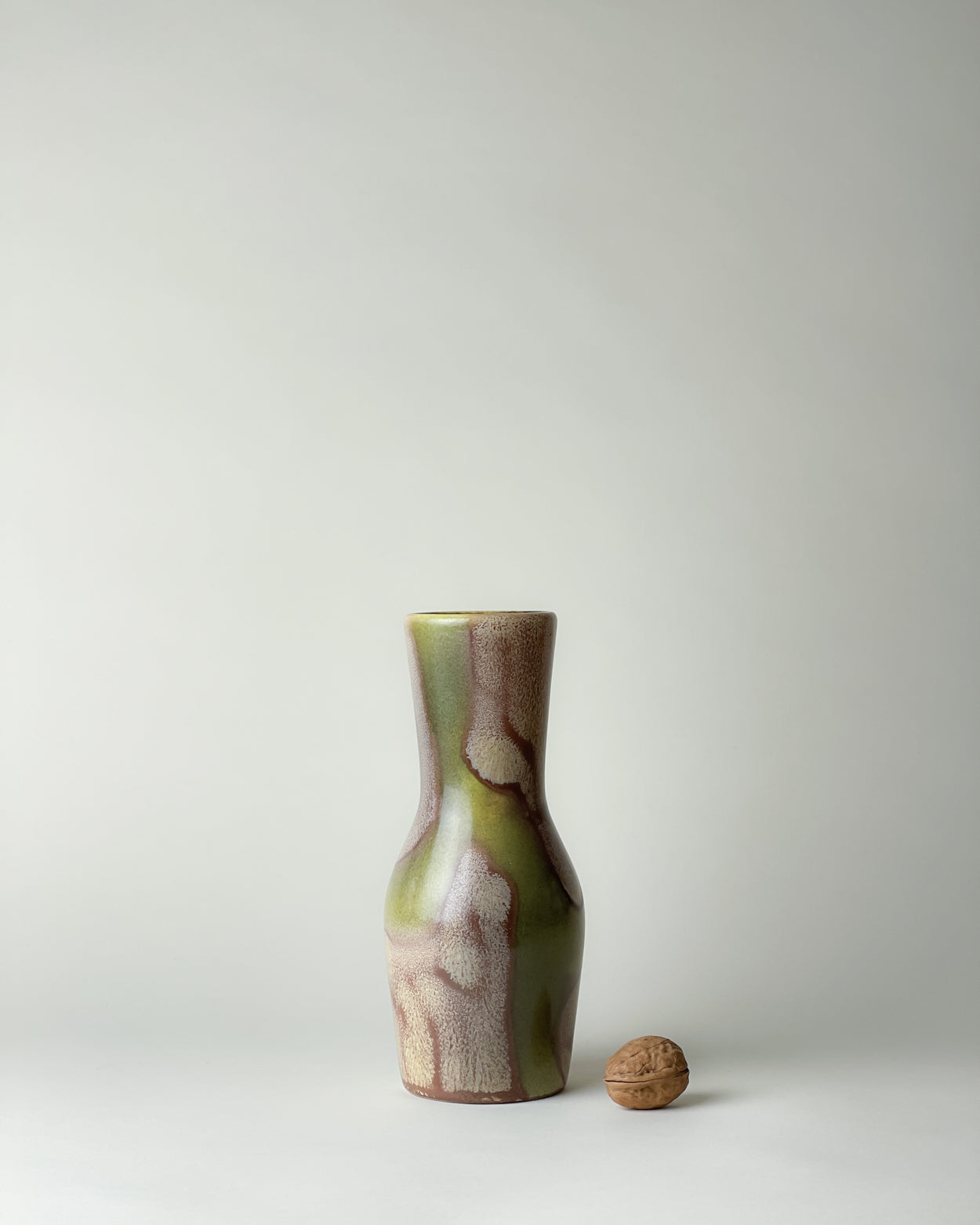 Charming midsize vase with wonderful smooth glossy glaze from Dumler and Breiden collection West Germany. Amazing earthy colours. Like Mud Flow over Green fields. Mark on the bottom 116/21.