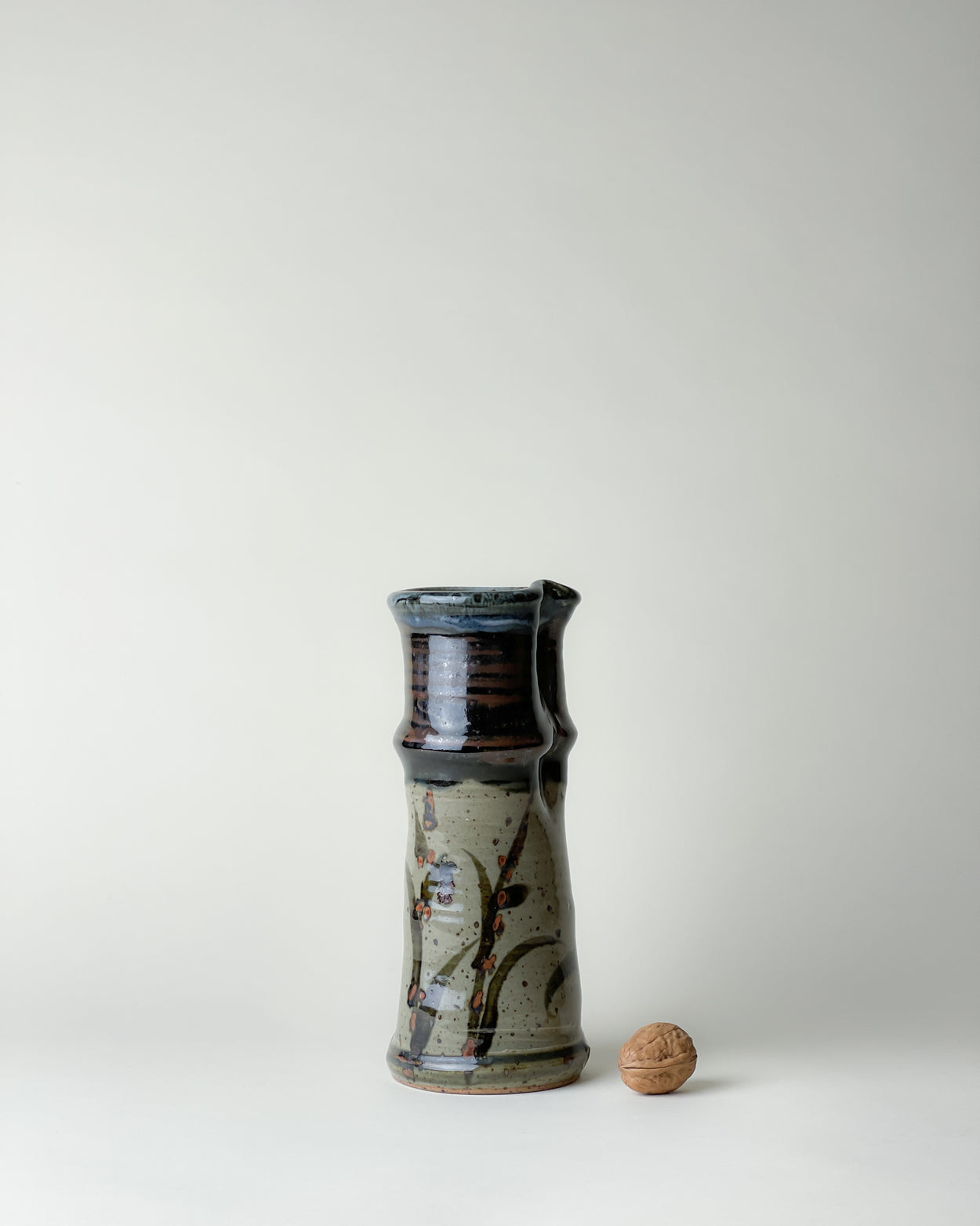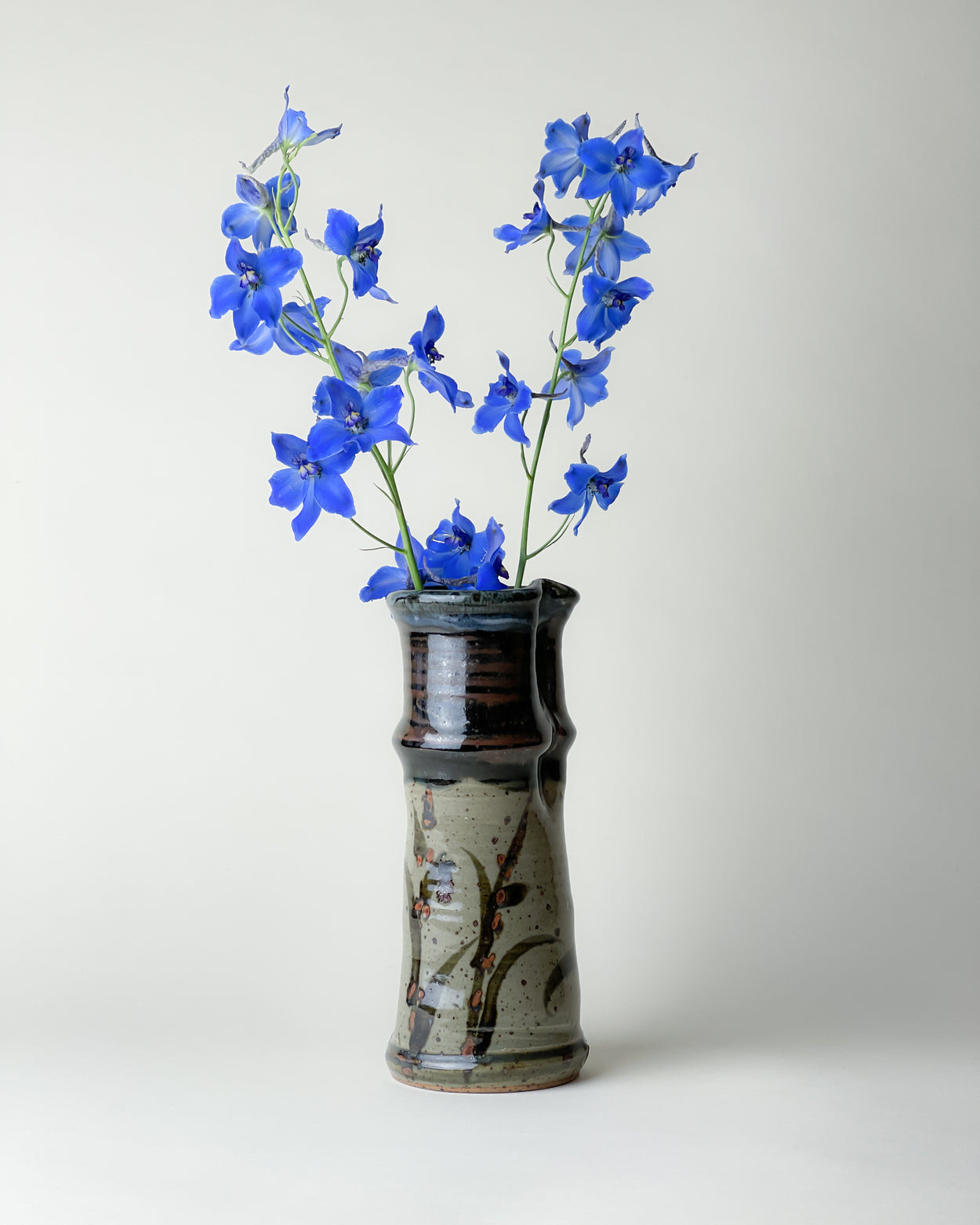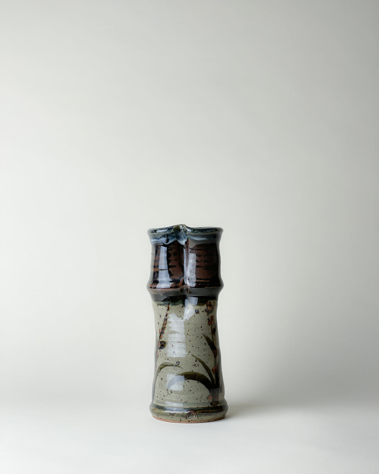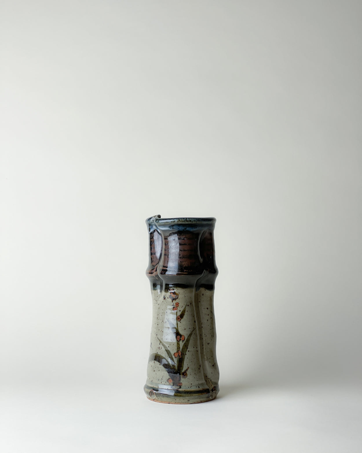 Unique handmade vase in natural earthy colours with Japanese floral decoration. Its irregular 'asian-bamboo-shape' makes it a real object of desire.