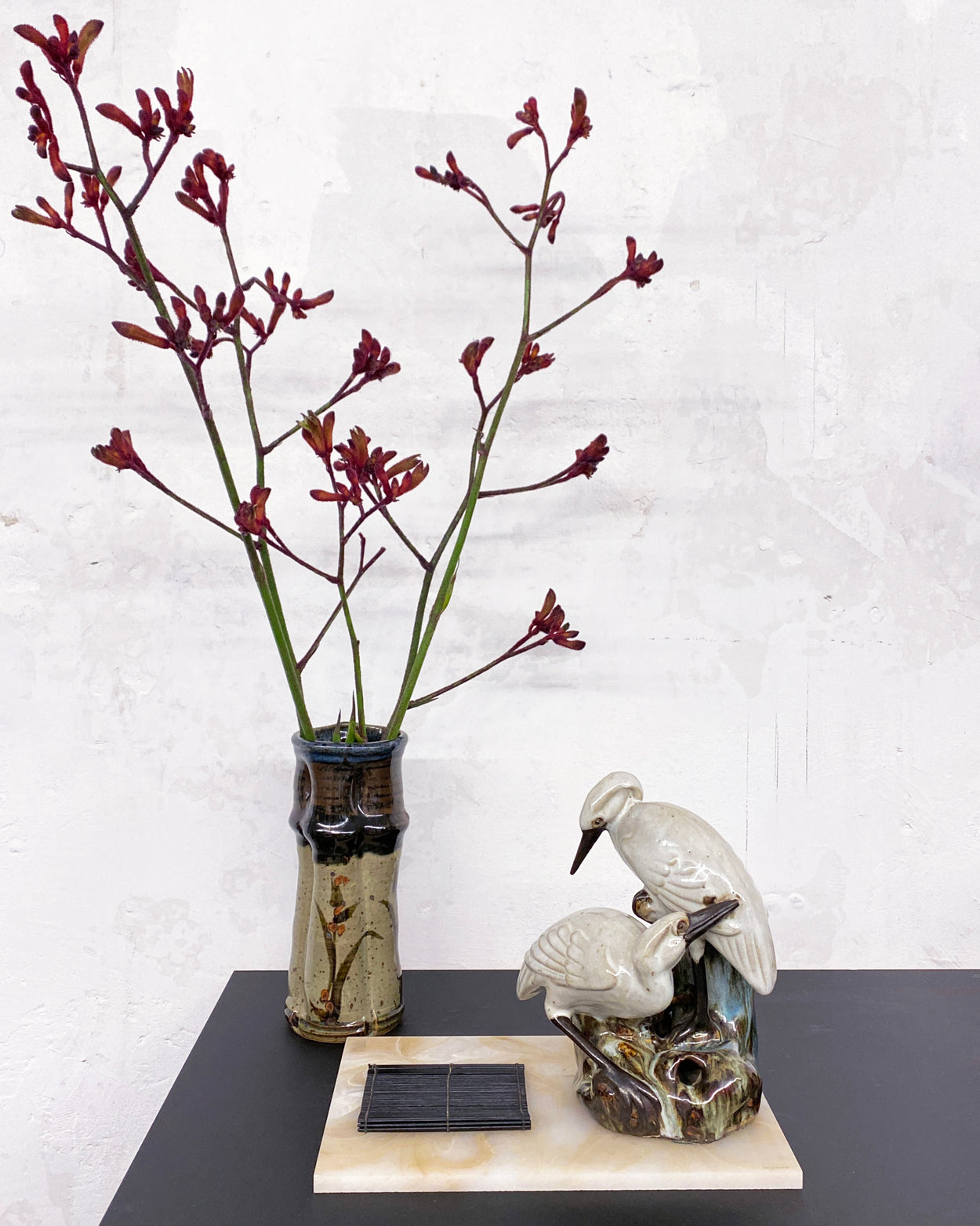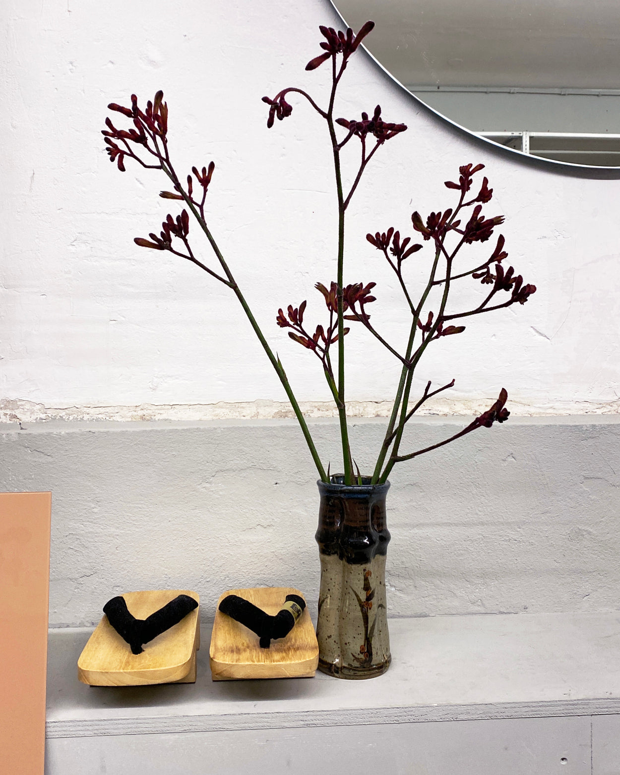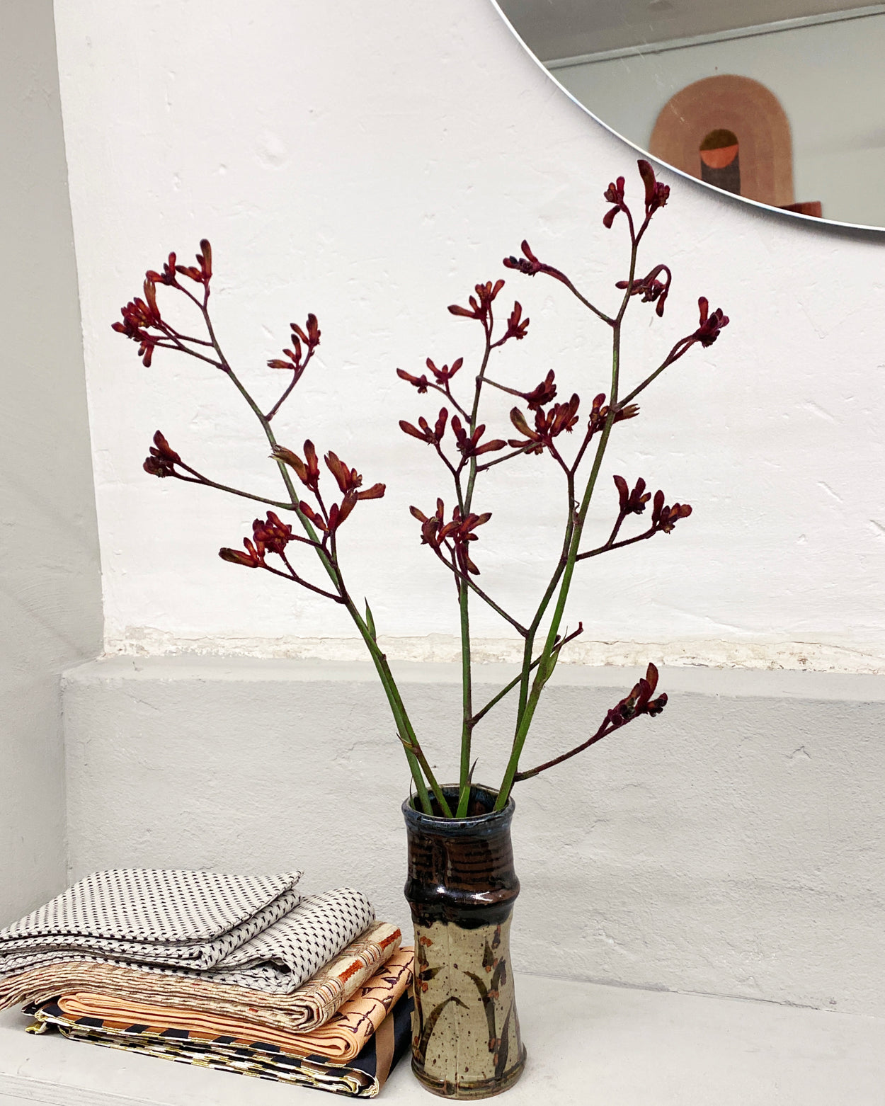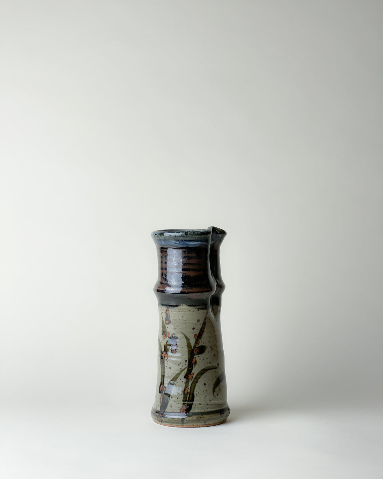 Unique handmade vase in natural earthy colours with Japanese floral decoration. Its irregular 'asian-bamboo-shape' makes it a real object of desire.