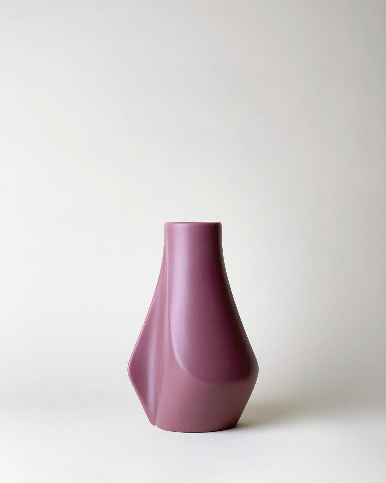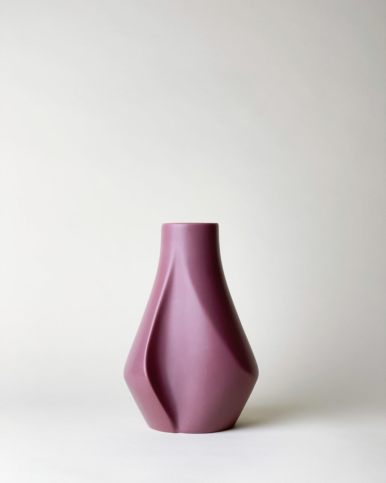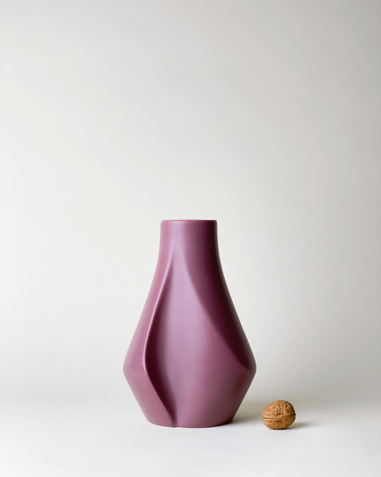Rare sculptural vase in wonderful matte plum coloured glaze. Organic flow shape. Absolute eye-catcher in your interior.