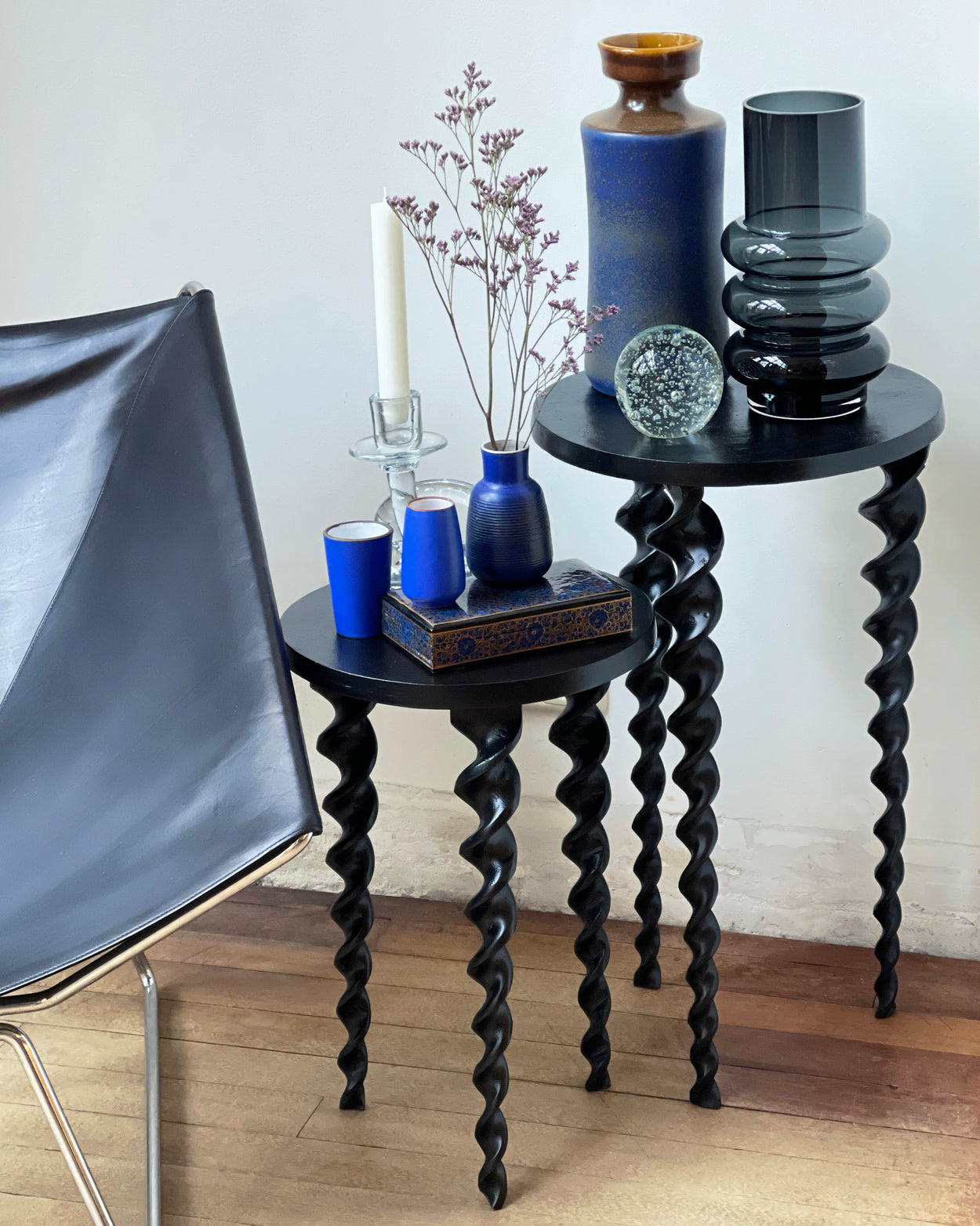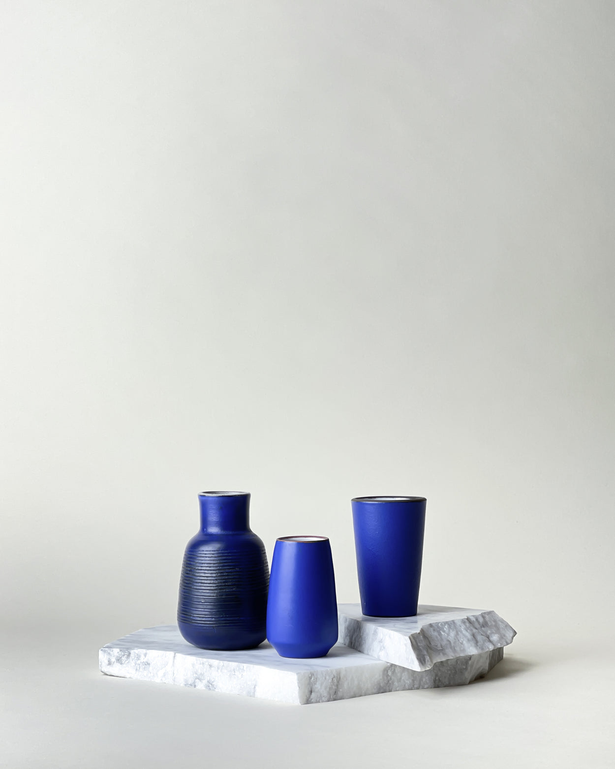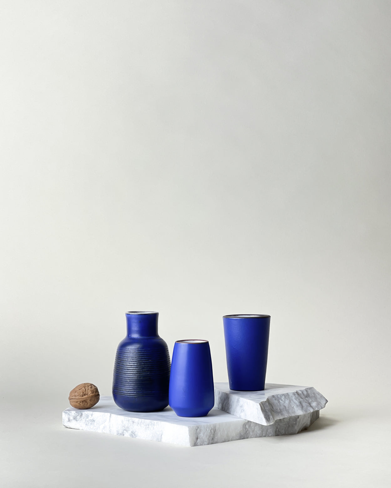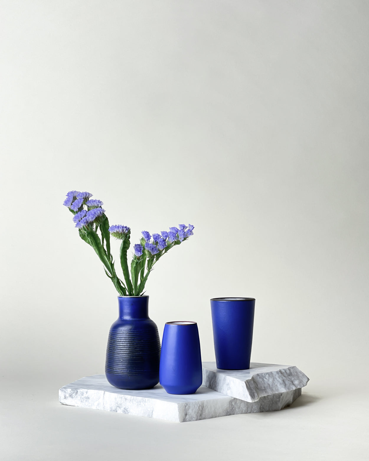 Wonderful set of Mini Vases. The larger dark blue vase has a nice ribbed texture. The smallest vase in the middle is smooth satin glazed. The one on the right had a matte feel. Together they make a playful styling corner. This handmade trio is a perfect gift to yourself or a loved one.