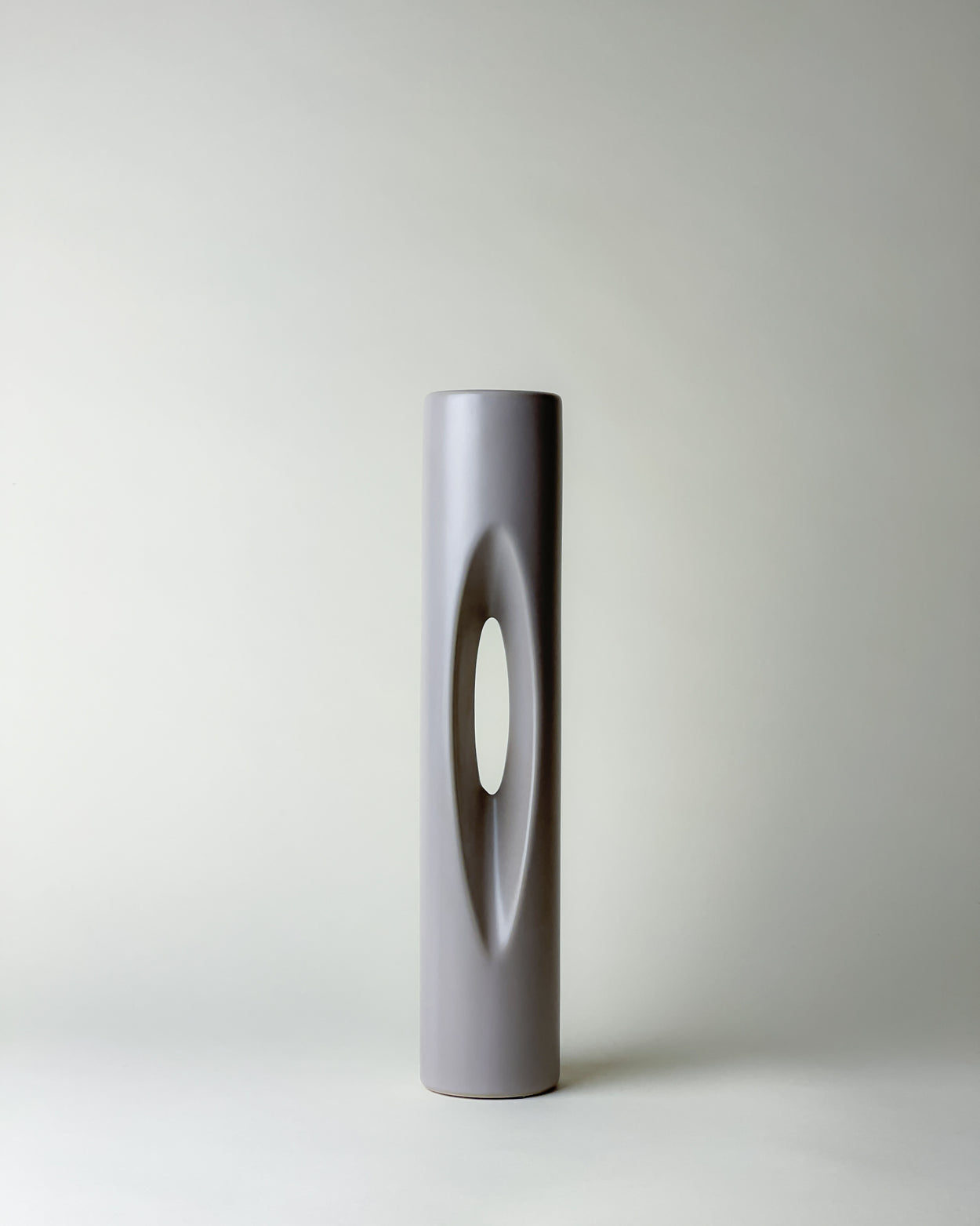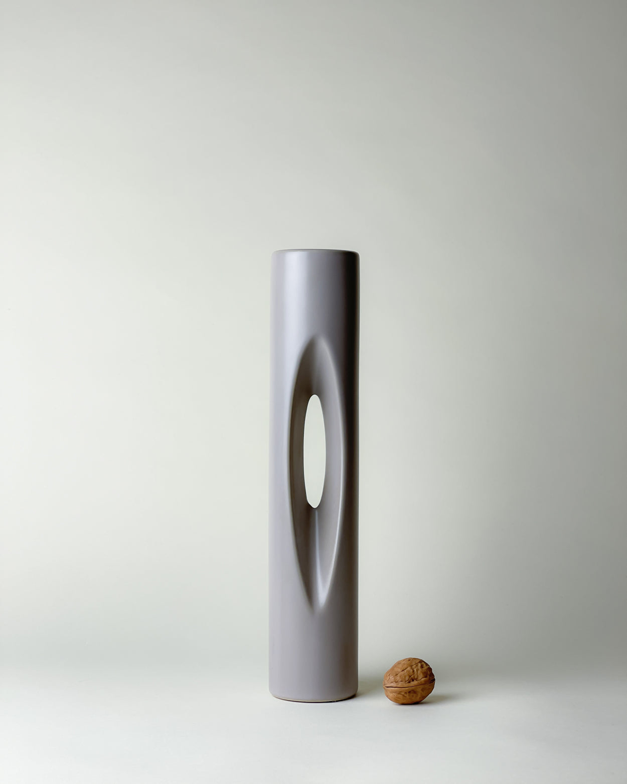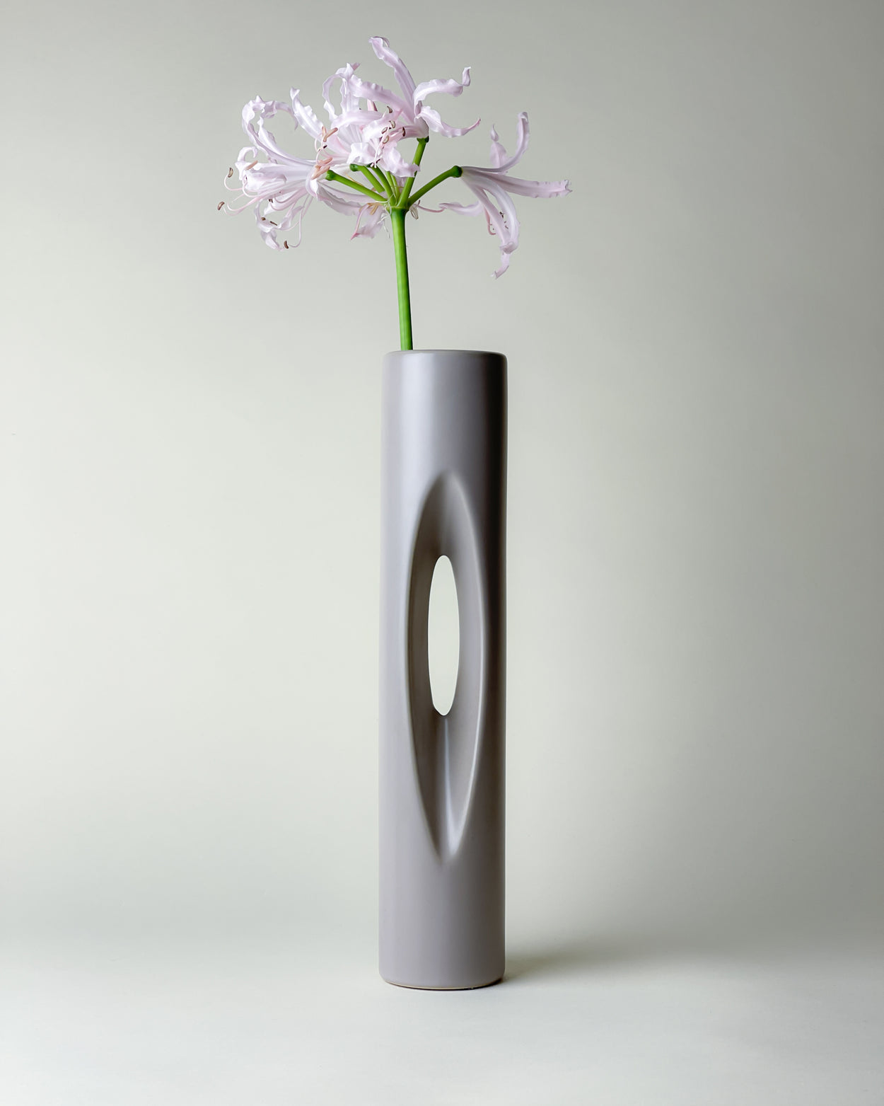 Wonderful tall vase with surprising 'open-eye-space' in smooth warm grey glaze. This unique sculptural decoration piece will elevate your interior instantly... with or without flowers.