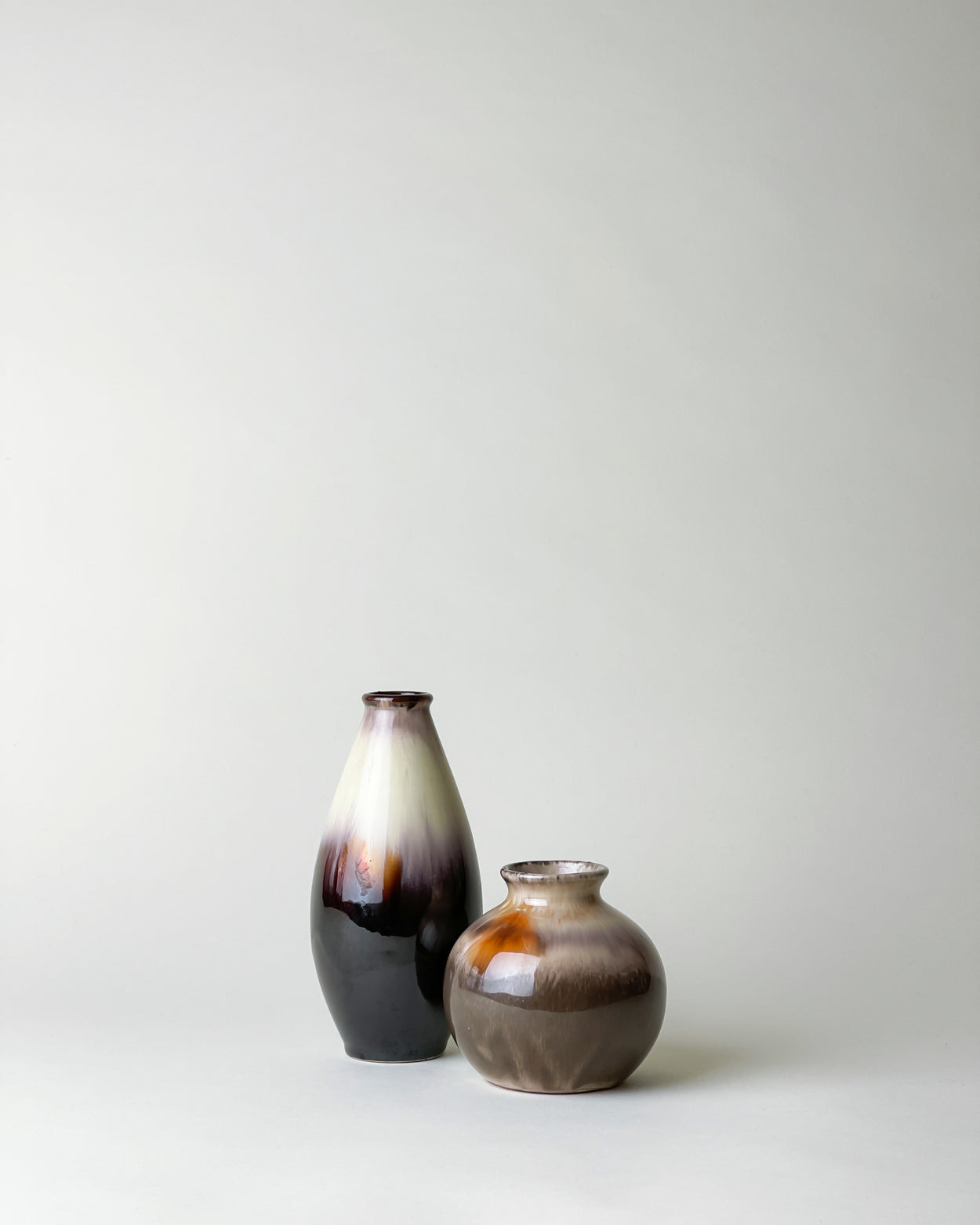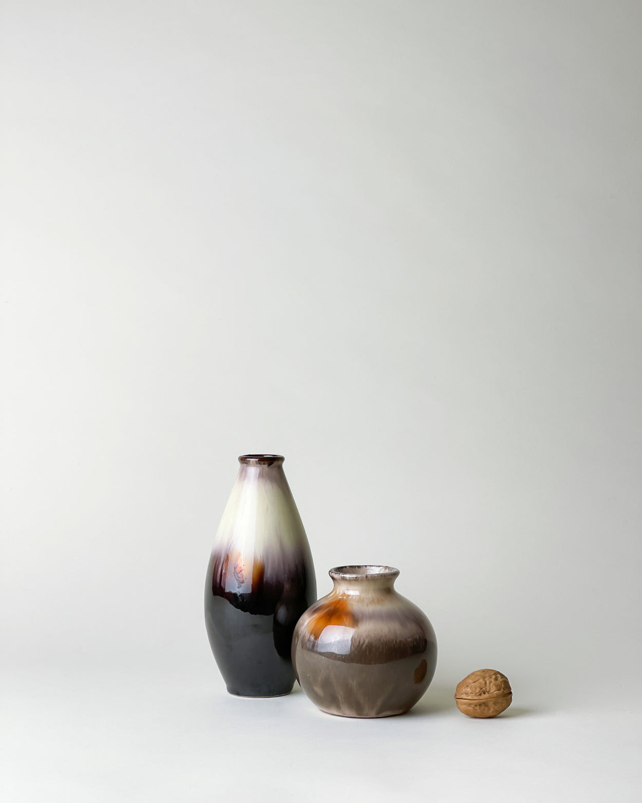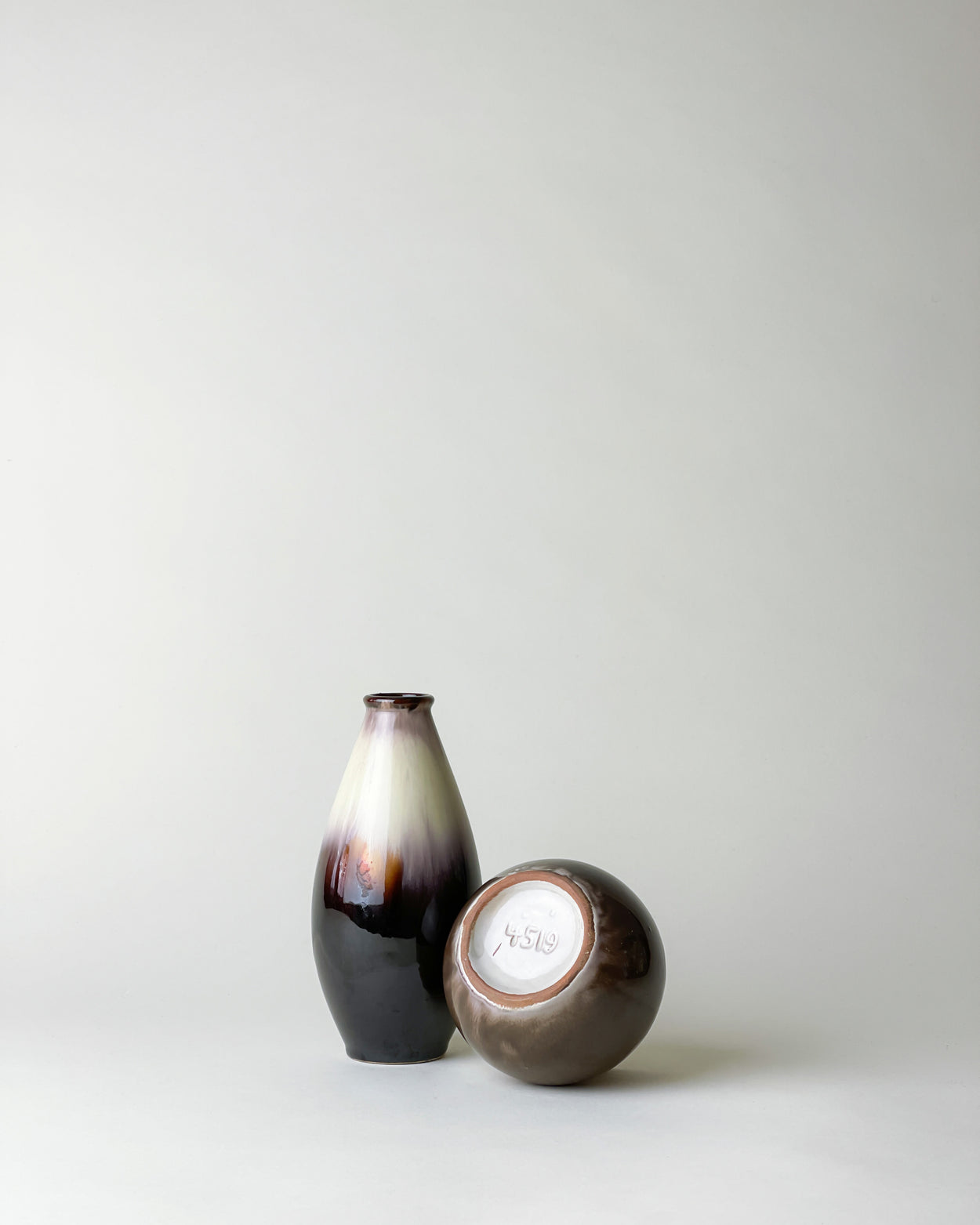 This Glossy Eye-Catching Duo, with smooth brown/cream and orange glaze, will brighten up your interior. The small one is marked on the bottom with 4519.