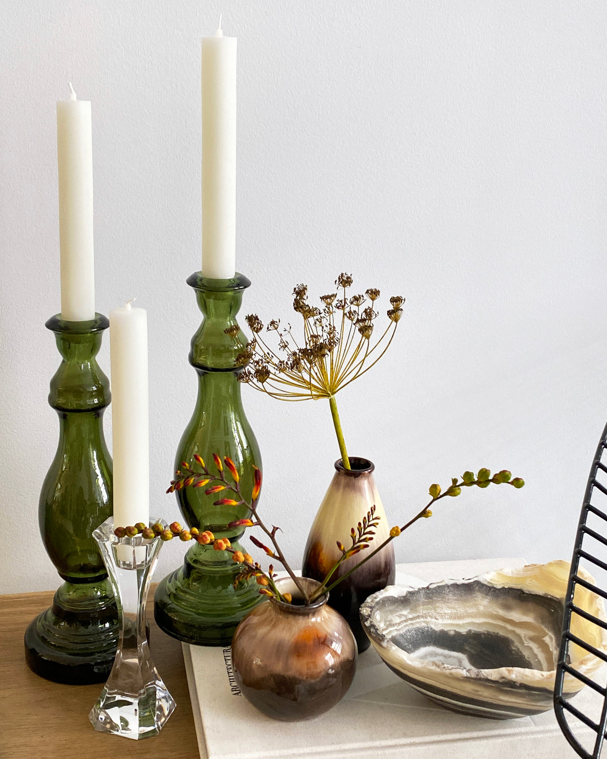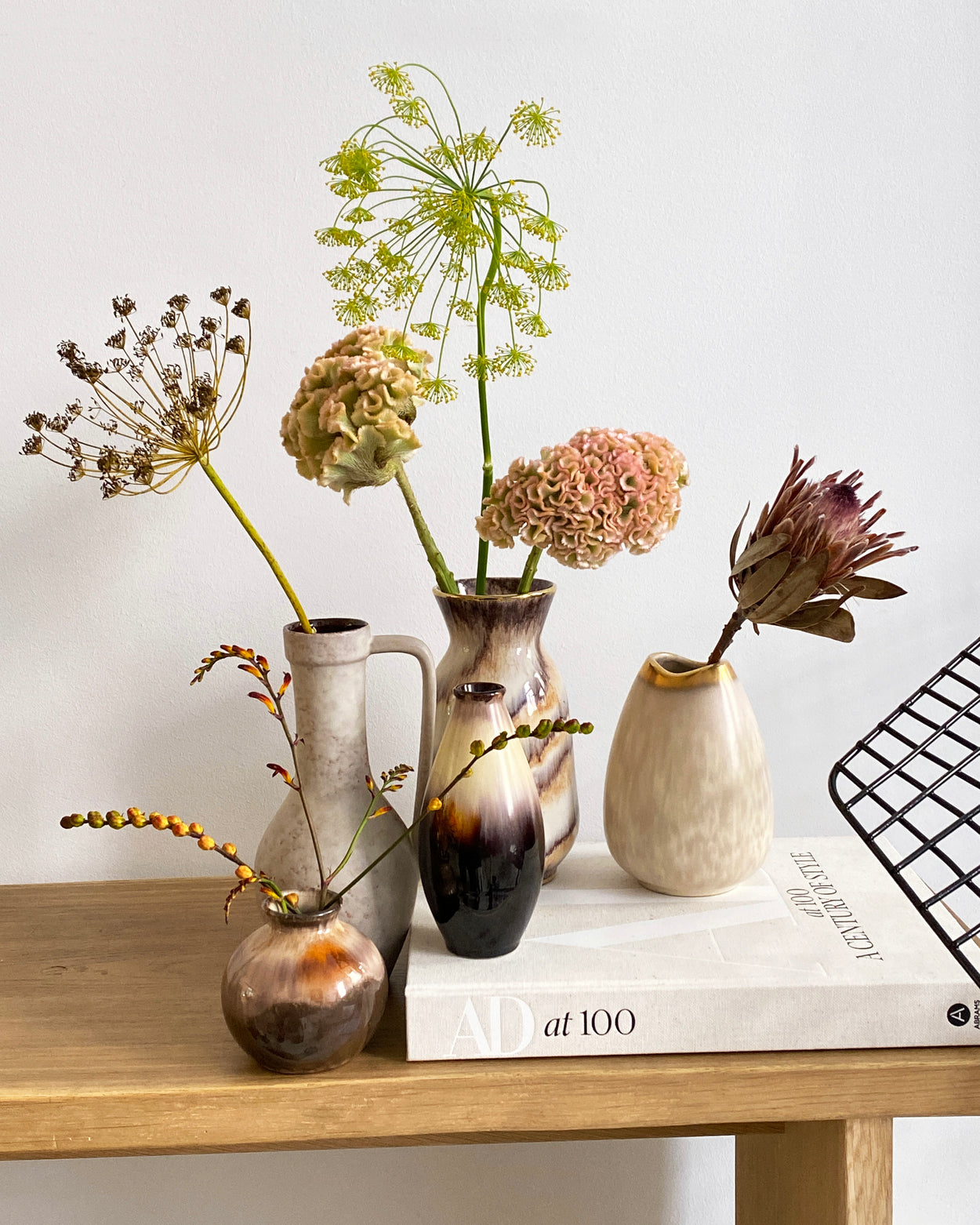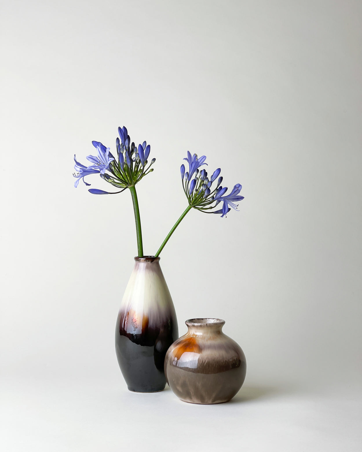 This Glossy Eye-Catching Duo, with smooth brown/cream and orange glaze, will brighten up your interior. The small one is marked on the bottom with 4519.