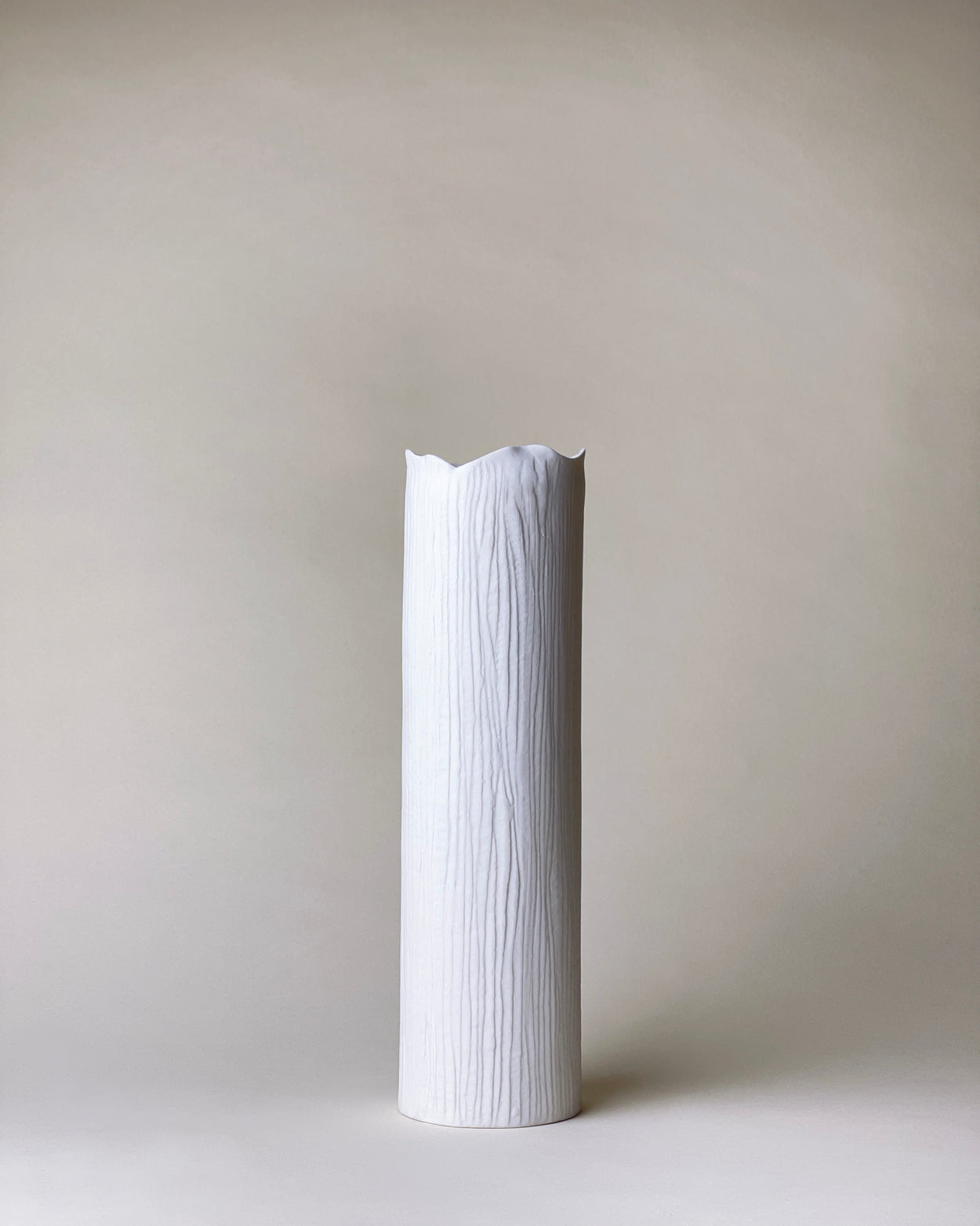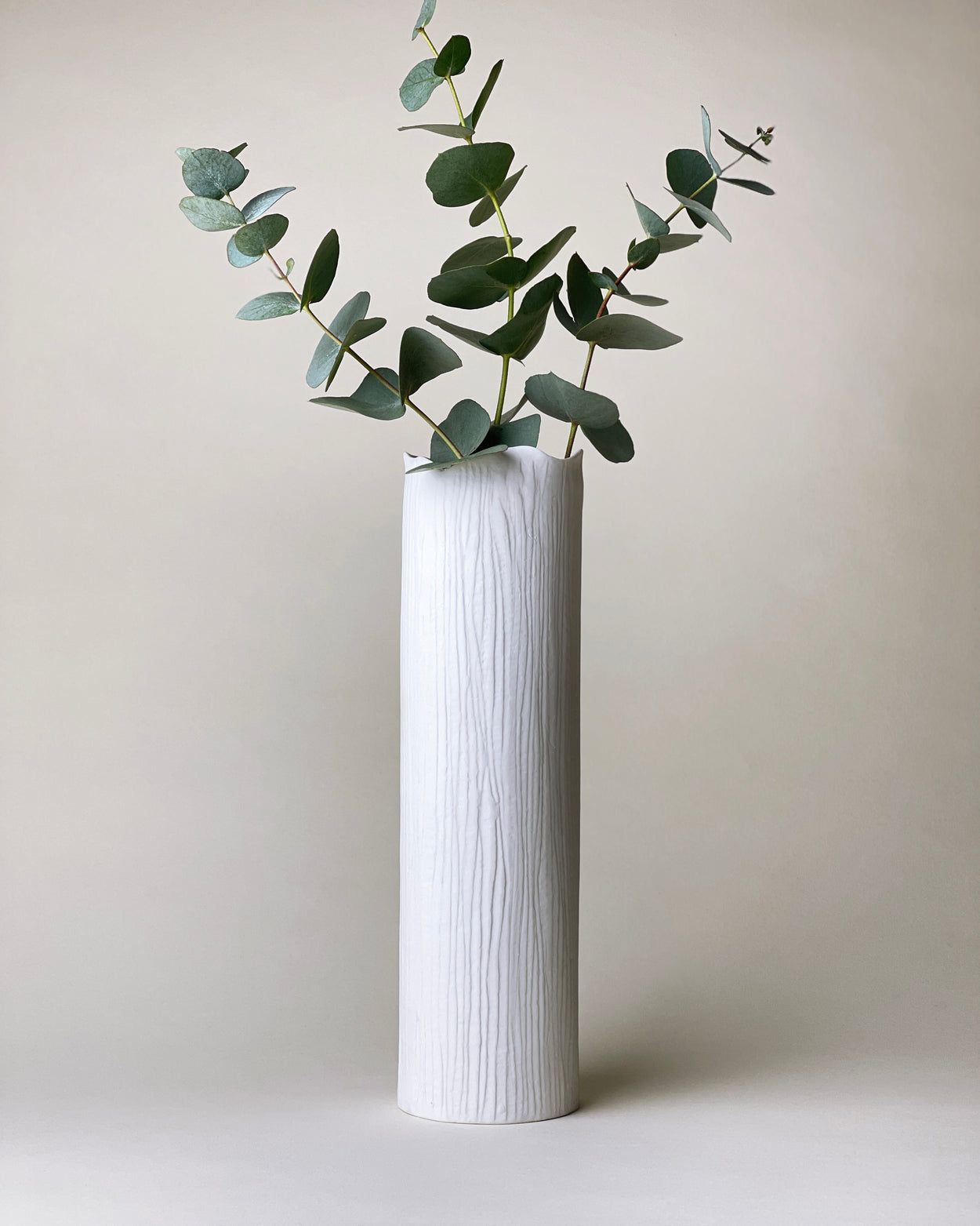 Exquisite powdery matte porcelain vase with elegant bark structure. Slender modern shape. Perfect white slyling object, with or without flowers.
