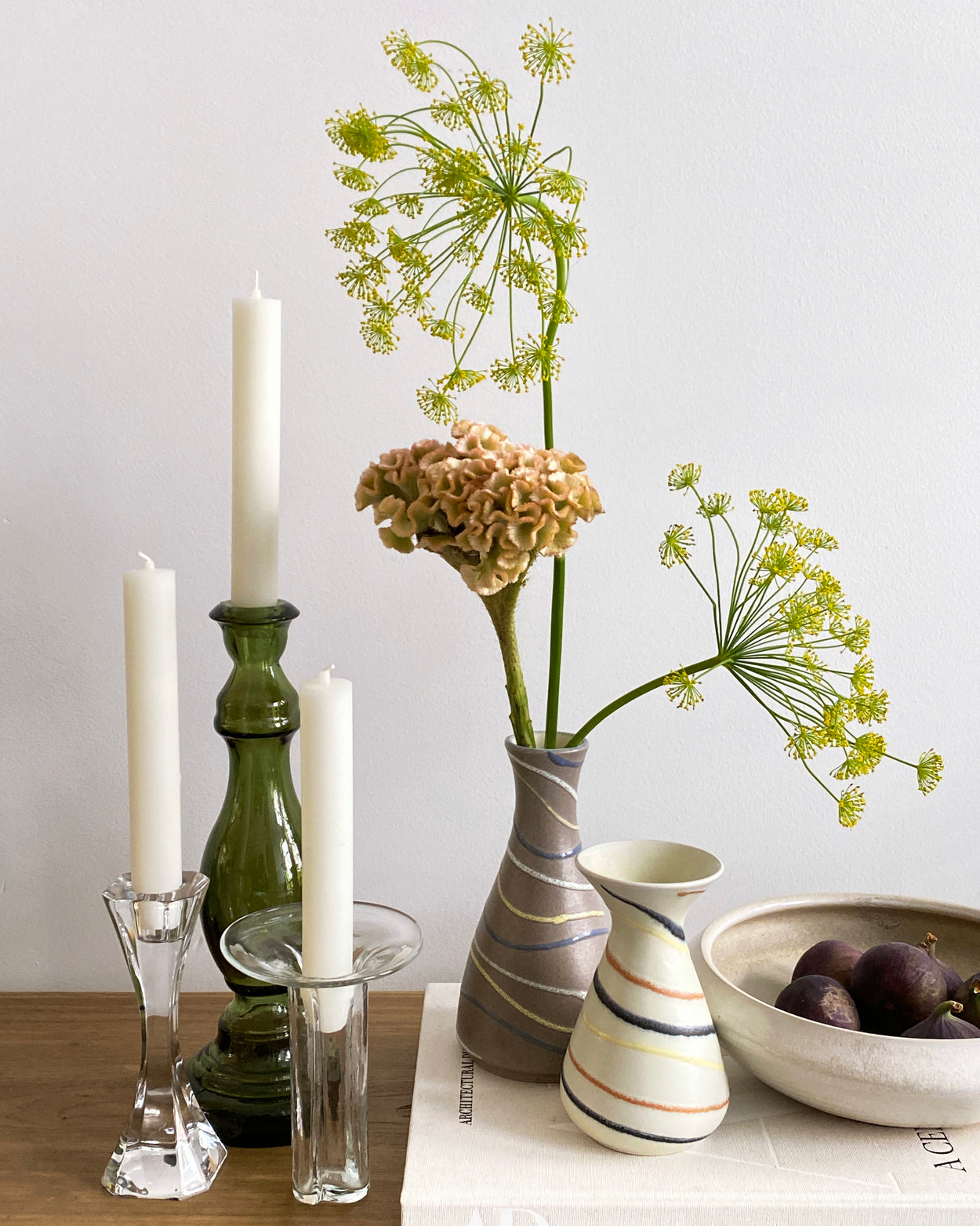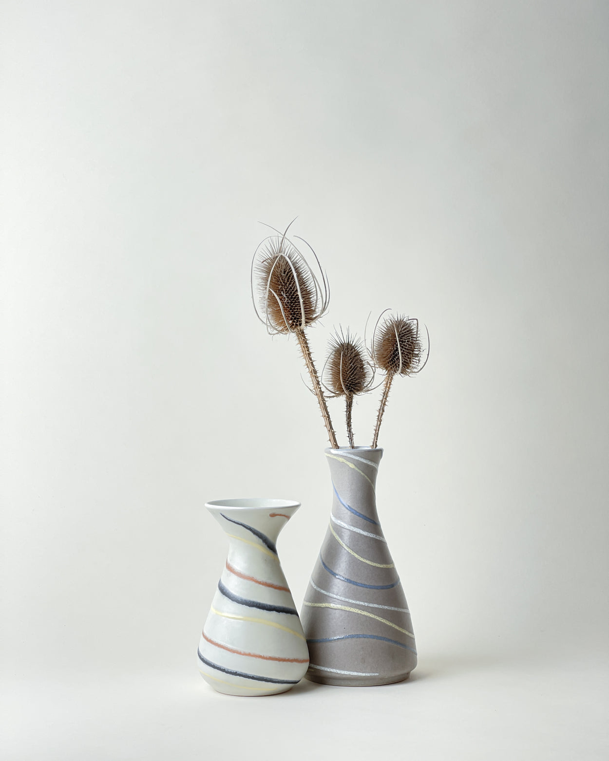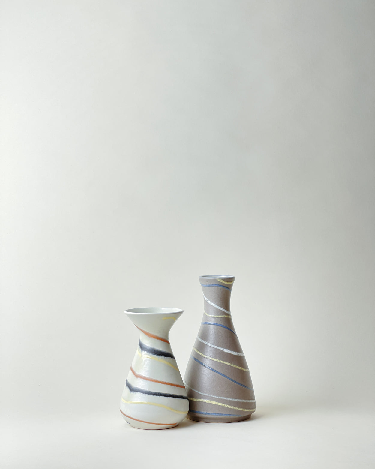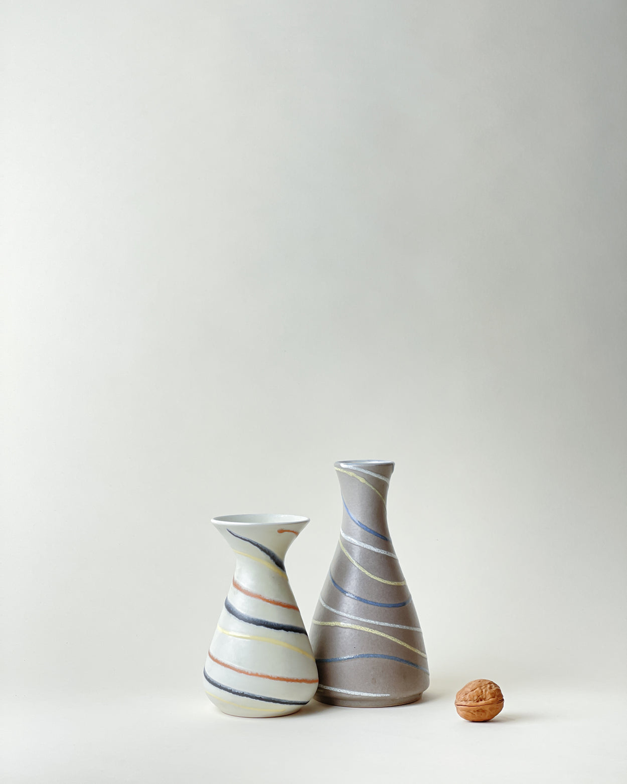 Lovely pair of Dümler Breiden vases. The funky irregular stripes in yellow, blue and rust make them playful styling objects. Made in the 1960s. Mark on the bottom 1293/15 & 1327/18